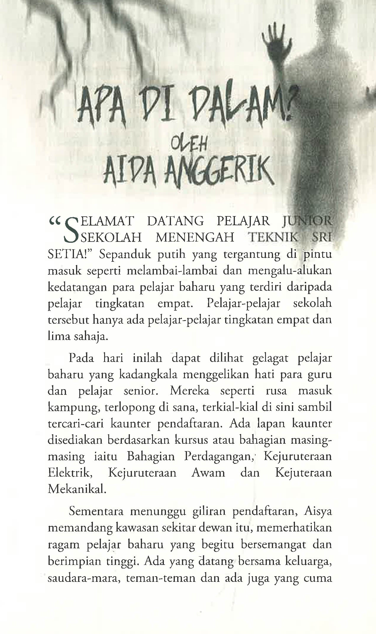 Ketika Lara sedang tekun menyental lantai, tiba-tiba bunyi air mengalir daripada pili kedengaran. Dia melepaskan keluhan kasar. Waktu dia sedang membersihkan tandas, ada pula orang yang suka-suka hati masuk ke dalam tandas itu. Dia berpaling ke arah singki untuk menegur, tetapi mulutnya terkunci apabila mendapati tiada sesiapa pun yang berada di situ. “Dah buka, tapi tak reti pula nak tutup,†rungut Lara lalu menutup pili air itu. Namun ketika dia berpaling untuk menyambung kerjanya yang tergendala tadi, pili air itu terbuka semula. Langkahnya terhenti. Lara mula berasa tidak sedap hati. Terbayang makhluk hodoh yang dia pernah nampak di dalam cermin tandas itu. Tiba-tiba air yang keluar daripada pili itu semakin deras. Semakin lama, air yang keluar berubah warna sehingga akhirnya menyerupai warna darah! Air di dalam singki itu terus melimpah dan membasahi lantai. Bagaikan tsunami, air darah itu kemudian menelan dirinya! * * * * * Tiga kisah yang berlaku dalam buku ini mungkin pernah benar-benar berlaku kepada kawan kepada kawan kita, atau sepupu kepada kawan kepada kawan kita. Yakinlah, alam ghaib itu wujud. Ia sentiasa menjadi misteri kepada kita, dan rahsia kepada orang-orang yang dianugerahkan Tuhan untuk melihatnya.