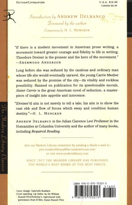 Selected by the Modern Library as one of the 100 best novels of all time Theodore Dreiser is a man who, with the passage of time, is bound to loom larger and larger in the awakening aesthetic consciousness of America. Among all of our prose writers he is one of the few men of whom it may be said that he has . . . never been a trickster. If there is a modern movement in American prose writing, a movement toward greater courage and fidelity to life in writing, Theodore Dreiser is the pioneer and the hero of the movement.--Sherwood Anderson Long before she was seduced by the cautious and ordinary man whose life she would unravel with no malice and only intermittent interest, the young Carrie Meeber was seduced by the promise of the city--its vitality and reckless possibility, the thrill of material luxury, and the spectacle of power and industry. Banned on publication for its questionable morals, Sister Carrie is the great American novel of seduction, a masterpiece of insight into appetite and innocence. Such a novel as Sister Carrie stands quite outside the brief traffic of the customary stage. It leaves behind an inescapable impression of bigness, of epic sweep and dignity. It is not a mere story, not a novel in the customary American meaning of the word; it is at once a psalm of life and a criticism of life. . . . [Dreiser's] aim is not merely to tell a tale; his aim is to show the vast ebb and flow of forces which sway and condition human destiny. The thing he seeks to do is to stir, to awaken, to move. One does not arise from such a book as Sister Carrie with a smirk of satisfaction; one leaves it infinitely touched.--H. L. Mencken