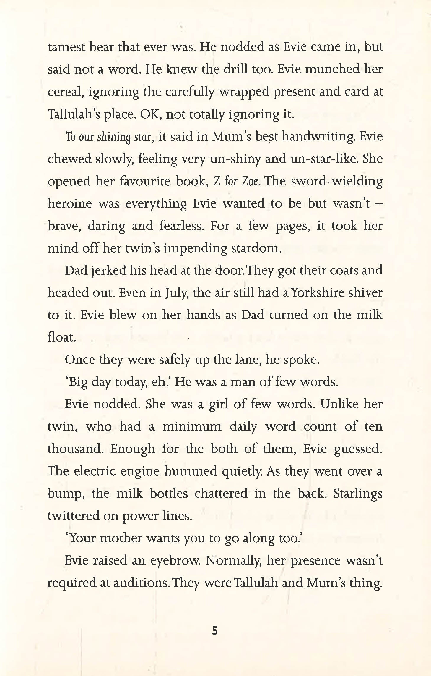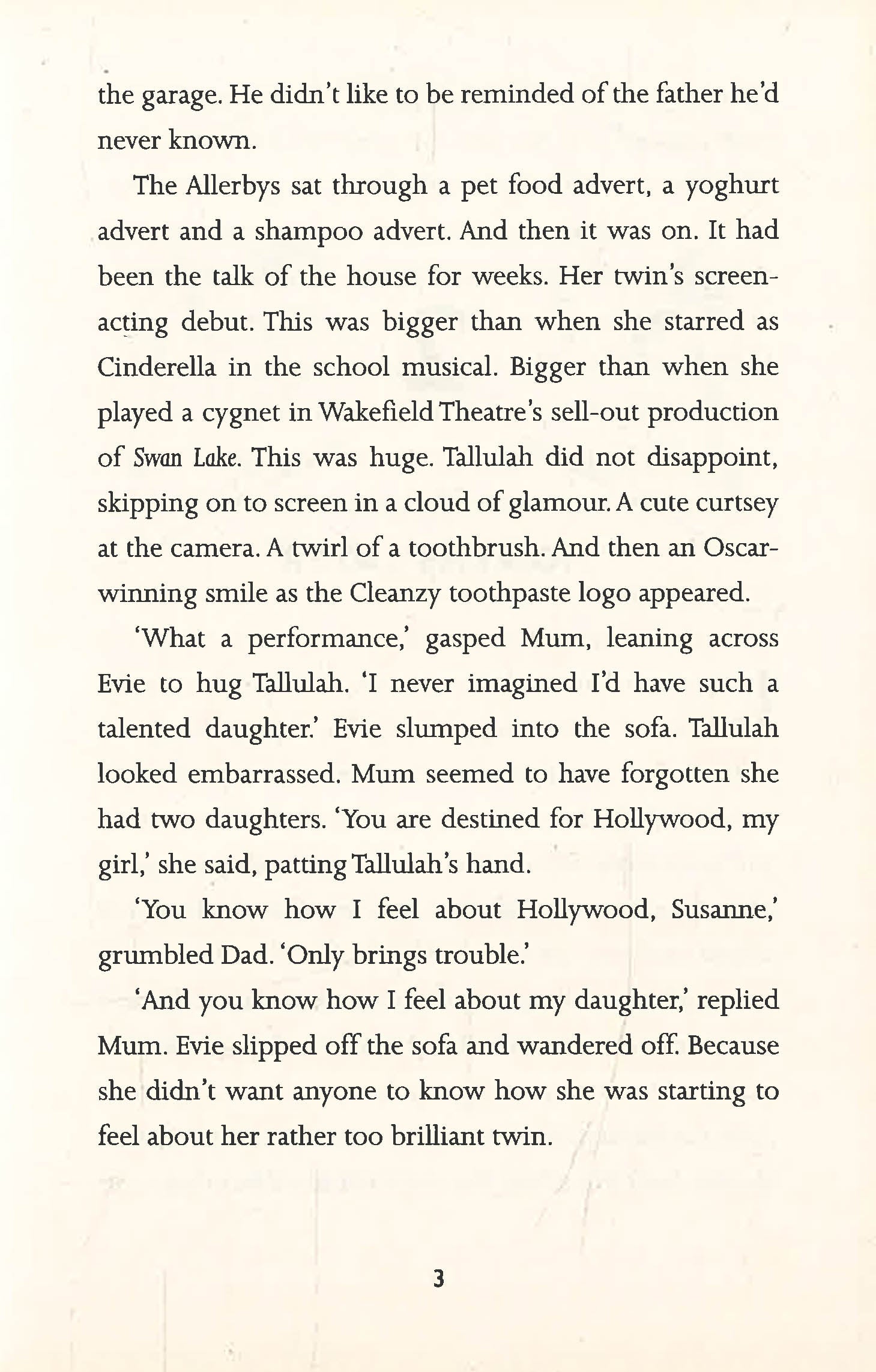 Evie is forever crossing swords with her twin. While she practices her after-school fencing, Tallulah is winning movie auditions.