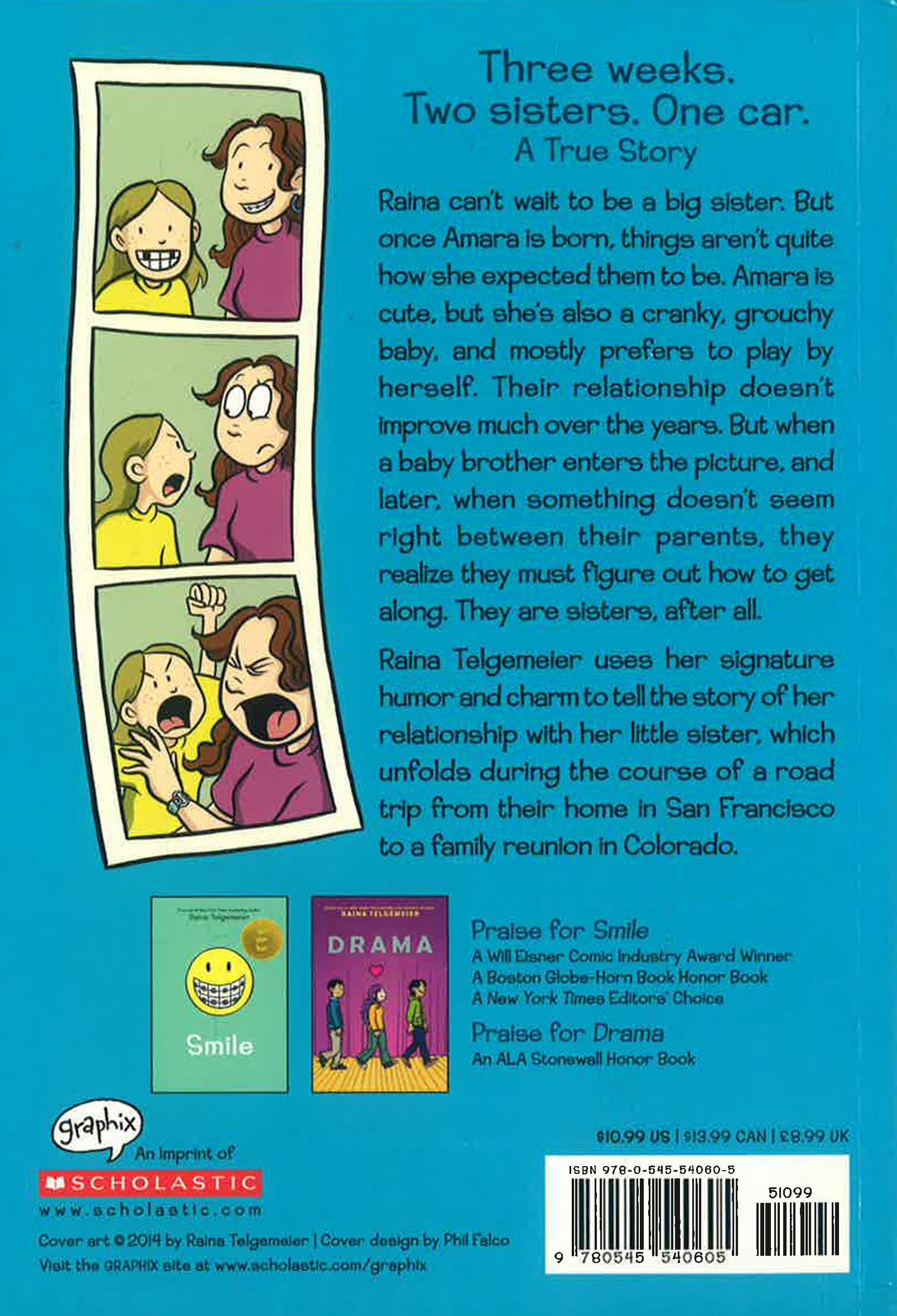 The companion to Raina Telgemeier's bestselling graphic memoir, SMILE. Raina can't wait to be a big sister, but once Amara is born she realizes things won't be quite what she had expected...or hoped. Despite Amara's cuteness, she is a cranky, grouchy baby and mostly prefers to play by herself. Their relationship doesn't improve much over the years but when a baby brother enters the picture and their parents' relationship starts to struggle, they realize they must figure out how to get along. They are sisters, after all.