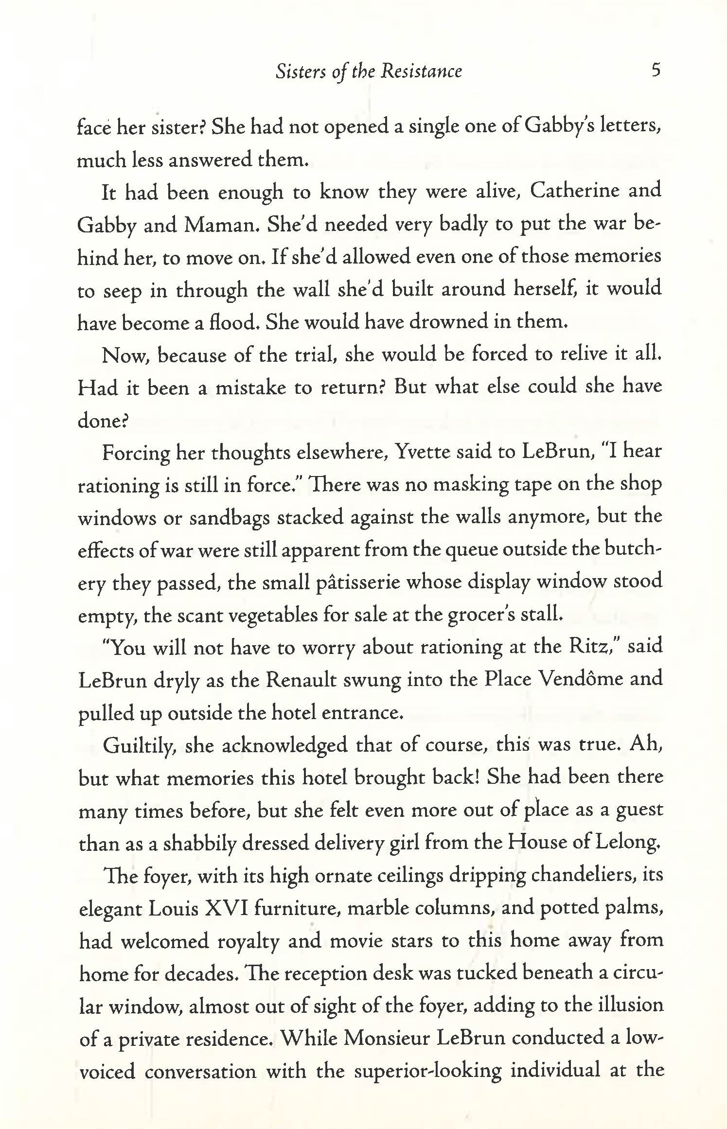 Then they are both recruited into the Resistance by Catherine Dior and swept into a treacherous world of spies, fugitives, and intrigue. While Gabby risks everything for the man she is hiding from the Nazis, Yvette must decide whether to trust an enigmatic diplomat who seems to have guessed her secret. As the threat of betrayal draws ever-closer, one slip could mean the deaths of many, and both sisters must make choices they might regret.