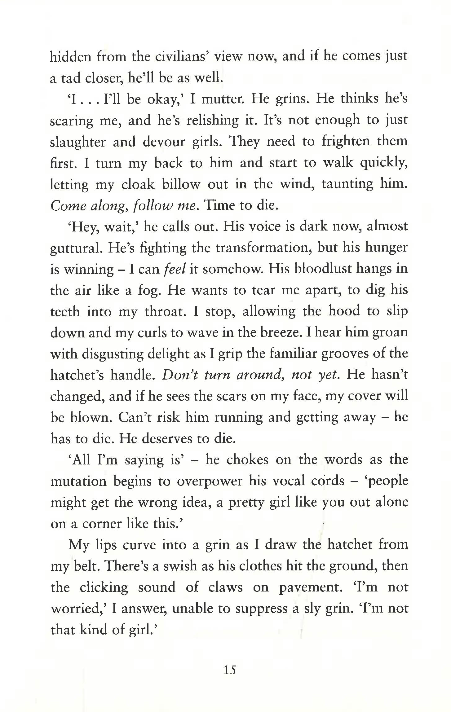 The story of Scarlett and Rosie March, two highly-skilled sisters who have been hunting Fenris (werewolves) - who prey on teen girls - since Scarlett lost her eye years ago while defending Rosie in an attack. Scarlett lives to destroy the Fenris, and she and Rosie lure them in with red cloaks (a colour the wolves can't resist), though Rosie hunts more out of debt to her sister than drive. But things seem to be changing. The wolves are getting stronger and harder to fight, and there has been a rash of news reports about countless teenage girls being brutally murdered in the city. Scarlett and Rosie soon discover the truth: wolves are banding together in search of a Potential Fenris - a man tainted by the pack but not yet fully changed. Desperate to find the Potential to use him as bait for a massive werewolf extermination, the sisters move to the city with Silas, a young woodsman and long time family friend who is deadly with an axe. Meanwhile, Rosie finds herself drawn to Silas and the bond they share not only drives the sisters apart, but could destroy all they've worked for.