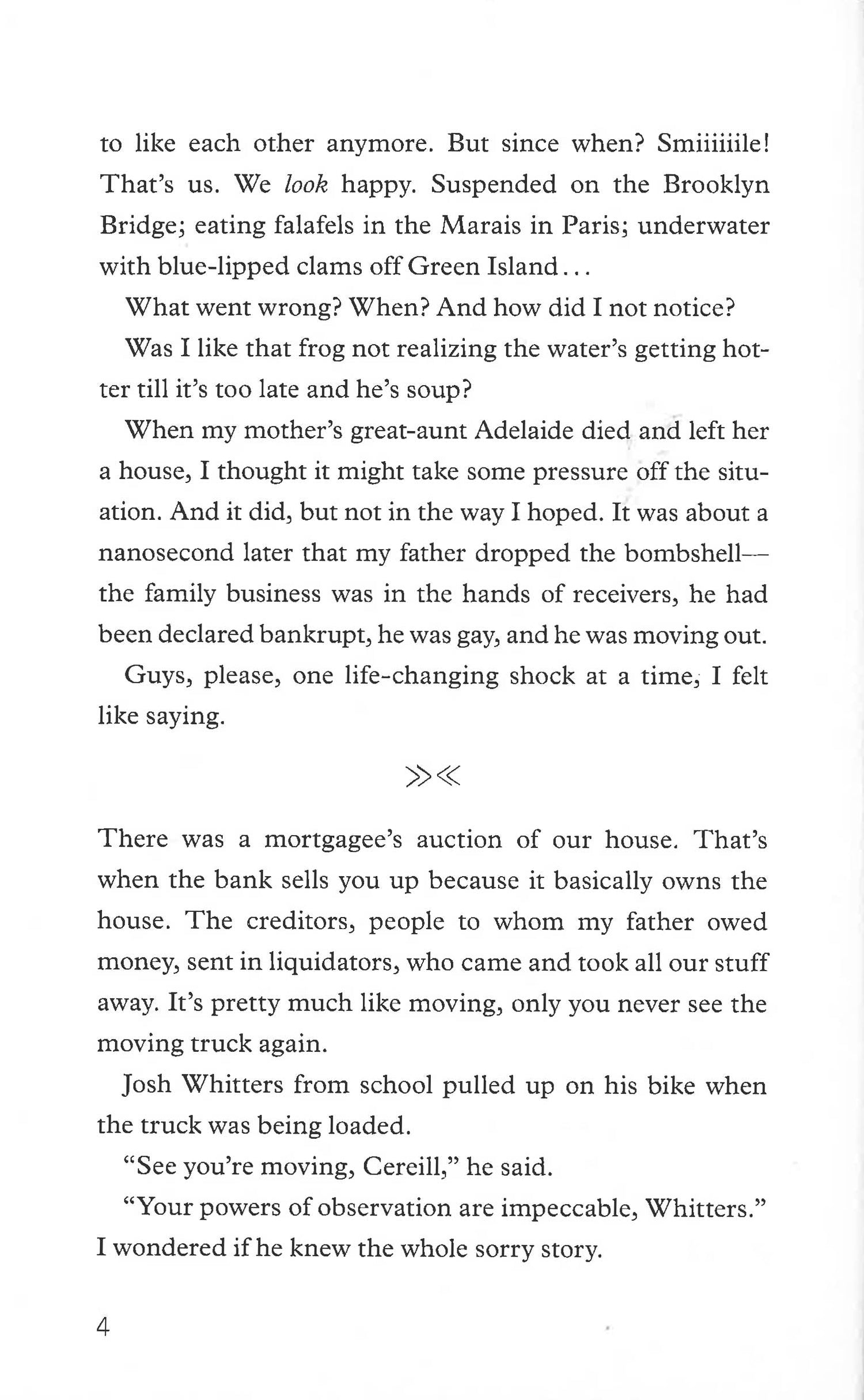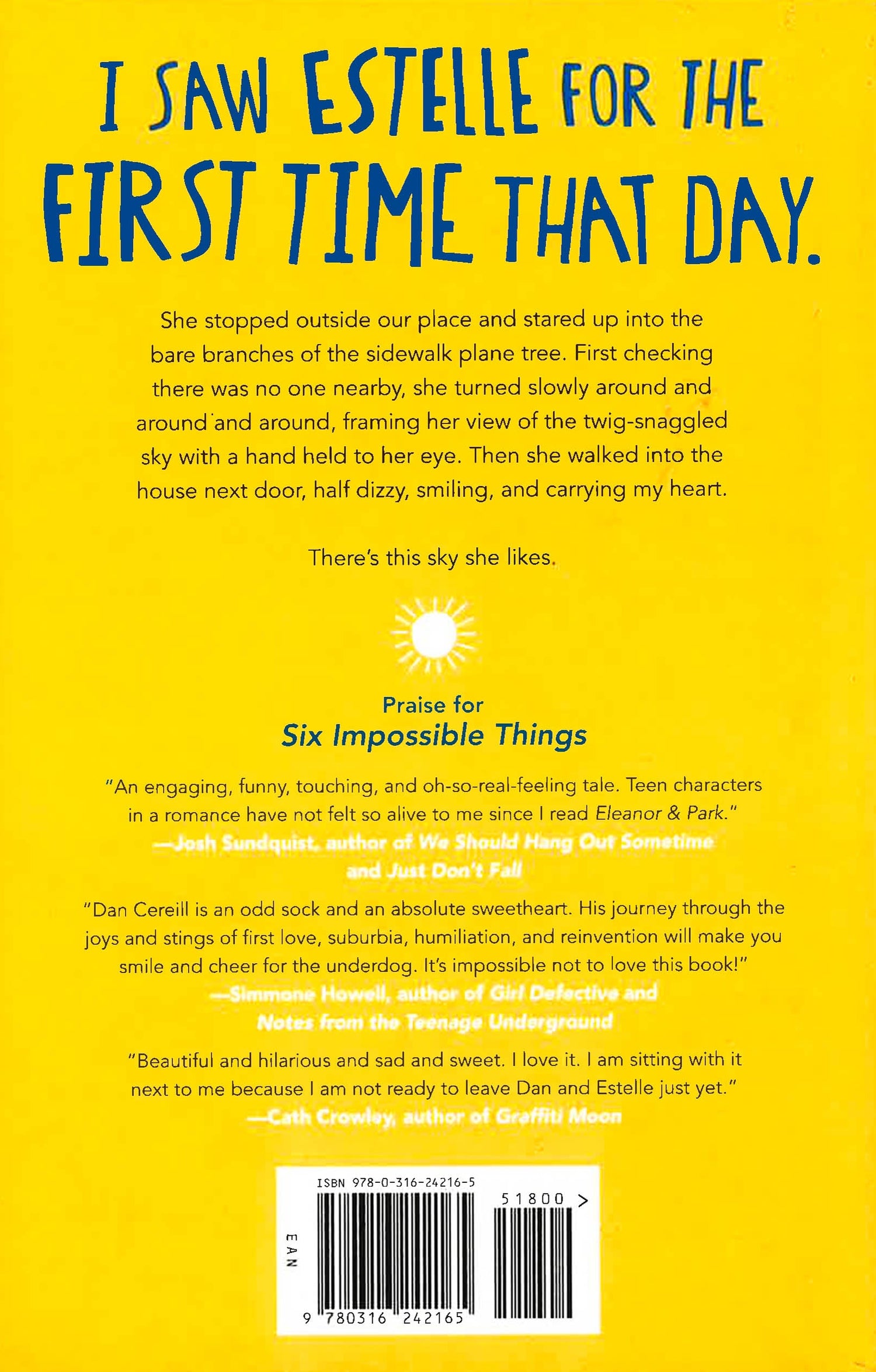 1. Kiss Estelle. 2. Get a job. 3. Cheer my mother up. 4. Try not to be a complete nerd/loser. 5. Talk to my father when he calls. 6. Figure out how to be good. Nerd-boy Dan Cereill is not quite coping with a whole heap of problems, including a reversal of family fortune, moving, new-school hell, a mother with a failing wedding cake business, a just-out gay dad, and a massive crush on Estelle, the girl next door. His life is a mess, but for now he's narrowed it down to just six impossible things.... In this charming story of one guy's efforts to get it together when his life is falling apart, award-winning author Fiona Wood introduces an irresistible voice and a delightfully awkward character who is impossible to forget.
