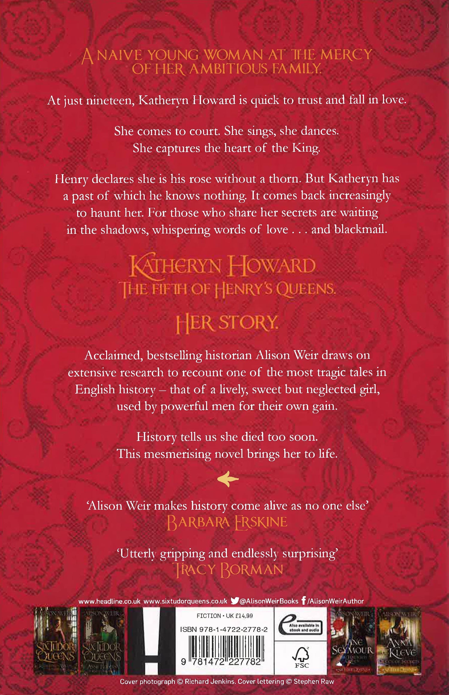'This six-book series looks likely to become a landmark in historical fiction' The Times Alison Weir, historian and author of the Sunday Times-bestselling Six Tudor Queens series, relates one of the most tragic stories in English history: Katheryn Howard, Henry VIII's fifth queen.'With characteristic verve and stunning period detail, this novel will captivate you and break your heart. Utterly sublime' TRACY BORMAN'Conveys the heart-rending pathos of a young woman executed, whose only real crime was her naïveté and her desire to be loved... It is a profoundly moving story that lingers long after the last page is turned'ELIZABETH FREEMANTLE'Alison's sensitively drawn novel will change everyone's preconceptions'SUSAN RONALD...A NAIVE YOUNG WOMAN AT THE MERCY OF HER AMBITIOUS FAMILY.At just nineteen, Katheryn Howard is quick to trust and fall in love.She comes to court. She sings, she dances. She captures the heart of the King. Henry declares she is his rose without a thorn. But Katheryn has a past of which he knows nothing. It comes back increasingly to haunt her. For those who share her secrets are waiting in the shadows, whispering words of love... and blackmail. KATHERYN HOWARDTHE FIFTH OF HENRY'S QUEENS.HER STORY.Acclaimed, bestselling historian Alison Weir draws on extensive research to recount one of the most tragic tales in English history - that of a lively, sweet but neglected girl, used by powerful men for their own gain. History tells us she died too soon.This mesmerising novel brings her to life. PRAISE FOR THE SIX TUDOR QUEENS SERIES:'Weir is excellent on the little details that bring a world to life' Guardian'Alison Weir makes history come alive as no one else' Barbara Erskine'Well researched and engrossing' Good Housekeeping'Utterly gripping and endlessly surprising' Tracy Borman 'Hugely enjoyable . . . Alison Weir knows her subject and has a knack for the telling and textural detail' Daily Mail