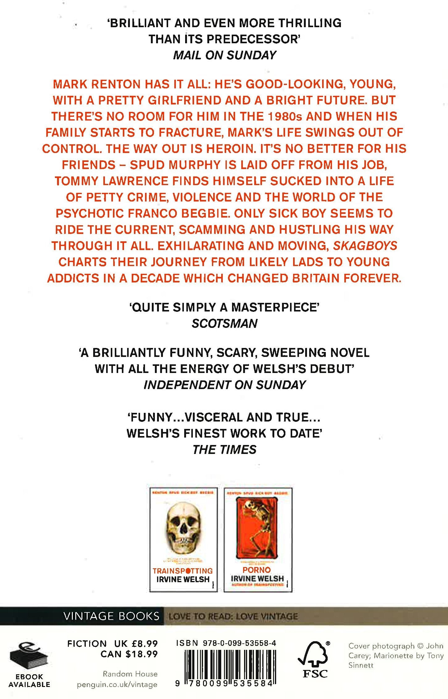 Mark Renton has it all: he's good-looking, young, with a pretty girlfriend and a bright future. But there's no room for him in the 1980s and when his family starts to fracture, Mark's life swings out of control. The way out is heroin. It's no better for his friends - Spud Murphy is laid off from his job, Tommy Lawrence finds himself sucked into a life of petty crime, violence and the world of the psychotic Franco Begbie. Only Sick Boy seems to ride the current, scamming and hustling his way through it all. Exhilarating and moving, Skagboys charts their journey from likely lads to young addicts in a decade which changed Britain forever. *This book may have minor shelfwear.