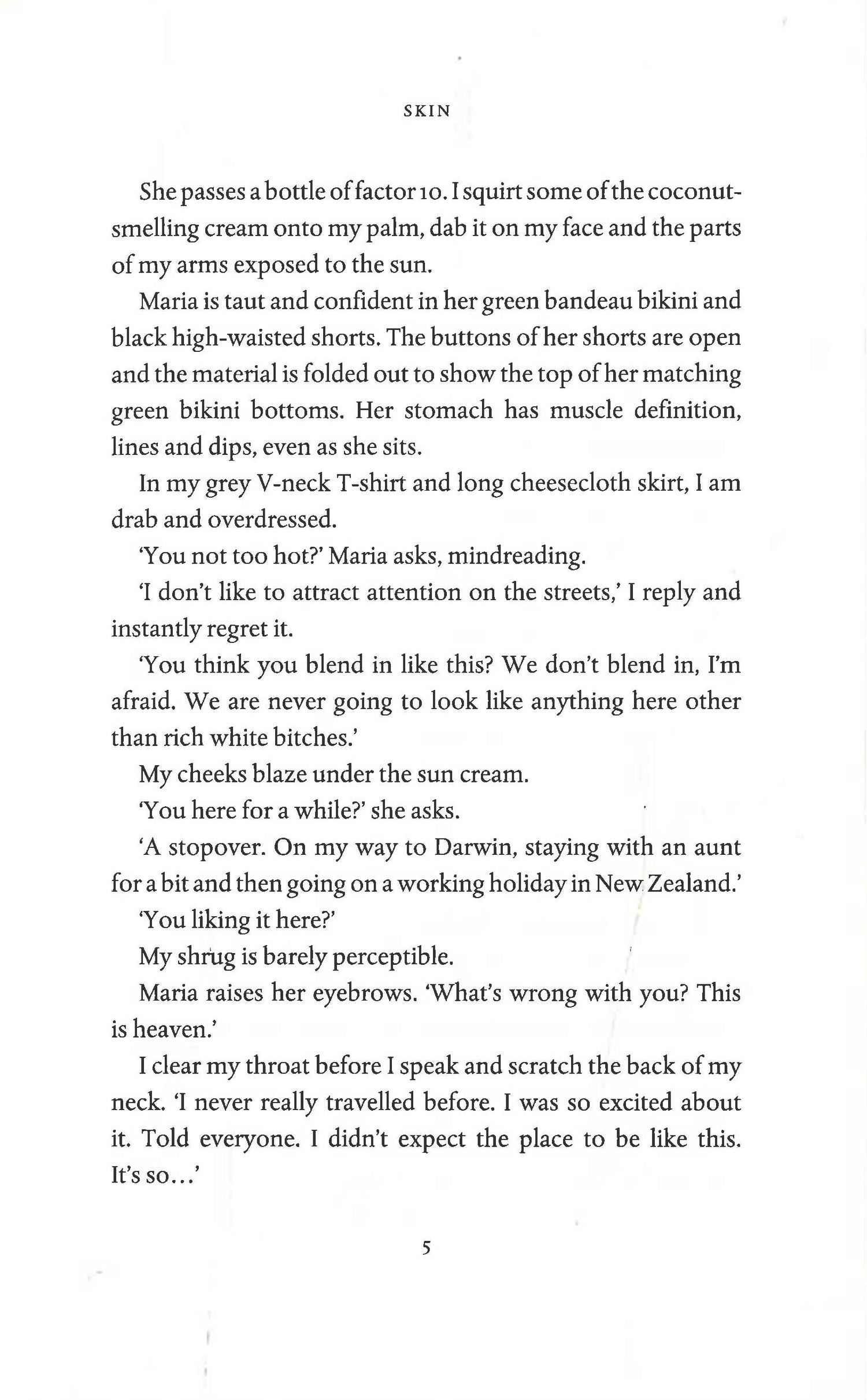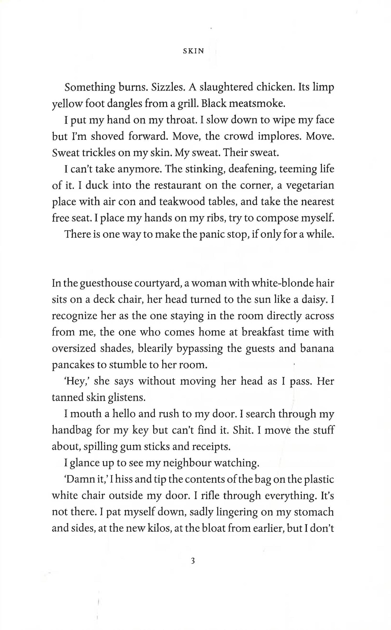 Would you travel the world to feel at home in your skin? Natalie is uncomfortable in herself. Her most recent relationship is long since over, and she is disillusioned with her career as a teacher. So she packs her bags and goes travelling in hope of finding a place for herself in the world. But her isolation abroad only heightens her sense of unease. Obsessed with how others perceive her, she recoils from relationships and eats - compulsively and self-destructively, to silence the anxious voice in her head that never seems satisfied. Skin engages powerfully with issues of self and belonging via an incredibly beguiling protagonist - intelligent and self-aware, sharp and acute. 'Engrossing... Unvarnished, wry and almost wincingly clear-eyed, the narrative covers acres of emotional terrain - from comedy, to tragedy, and the churned-up borderlands in between' Daily Mail.