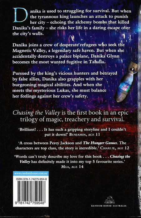 Danika is used to struggling for survival. But when the tyrannous king launches an attack to punish her city—echoing the alchemy bombs that killed Danika’s family—she risks her life in a daring escape over the city’s walls. Danika joins a crew of desperate refugees who seek the Magnetic Valley, a legendary safe haven. But when she accidentally destroys a palace biplane, Danika Glynn becomes the most wanted fugitive in Taladia. Pursued by the king’s vicious hunters and betrayed by false allies, Danika also grapples with her burgeoning magical abilities. And when she meets the mysterious Lukas, she must balance her feelings against her crew’s safety. Chasing the Valley is the first book in an epic trilogy of magic, treachery, and survival.