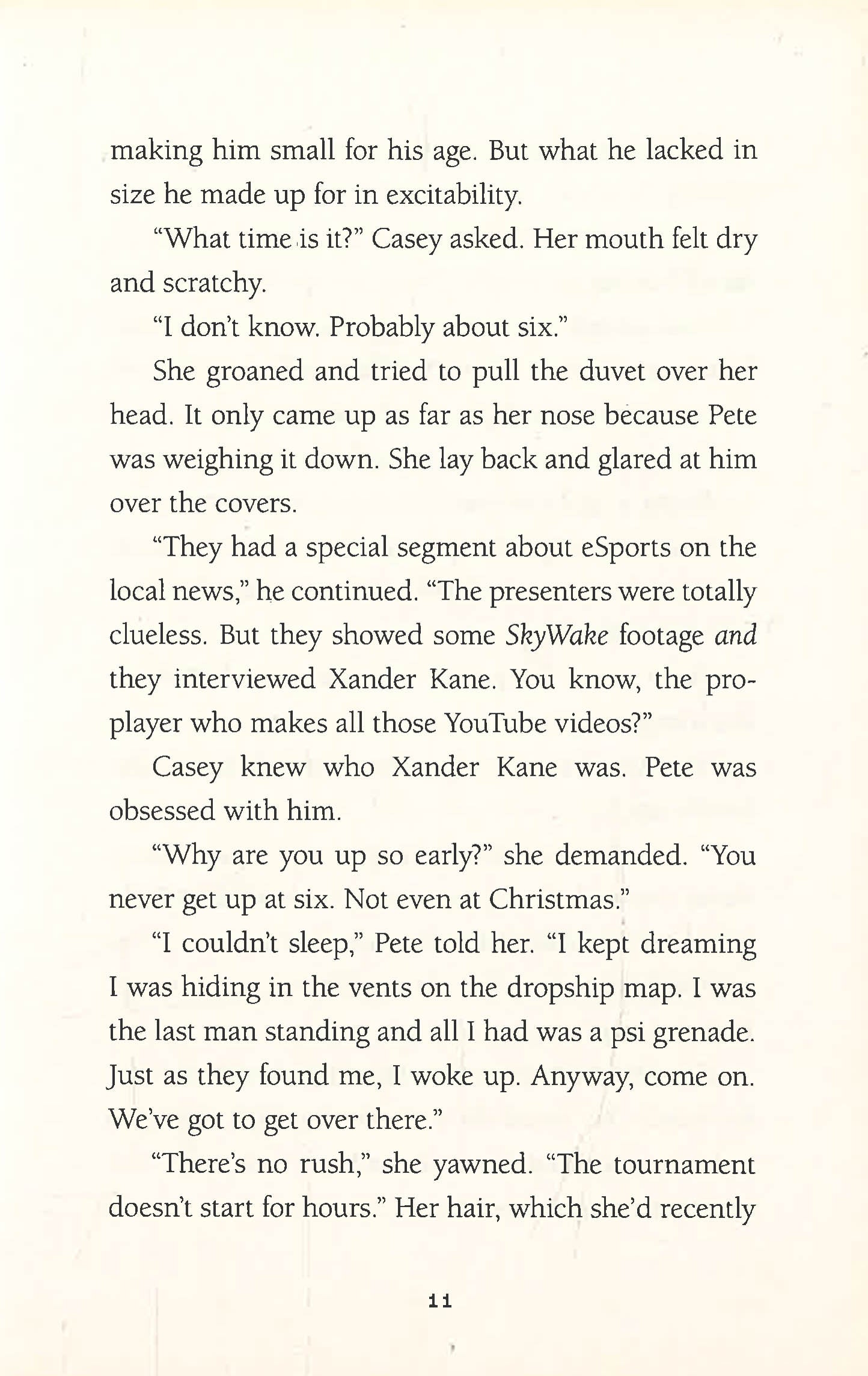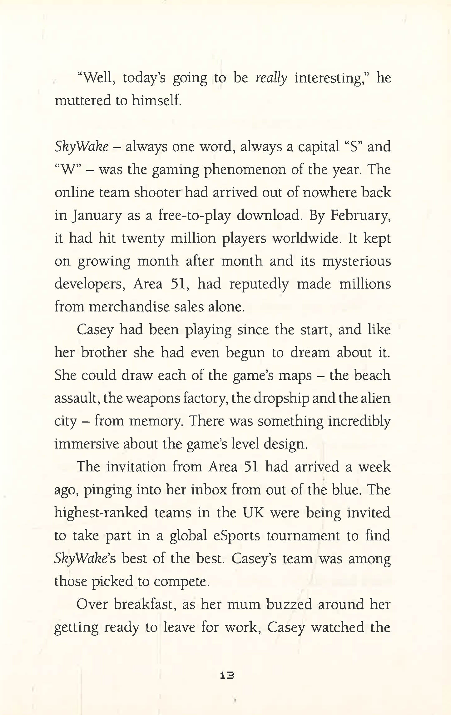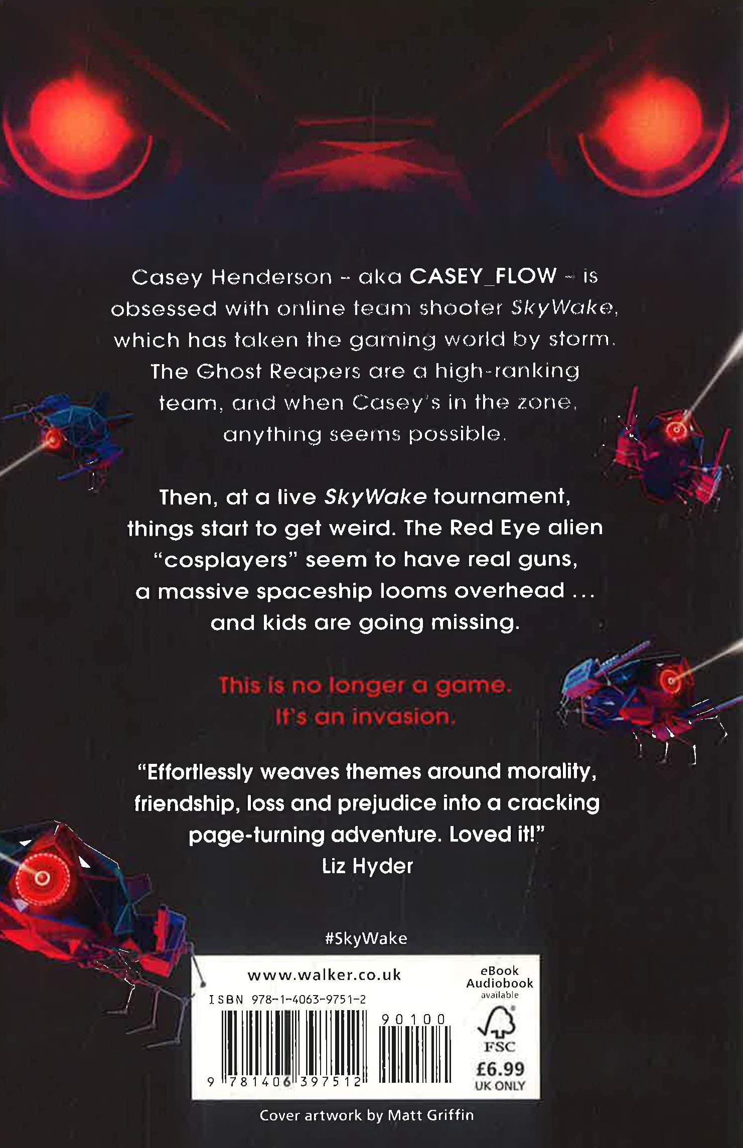 Fifteen-year-old girl gamer Casey Henderson is obsessed with smash-hit game SkyWake – and she’s good at it, too. Little does she realize it’s actually an alien training tool created by an evil extra-terrestrial race. When the aliens swoop down on a national gaming tournament, Casey and her teammates discover they’re abducting the best gamers to fight in a distant alien war across the galaxy. And they’ve got her brother. Casey’s gaming skills are her best hope of stopping the aliens – but first she and her online teammates must learn to work together in real life…
