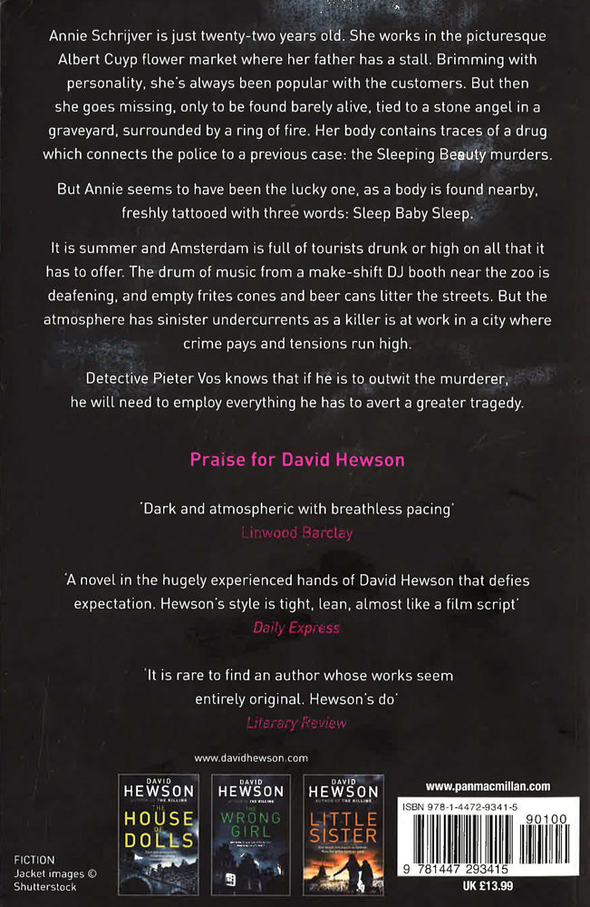 Annie Schrijver is just twenty-two years old. She works in the picturesque Albert Cuyp flower market where her father has a stall. Brimming with personality, she's always been popular with the customers. But then she goes missing, only to be found barely alive, tied to a stone angel in a graveyard, surrounded by a ring of fire. Her body contains traces of a drug which connects the police to a previous case: the Sleeping Beauty murders. But Annie seems to have been the lucky one, as a body is found nearby, freshly tattooed with three words: Sleep Baby Sleep. It is summer and Amsterdam is full of tourists drunk or high on all that it has to offer. The drum of music from a make-shift DJ booth near the zoo is deafening, and empty frites cones and beer cans litter the streets. But the atmosphere has sinister undercurrents as a killer is at work in a city where crime pays and tensions run high. Detective Pieter Vos knows that if he is to outwit the murderer, he will need to employ everything he has to avert a greater tragedy.