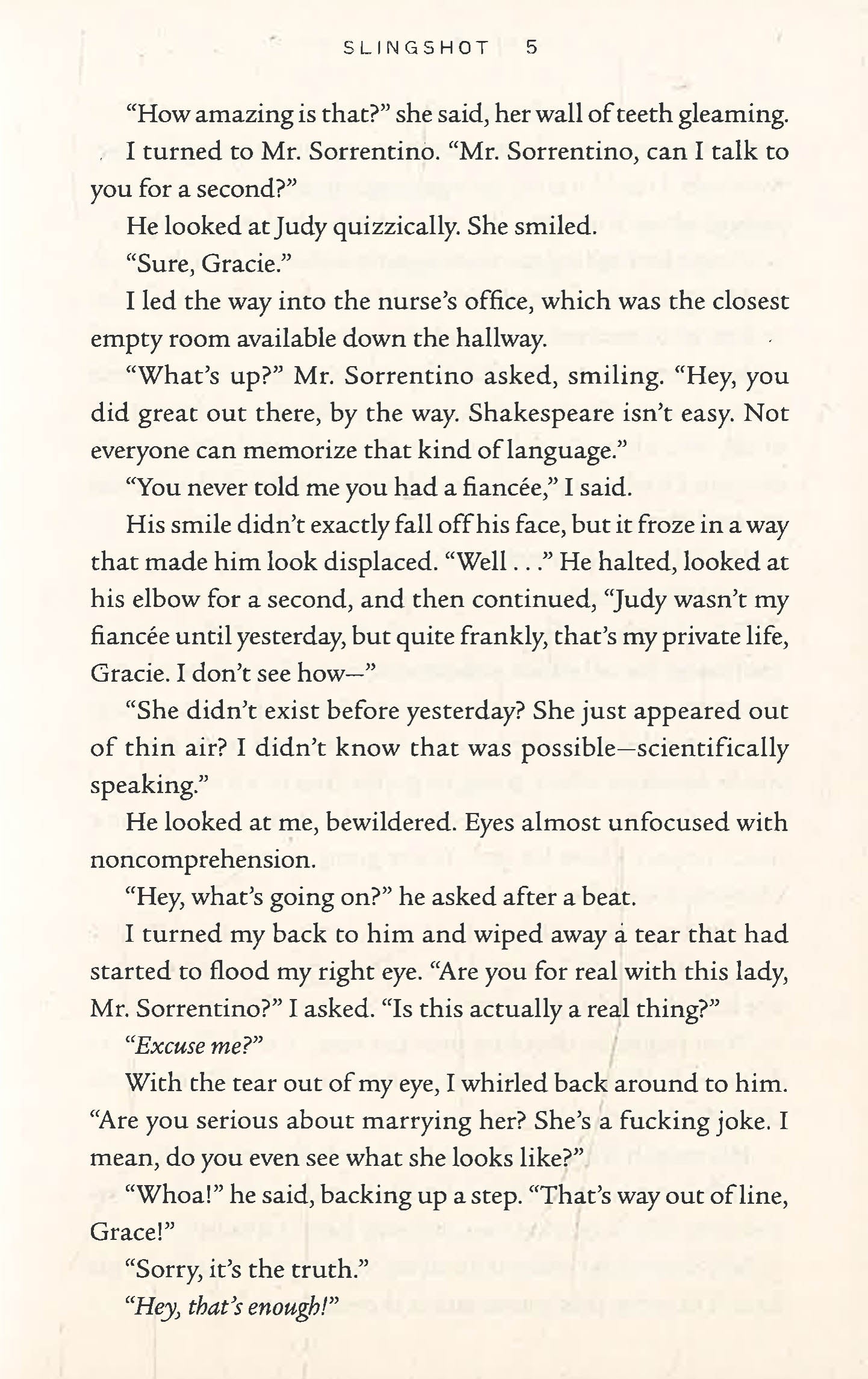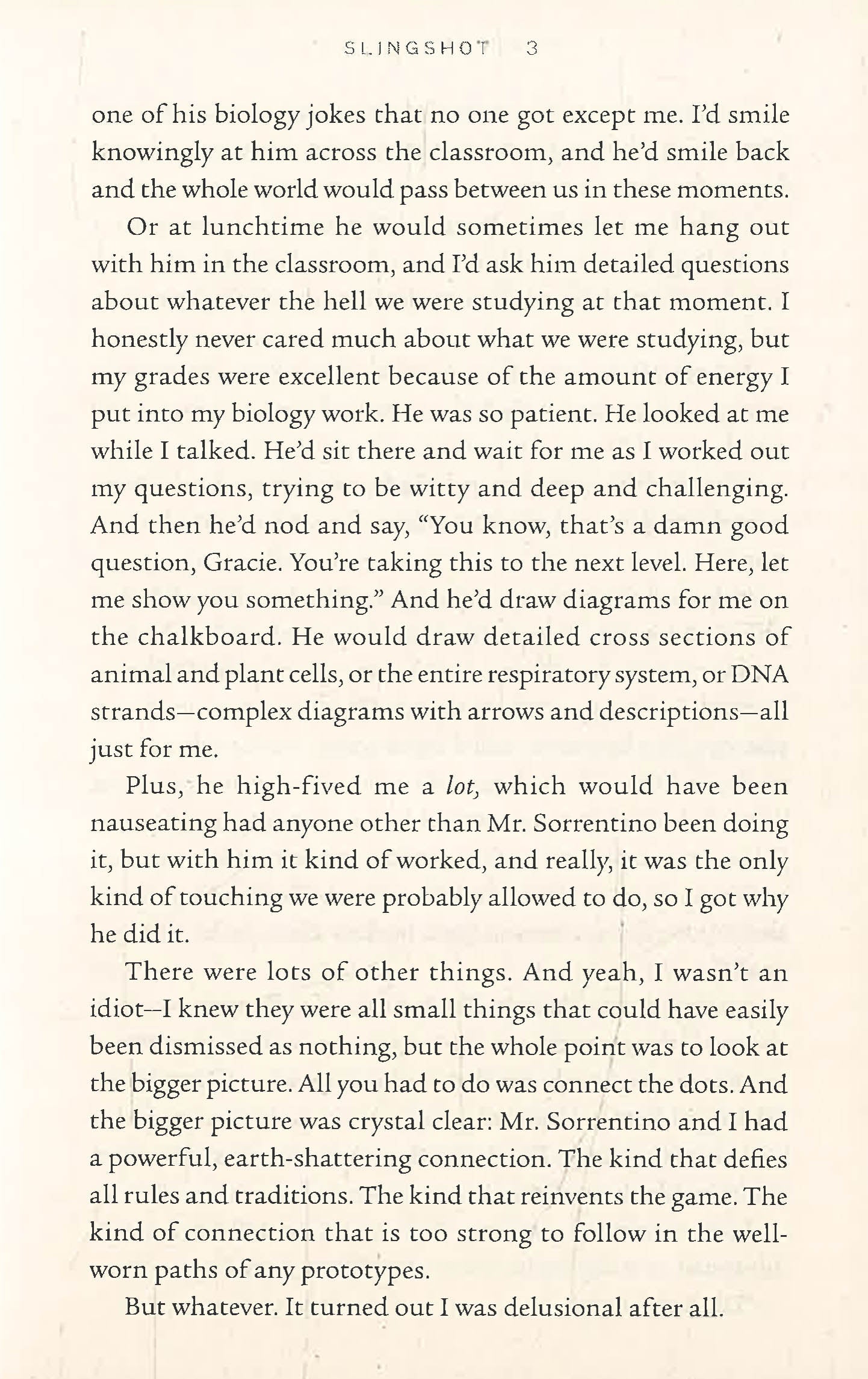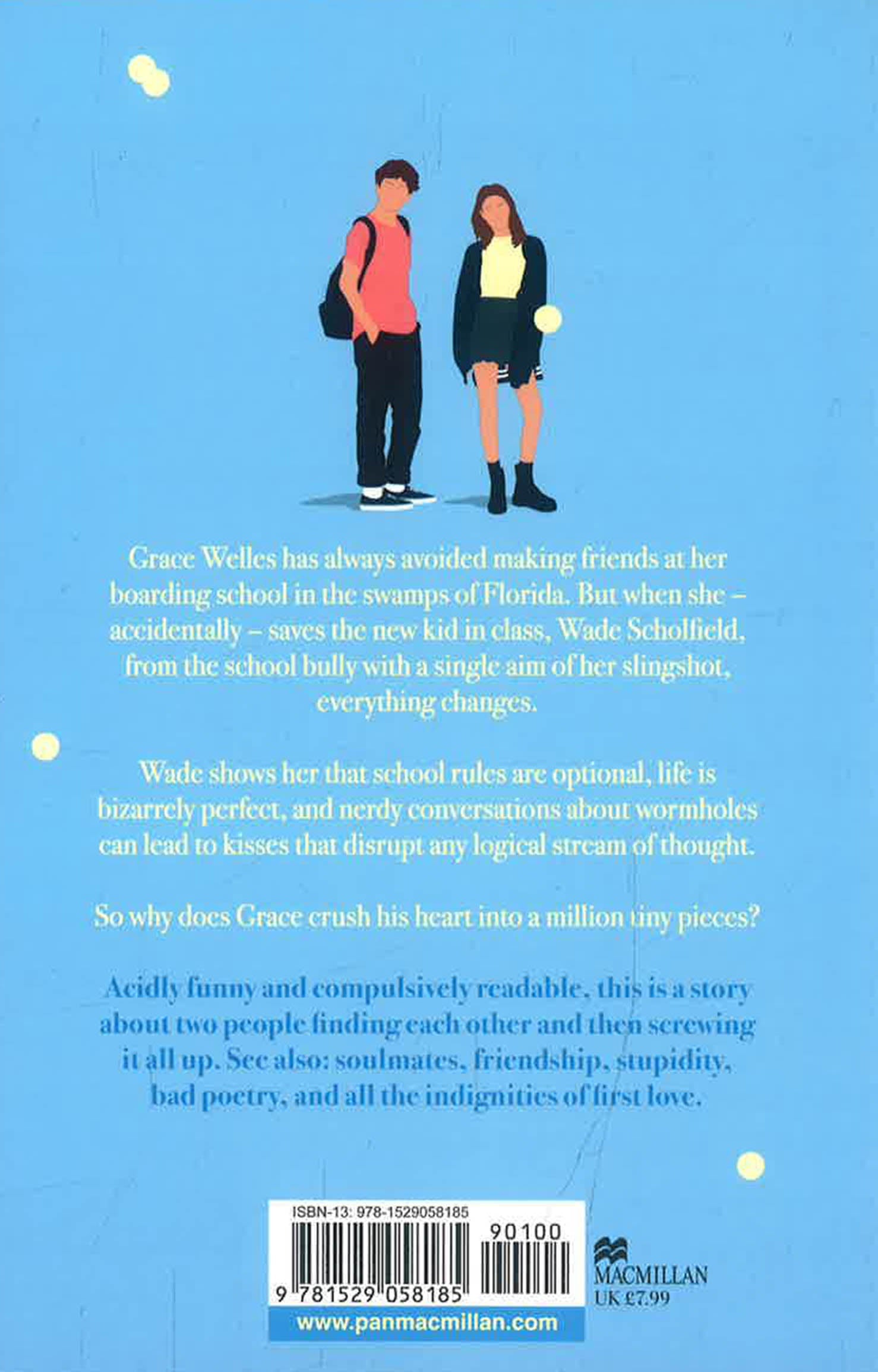 Grace Welles had resigned herself to the particular loneliness of being fifteen and stuck at a third-tier boarding school in the swamps of Florida, when she accidentally saves the new kid in her class from being beaten up. With a single aim of a slingshot, the monotonous mathematics of her life are obliterated forever…because now there is a boy in it that she never asked for. Wade Scholfield.