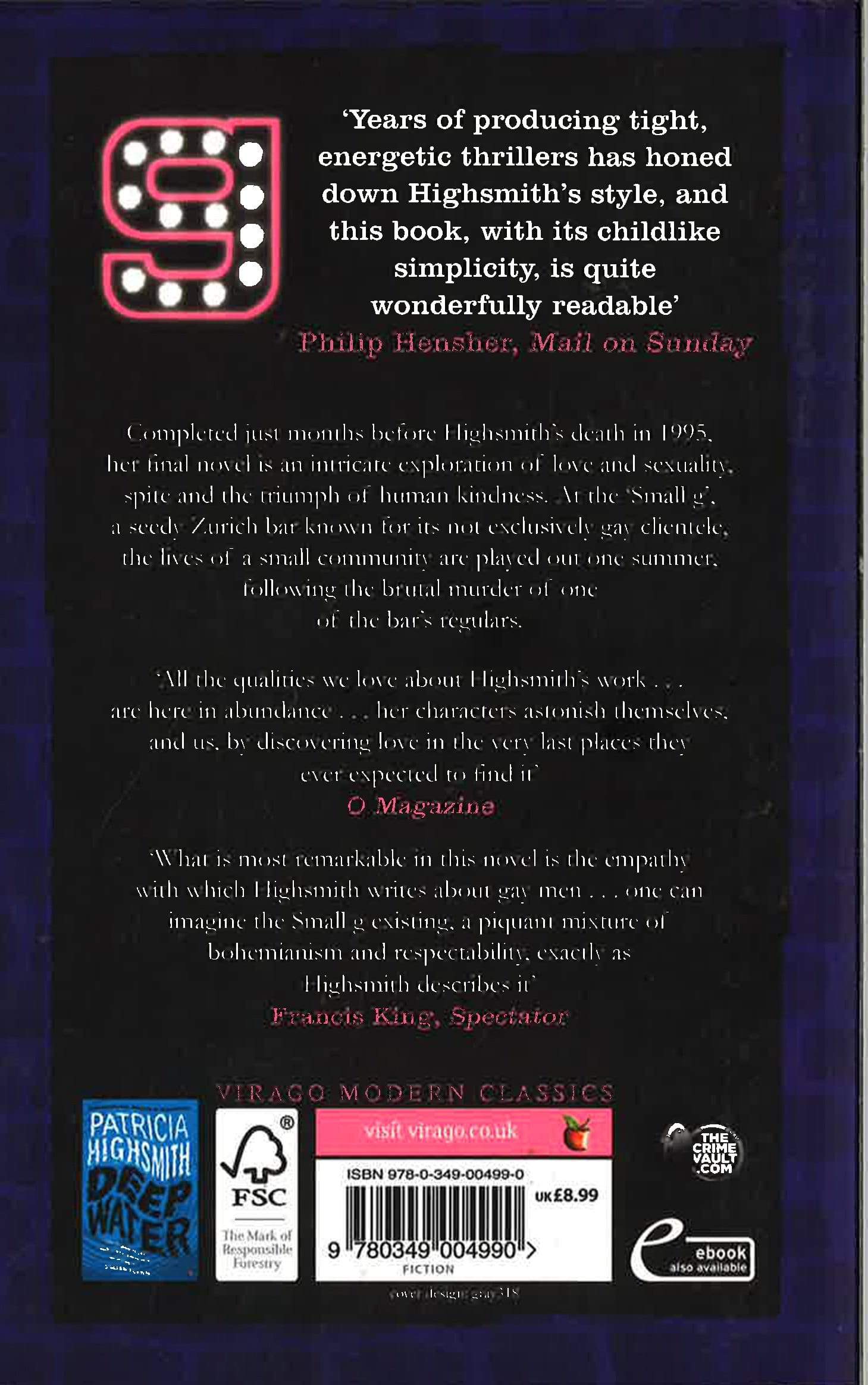Completed just months before Patricia Highsmith's death in 1995, Small g explores the labyrinthine intricacies of passion, sexuality, and jealousy in a charming tale of love misdirected.Completed just months before Patricia Highsmith's death in 1995, Small g explores the labyrinthine intricacies of passion, sexuality, and jealousy in a charming tale of love misdirected.'What is most remarkable in this novel is the empathy . . . with which Highsmith writes about gay men . . . one can imagine the small g existing, a piquant mixture of bohemianism and respectability, exactly as Highsmith describes it' Francis King, SpectatorAt the 'small g', a Zurich bar known for its not exclusively gay clientele, the lives of a small community are played out one summer.Rickie Markwalder is a designer whose lover Petey was brutally murdered. Rickie and his performing dog Lulu are regulars at the bar, as are vindictive Renate, a seamstress, and her teenage apprentice Luisa. Into their lives comes Teddie, impressionable and beautiful, and a catalyst for the series of events that will change everything.Patricia Highsmith's final novel is an intricate exploration of love and sexuality, the depths of spite and the triumph of human kindness. It is a work that, in the tradition of Shakespeare's A Midsummer Night's Dream, shows us how bizarre and unpredictable love can be. Small g, in the words of her biographer Andrew Wilson, is an 'extended fairy tale suggesting that...happiness is precarious and...romance should be embraced.'