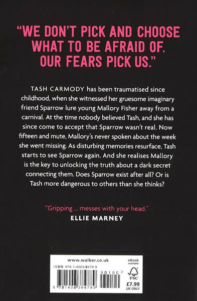 Tash Carmody has been traumatised since childhood, when she witnessed her gruesome imaginary friend Sparrow lure young Mallory Fisher away from a carnival. At the time nobody believed Tash, and she has since come to accept that Sparrow wasn’t real. Now fifteen and mute, Mallory’s never spoken about the week she went missing. As disturbing memories resurface, Tash starts to see Sparrow again. And she realises Mallory is the key to unlocking the truth about a dark secret connecting them. Does Sparrow exist after all? Or is Tash more dangerous to others than she thinks?