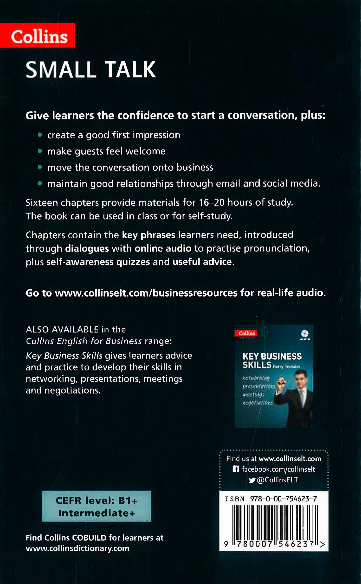 Build key business relationships Collins Small Talk gives you the confidence to start a conversation and transition into bigger conversation topics so that you are able to build relationships, develop business partnerships and be successful in business. Learn the language to:* Meet people for the first time* Greet people in subsequent meetings* Show and receive hospitality* Deal with remote communication* End a conversation The book includes information on best practice and key phrases for students to refer to and practise saying out loud using online audio. Online audio also includes good and bad examples of authentic recordings of small talk for learners to listen to and assess. Suitable for students whose level of English is Intermediate / CEF level B1 and higher. Small Talk is part of Collins' English for Business range of materials to help business people who need to use English frequently in their work. It is designed for people who are about to or already work for a foreign or multinational company, deal with overseas customers or travel for business. Other titles in the Collins English for Business range:Reading * Writing * Listening * Speaking * Key Business Skills * Business Grammar & Practice * Business Vocabulary in Practice * Effective International Business Communication