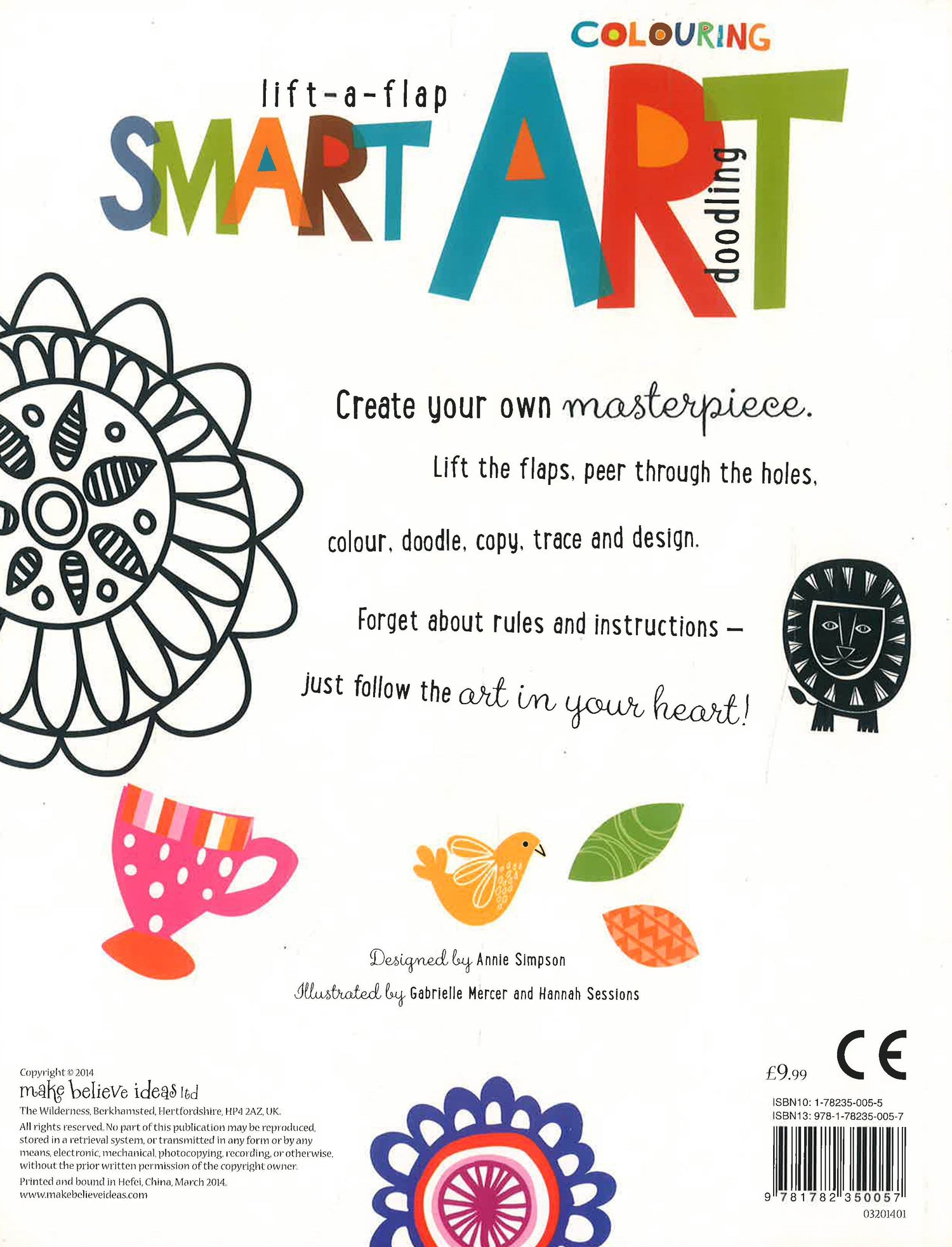 Get ready to do some Smart Art! The Lift-a-flap Colouring and Doodling book is an innovative new art book for creative kids. The book is bursting with stunning illustrations to inspire kids. There are flaps to lift, cut-through holes, sheets of tracing paper, sheets of newsprint paper and gatefolds. With so many features to use in their art, children will feel utterly inspired! The unique format of the book will allow children to let their imaginations run wild and harness their creativity.