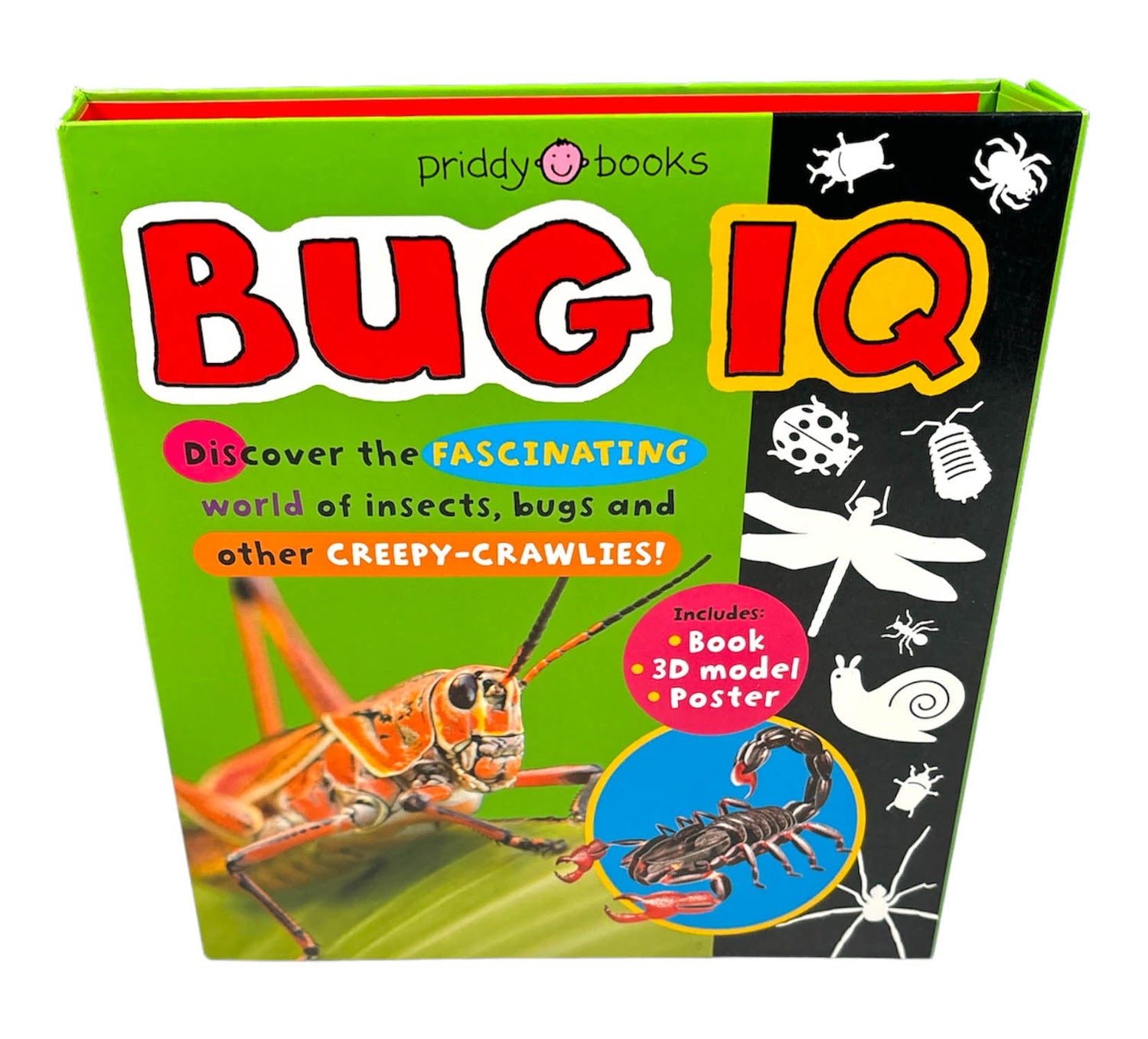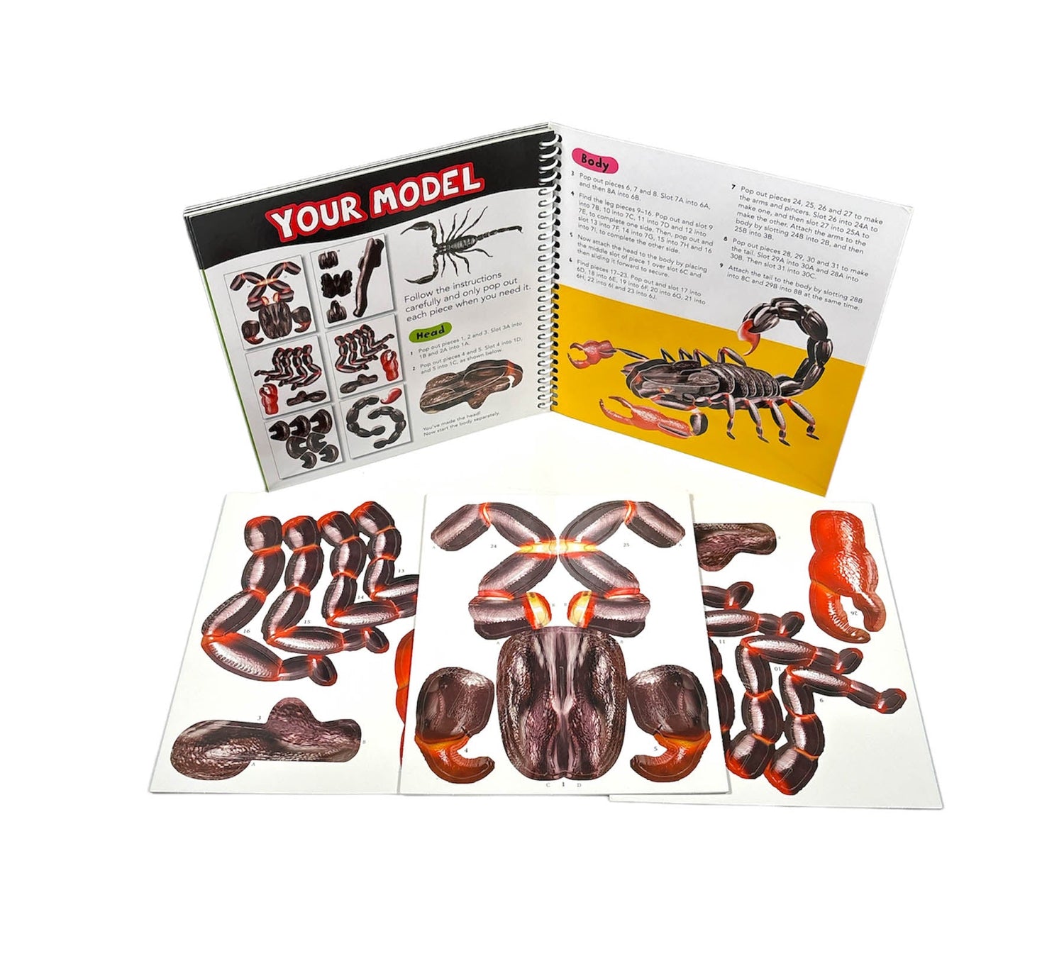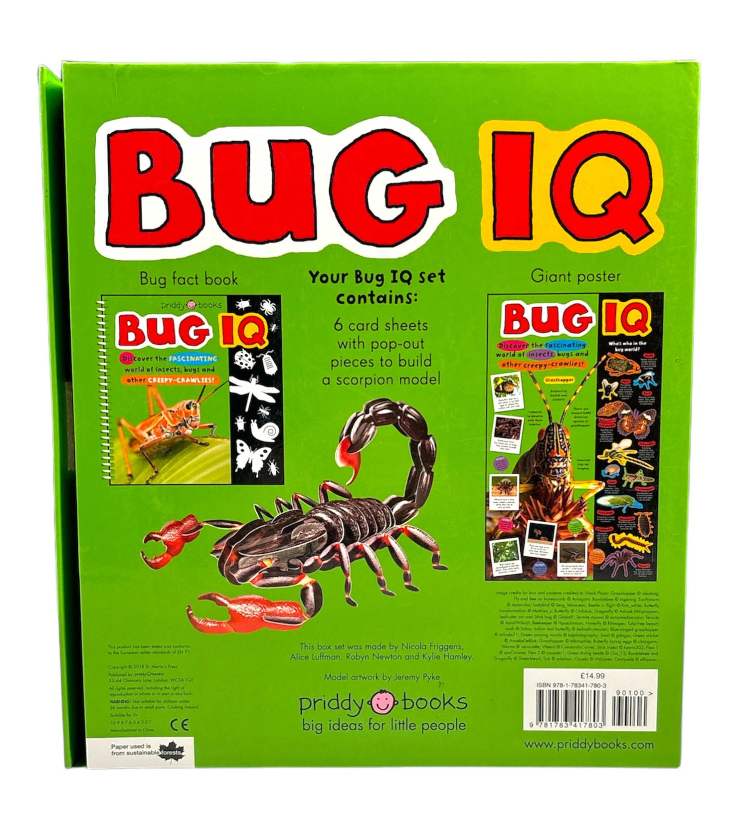 Presented in a box set. In each box you'll find a spiral bound illustrated reference book, a large fold out poster and a 3D model to build, with instructions. 3D model in Bug IQ is a giant scorpion.