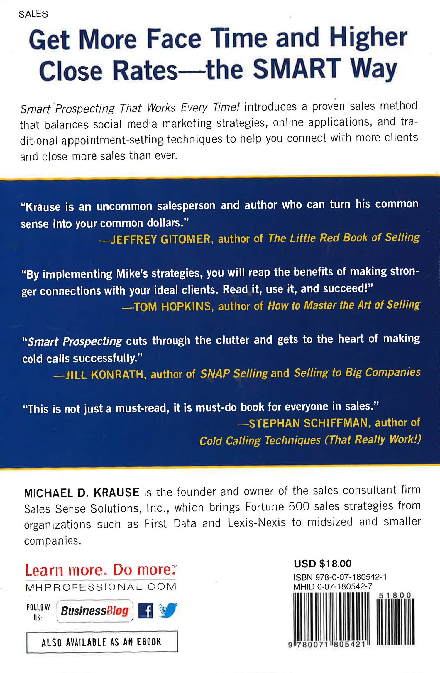 Get More Face Time and Higher Close Rates--the SMART WaySmart Prospecting That Works Every Time! introduces a proven sales method that balances social media marketing strategies, online applications, and traditional appointment-setting techniques to help you connect with more clients and close more sales than ever."Krause is an uncommon salesperson and author who can turn his common sense into your common dollars." -- Jeffrey Gitomer, author of The Little Red Book of Selling"By implementing Mike's strategies, you will reap the benefits of making stronger connections with your ideal clients. Read it, use it, and succeed!" -- Tom Hopkins, author of How to Master the Art of Selling"Smart Prospecting cuts through the clutter and gets to the heart of making cold calls successfully." -- Jill Konrath, author of SNAP Selling and Selling to Big Companies"This is not just a must-read, it is must-do book for everyone in sales." -- Stephan Schiffman, author ofCold Calling Techniques (That Really Work!)