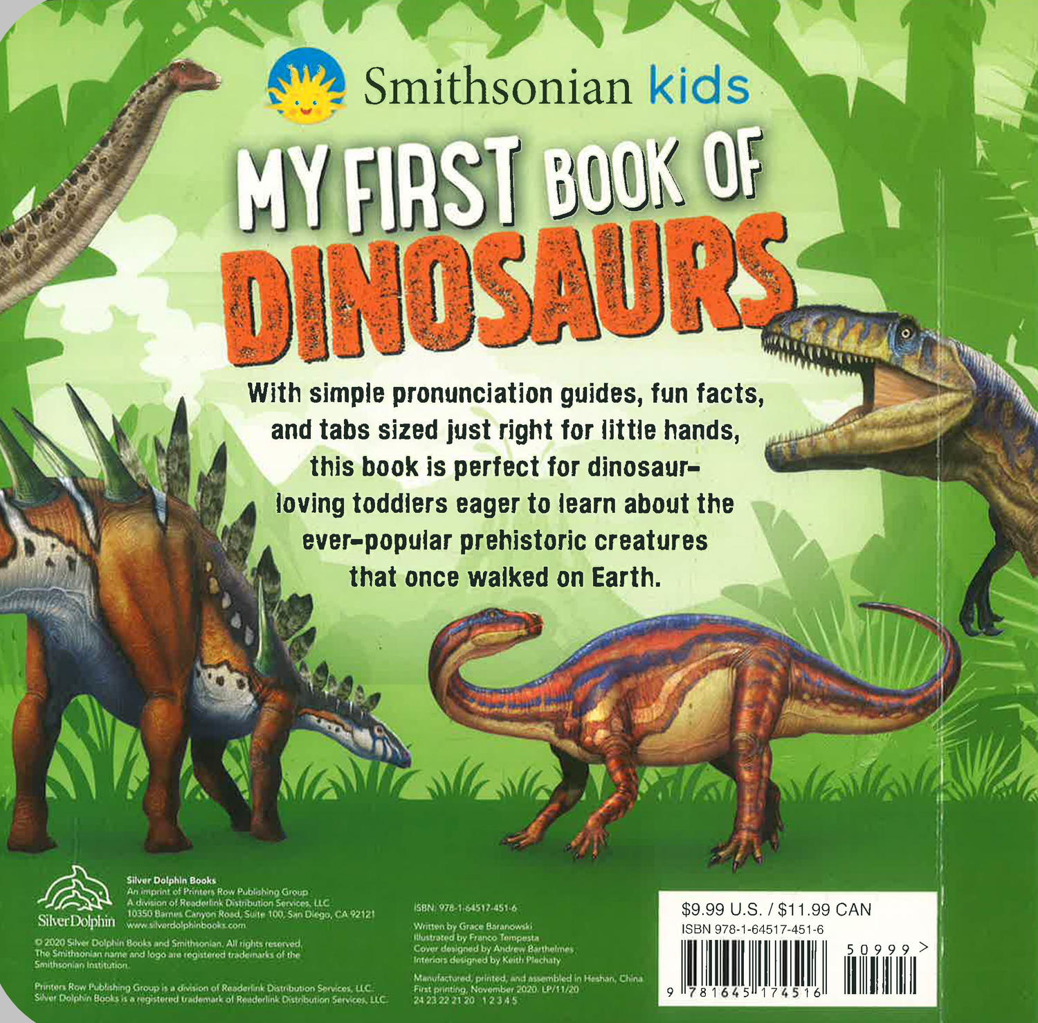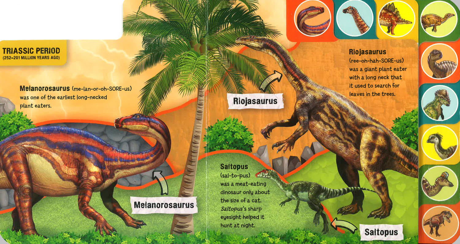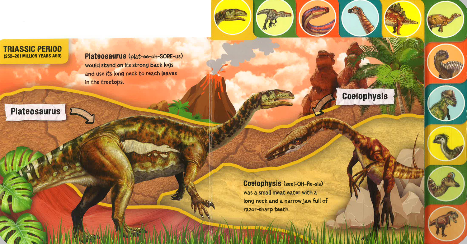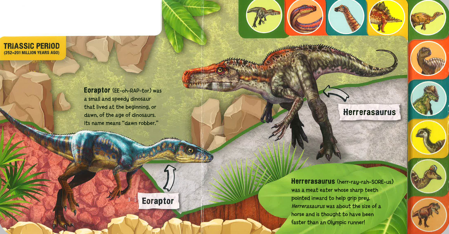 Thirty different dinosaurs and other prehistoric creatures march or fly their way across the pages of this tabbed board book that introduces preschoolers to the magnificent creatures that once ruled the Earth!