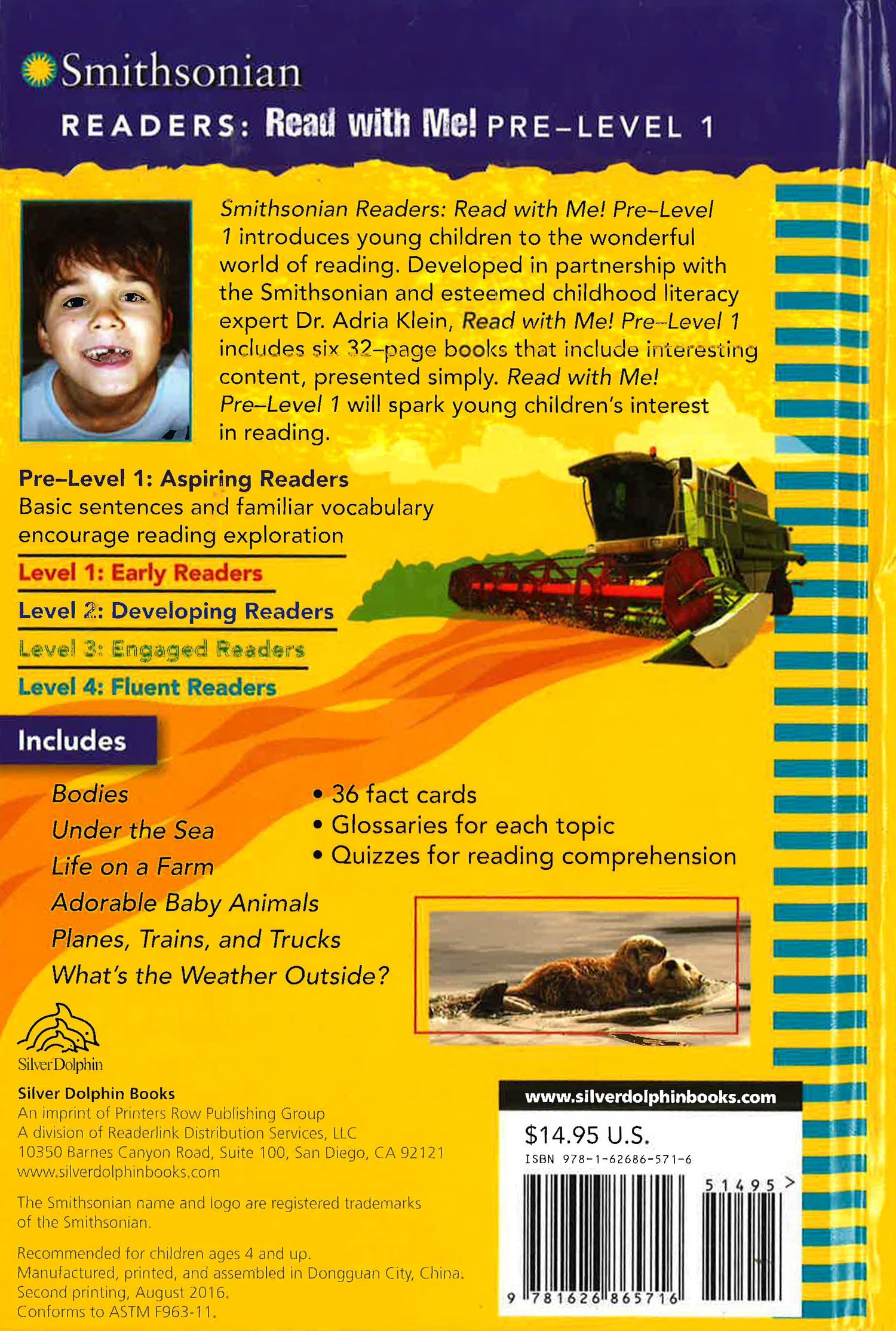 Smithsonian Readers: Read With Me! Pre-Level 1 introduces young children to the wonderful world of reading. Developed in partnership with the Smithsonian Institution and esteemed childhood literacy expert Dr. Adria Klein, Read With Me! Pre-Level 1 includes six titles that feature engaging content, presented simply. The Read With Me! titles were created for children whose interest in reading is just beginning. Pre-Level 1 contains simple, short sentences with familiar vocabulary for children who are starting to read with the support of a parent or caregiver. Bright photographs reinforce the text, encouraging reading comprehension. Bound into the book are 36 perforated fact cards that further sharpen newly acquired reading skills. Read With Me! Pre-Level 1 will spark young children’s interest in becoming life-long readers.This volume includes:BodiesUnder the SeaLife on a FarmAdorable Baby AnimalsPlanes, Trains, and TrucksWhat's the Weather Outside?Features 36 fact cards, glossaries for each topic, and quizzes for reading comprehension.