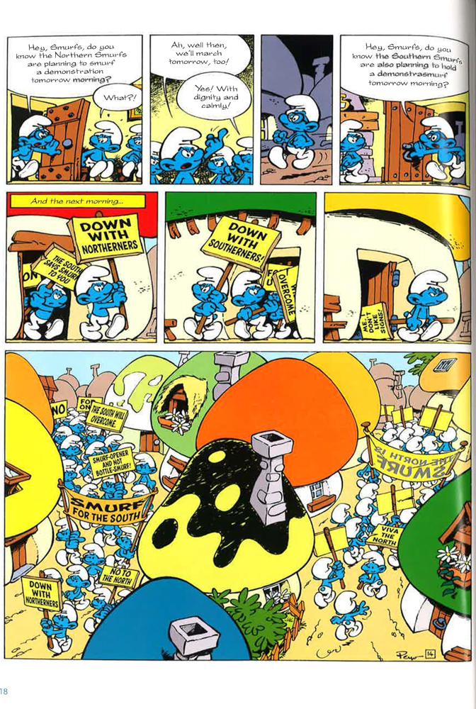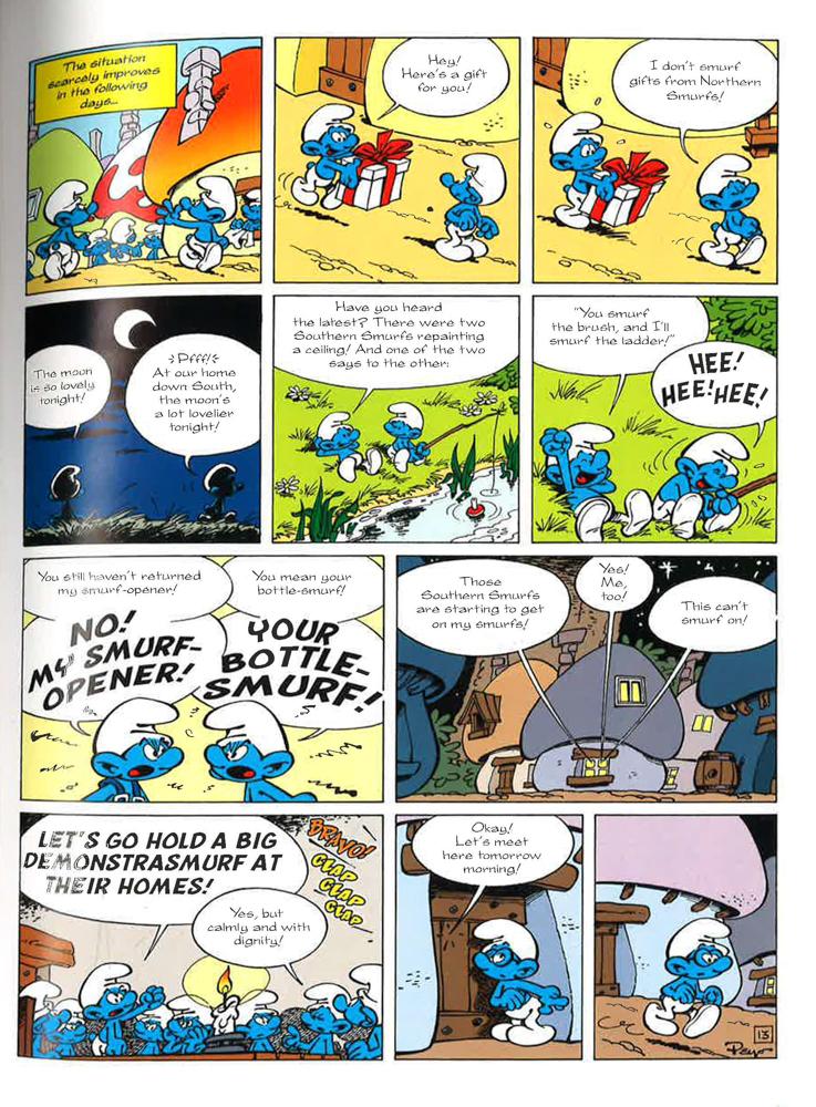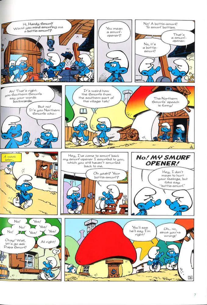 The Smurfs always seem to get into trouble when Papa Smurf is not around. While Papa Smurf works in his laboratory, two Smurfs begin arguing about the proper use of the word smurf. Smurfs that live in the northern part of the village use it as a verb (as in bottle smurfer), while the southerners use it as a noun (as in smurf opener). Without Papa Smurf around to calm things down, the argument quickly escalates until the northern and southern smurfs divide themselves along the village lines! With the southern Smurfs set to perform their play Little Smurf Riding Hood for the northern Smurfs, it looks like the language disagreement is going to get worse before it gets better!