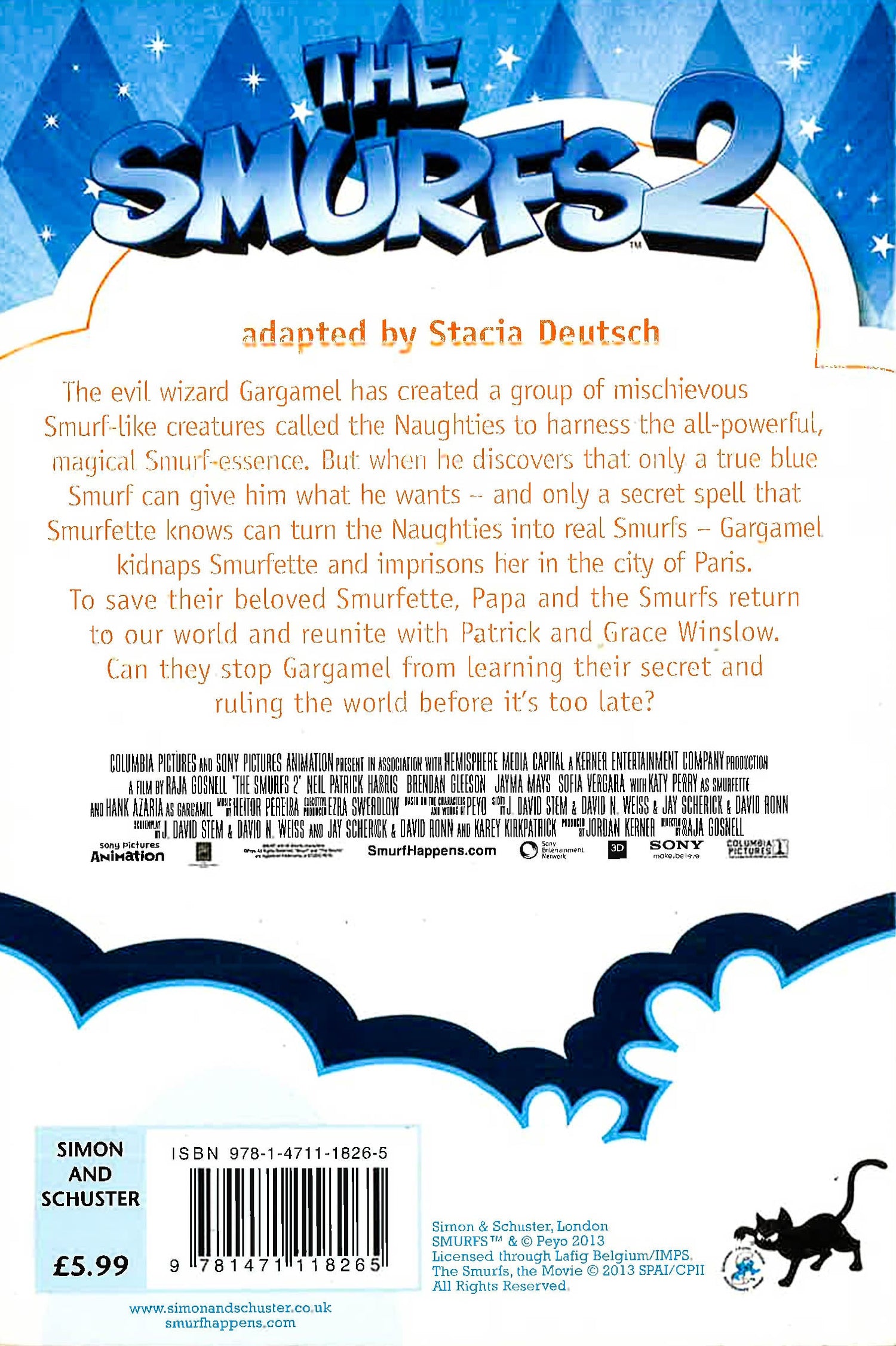 The evil wizard Gargamel has created a group of mischievous Smurf-like creatures called the Naughties to harness the all-powerful, magical Smurf-essence. But when he discovers that only a true blue Smurf can give him what he wants - and only a secret spell that Smurfette knows can turn the Naughties into real Smurfs - Gargamel kidnaps Smurfette and imprisons her in the city of Paris. To save their beloved Smurfette, Papa and the Smurfs return to our world and reunite with Patrick and Grace Winslow. Can they stop Gargamel from learning their secret and ruling the world before it's too late?