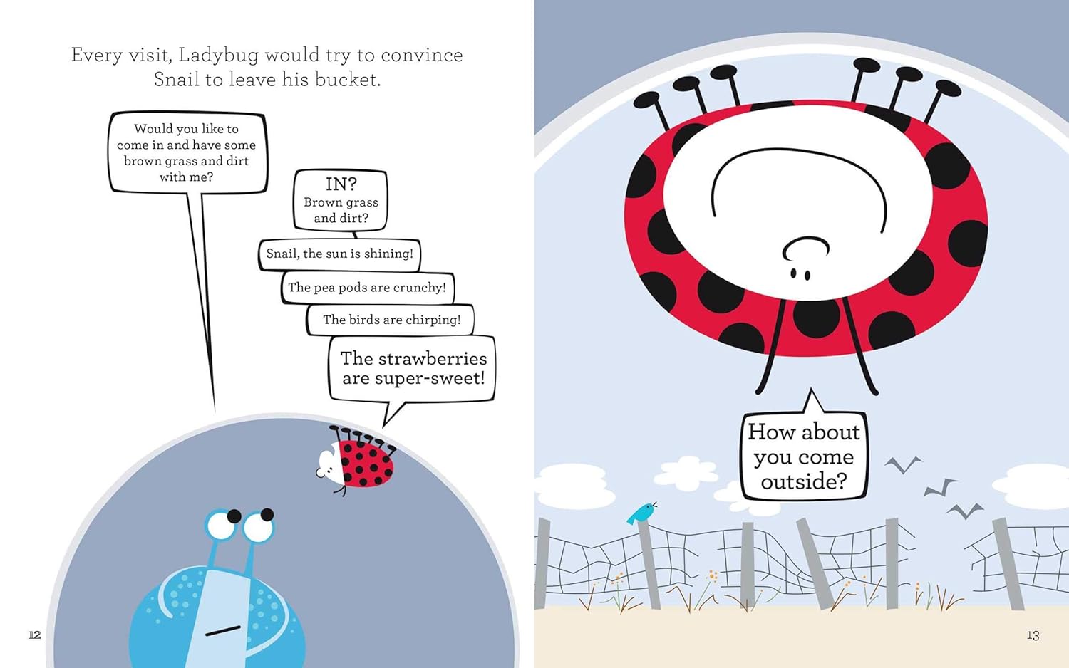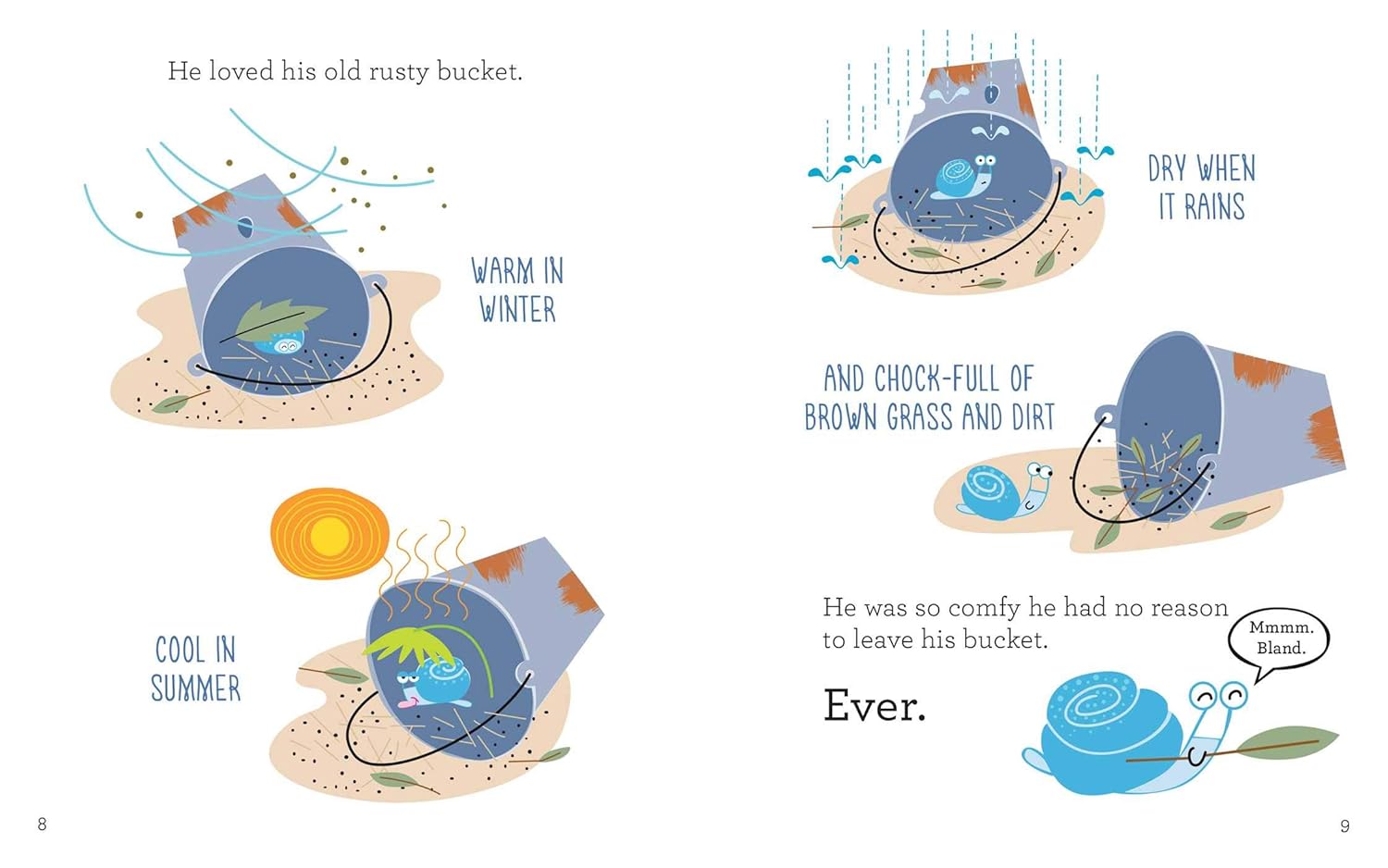 Snail is a merry little mollusk who lives in a rusty bucket. Day after day, rain or shine, snail doesn’t move—and that suits him just fine. But when his bucket is turned over, his life takes a topsy-turvy turn. A journey through the vegetable garden opens up a whole world of new friends, new foods, and maybe even a little danger. Can Snail find happiness out here, or will he wish he never left his bucket?