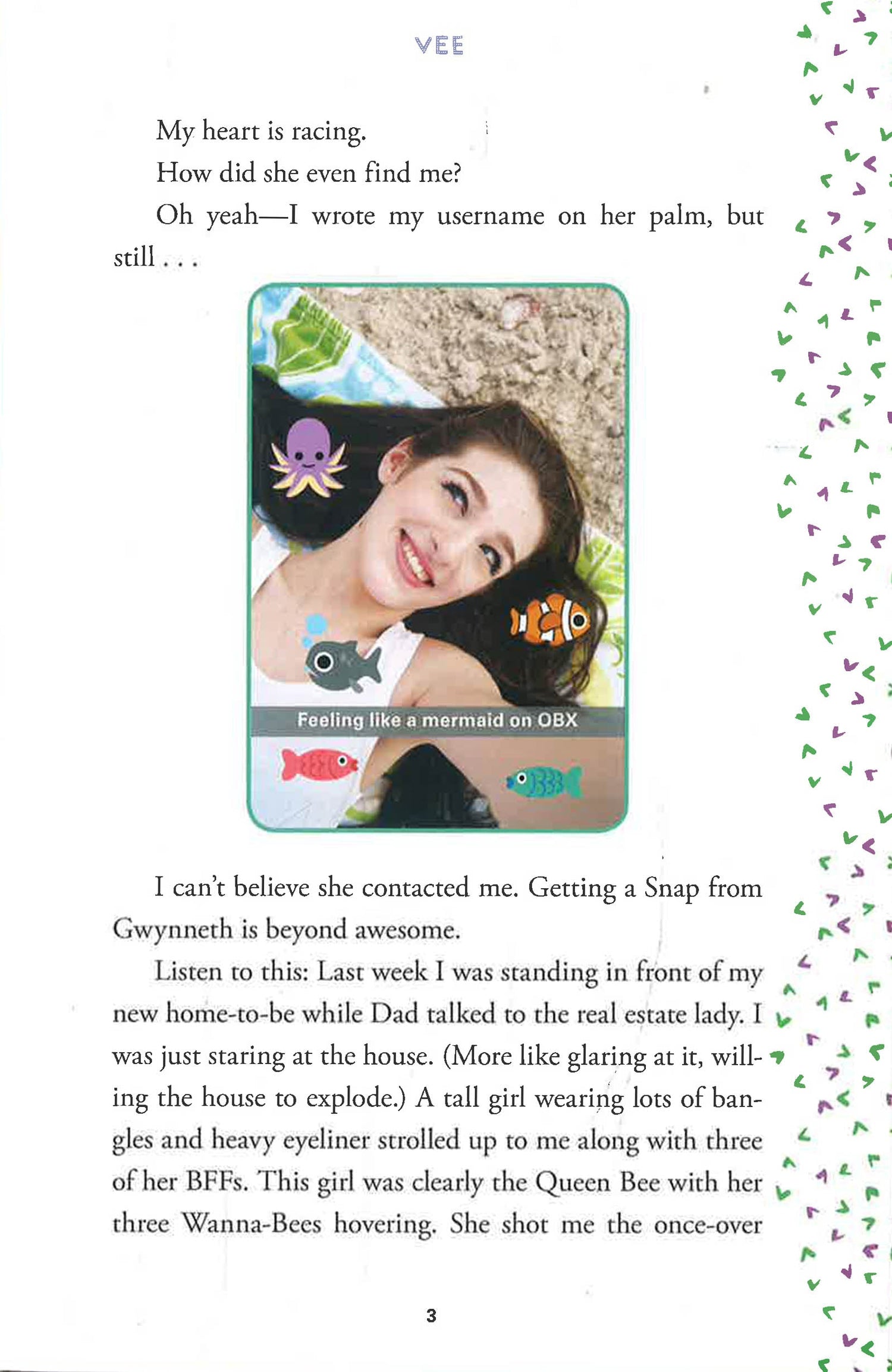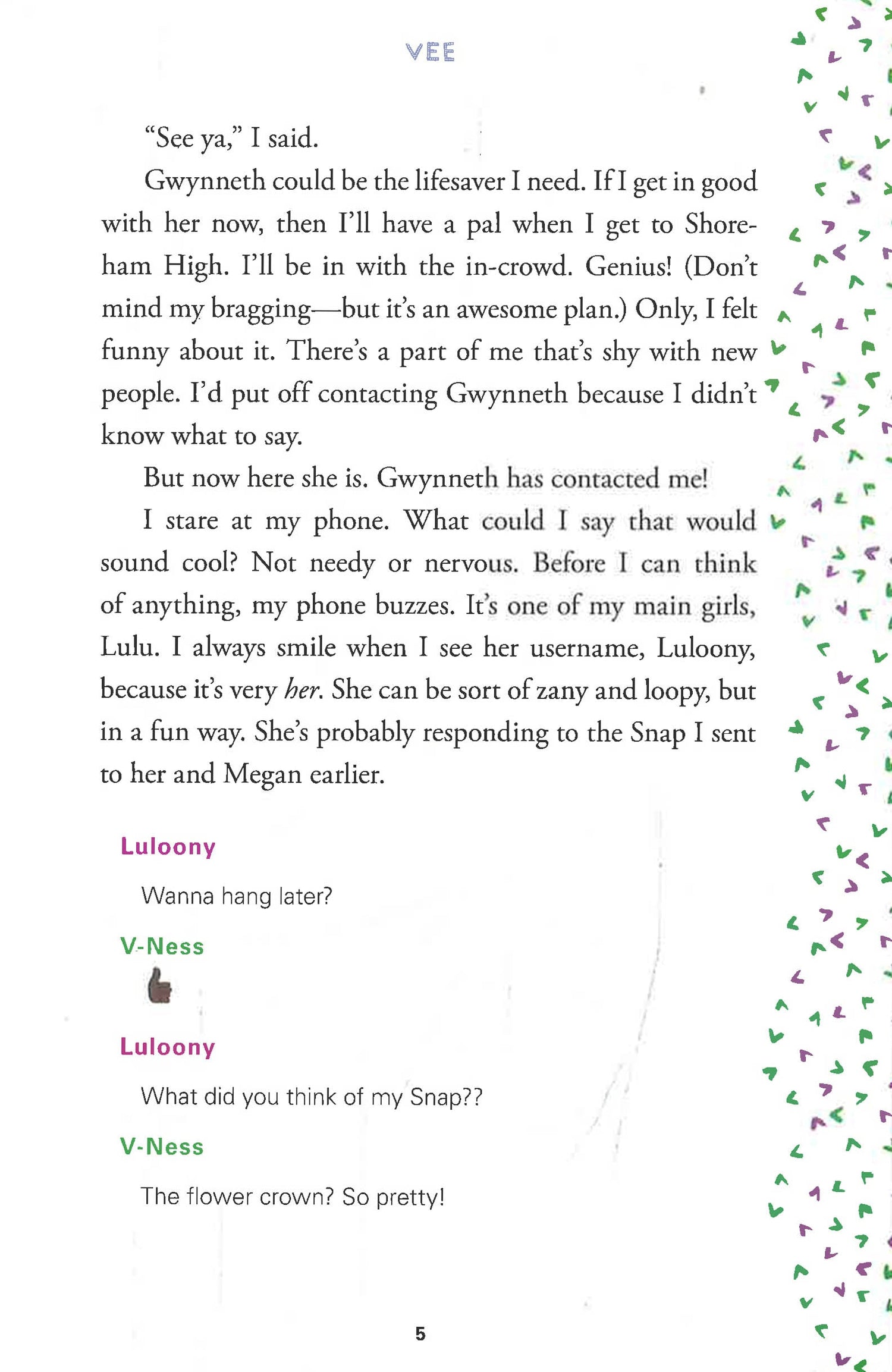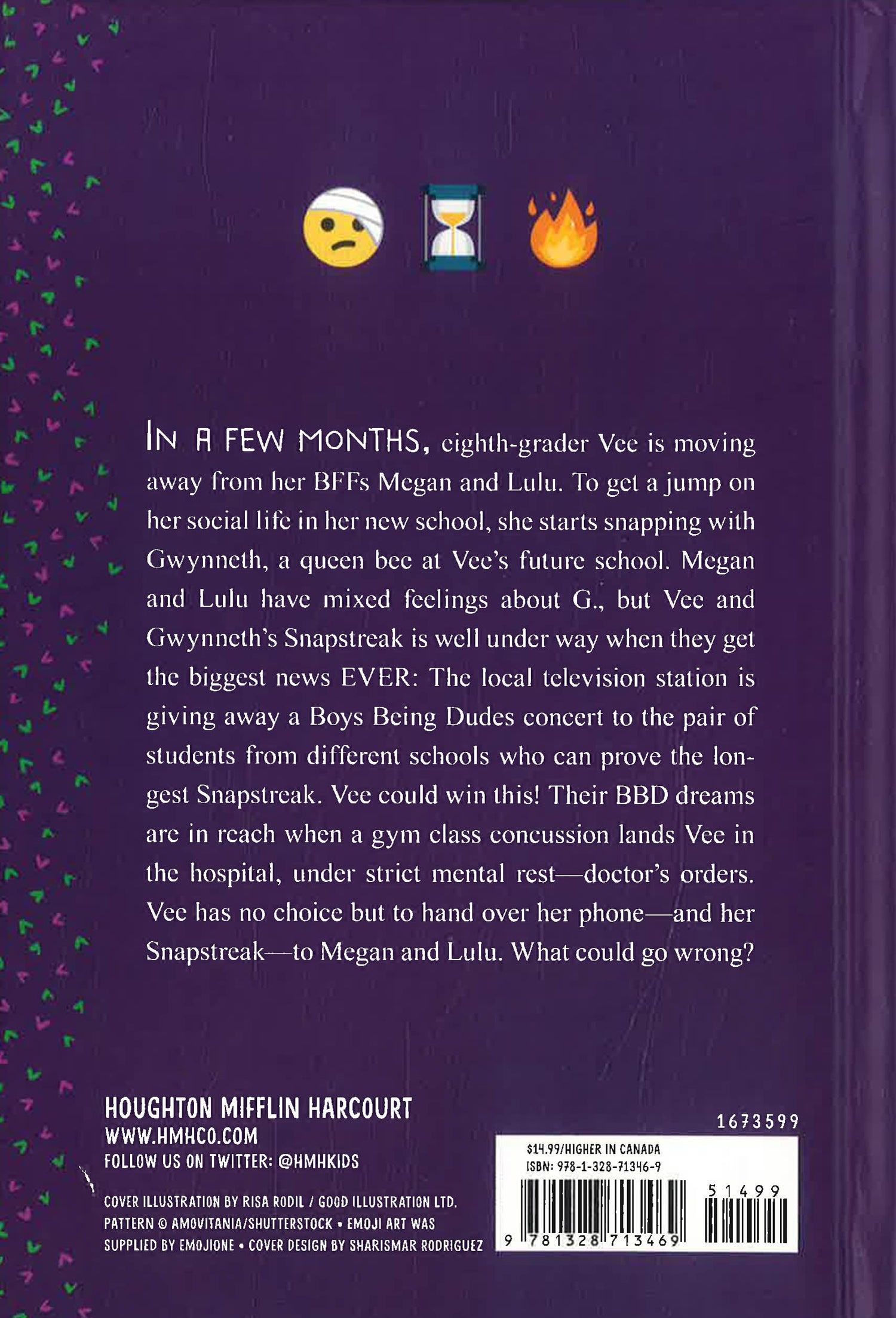 To get a jump on her new social life, she starts snapping with local Queen Bee, Gwynneth. Megan and Lulu have mixed feelings about G., but Vee's snapstreak with her is well under way when they get the biggest news EVER: The local radio station is hosting a Boys Being Dudes concert for the pair of students from different schools who can prove the longest running snapstreak! Vee could win this! The girls' BBD dreams are in reach when a gym class concussion lands Vee in bed, under a strict phone ban. It's up to Megan and Lulu to keep the streak going.