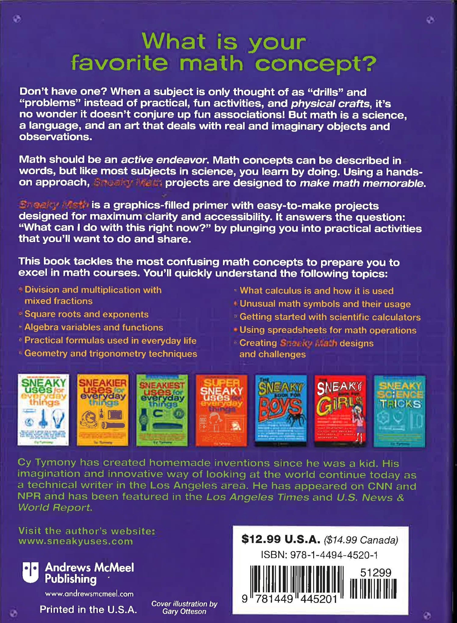 Cy Tymony, author of the best-selling Sneaky Uses series, brings his unique, fun hands-on learning approach to all things math. Many people fear math and numbers, even Barbie, who famously said "Math class is tough" in her controversial 1992 talking doll version. But in Sneaky Math, Cy Tymony takes tough and turns it into triumph. He shows us how math is all around us through intriguing and easy projects, including 20 pass-along tools to complement math education programs.