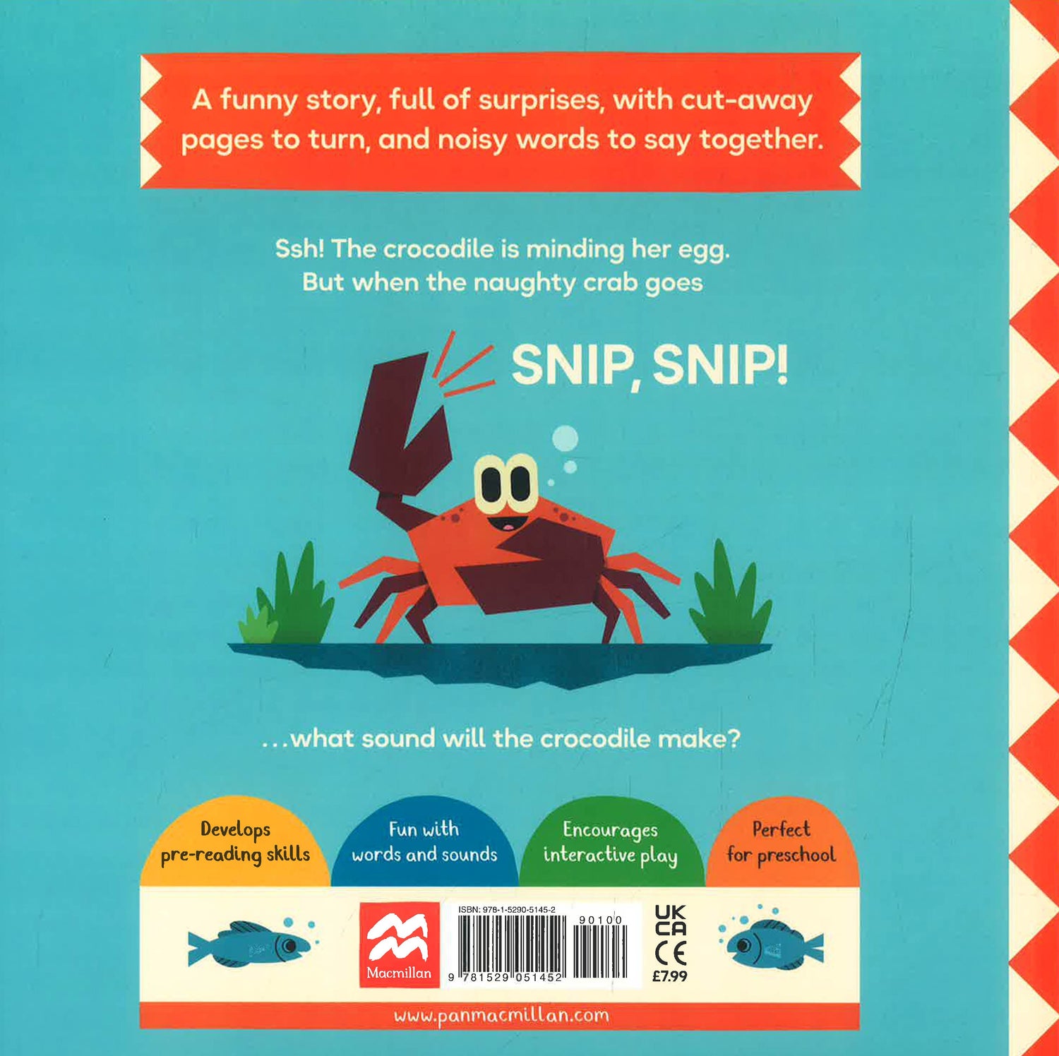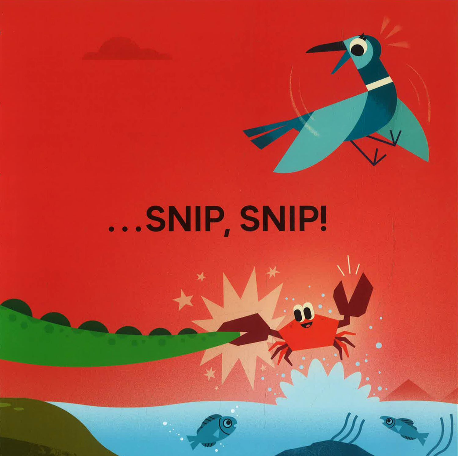 It's peaceful and quiet by the river bank, where an unsuspecting crocodile watches over her eggs. But when a naughty crab goes SNIP! SNIP! both noise and mayhem follow. SPLISH-SPLASH . . . WOBBLE-WOBBLE . . . CRICK-CRACK - and all from one naughty little nip!