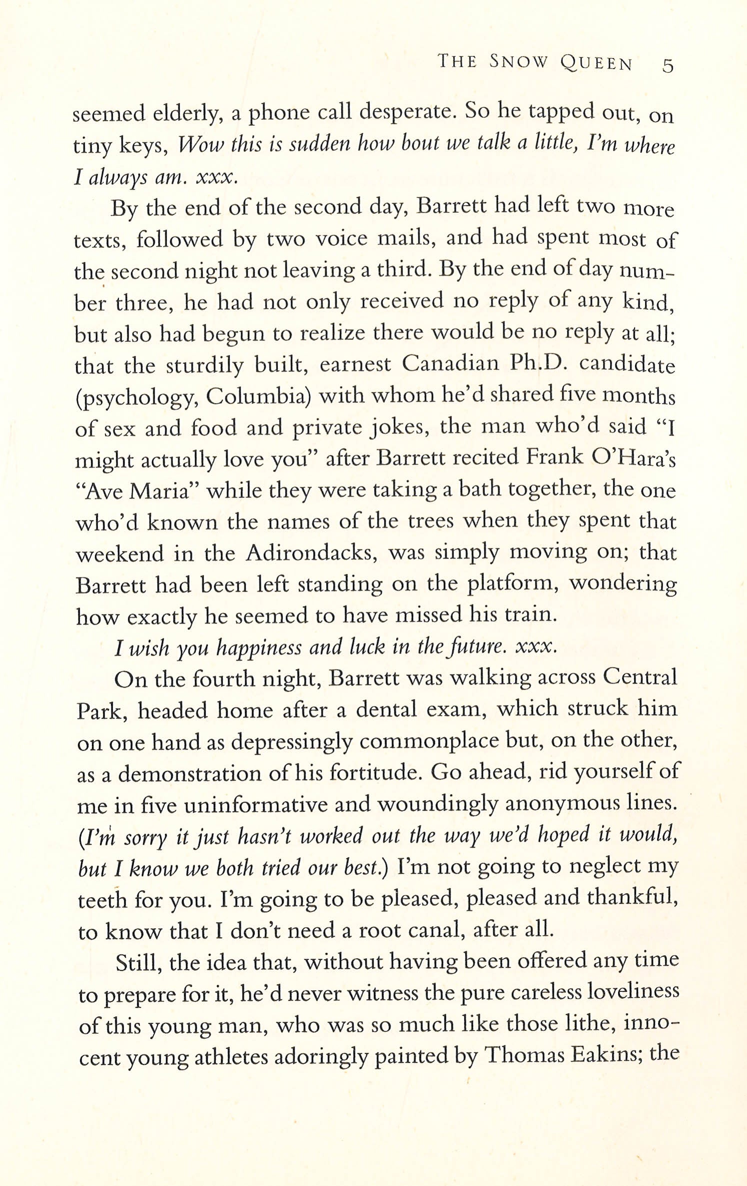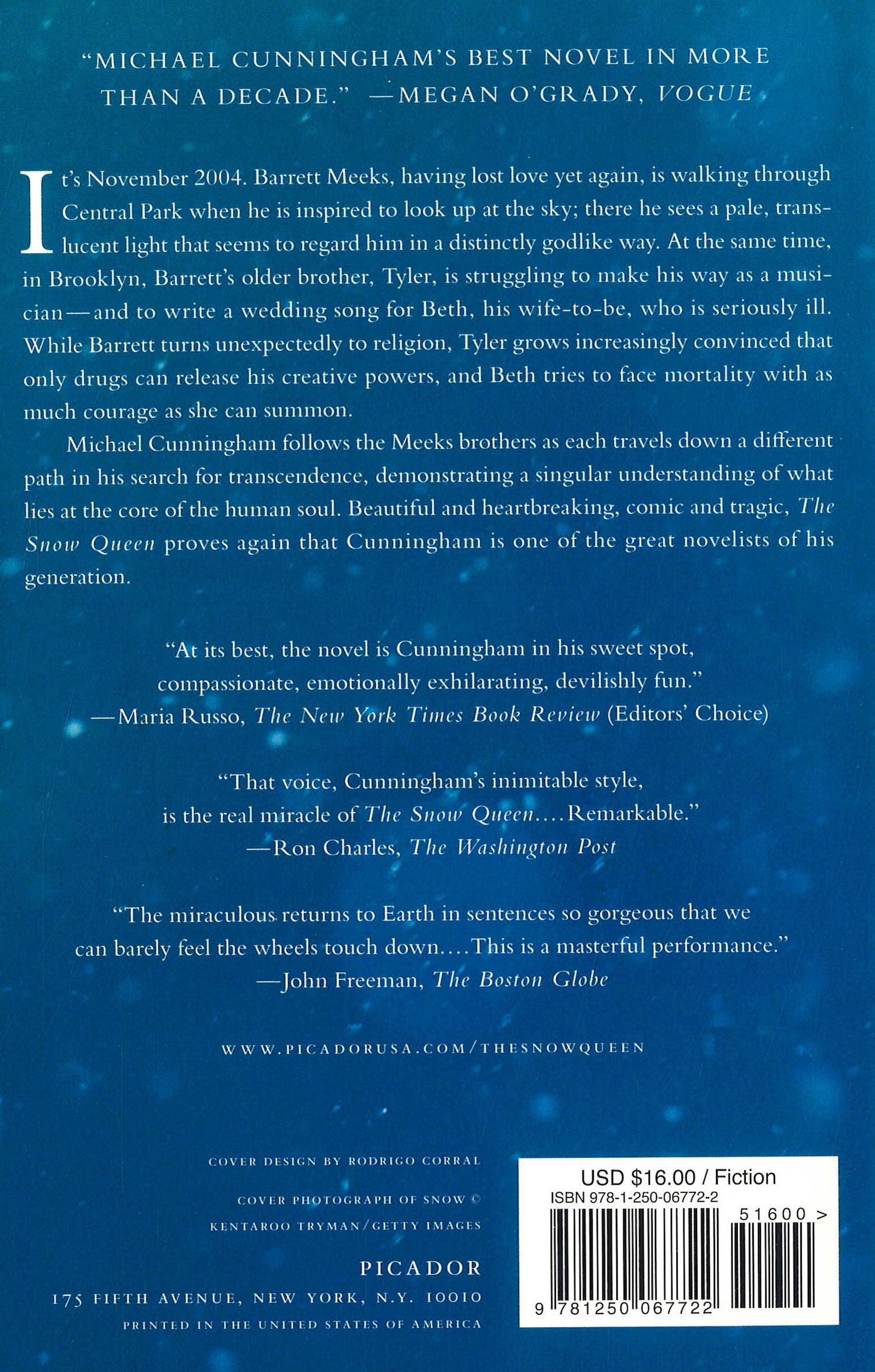 Pulitzer Prize-Winning Author of The HoursMichael Cunningham's best novel in more than a decade.-Megan O'Grady, VogueIt's November 2004. Barrett Meeks, having lost love yet again, is walking through Central Park when he is inspired to look up at the sky; there he sees a pale, translucent light that seems to regard him in a distinctly godlike way. At the same time, in Brooklyn, Barrett's older brother, Tyler, is struggling to make his way as a musician-and to write a wedding song for Beth, his wife-to-be, who is seriously ill. While Barrett turns unexpectedly to religion, Tyler grows increasingly convinced that only drugs can release his creative powers, and Beth tries to face mortality with as much courage as she can summon.Michael Cunningham follows the Meeks brothers as each travels down a different path in his search for transcendence, demonstrating a singular understanding of what lies at the core of the human soul. Beautiful and heartbreaking, comic and tragic, The Snow Queen proves again that Cunningham is one of the great novelists of his generation.