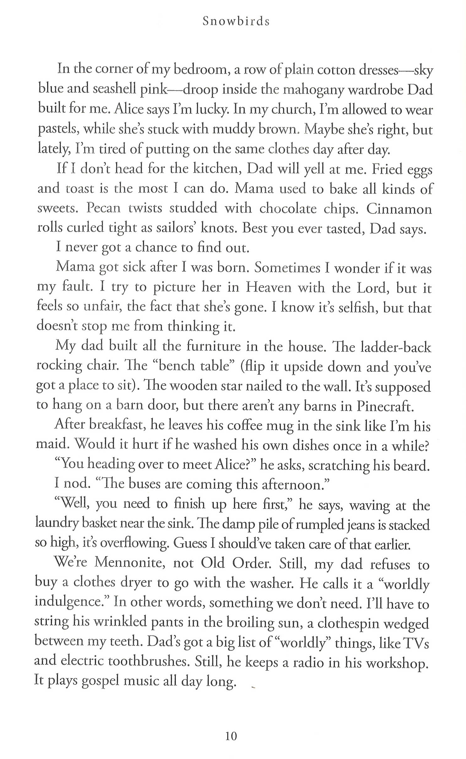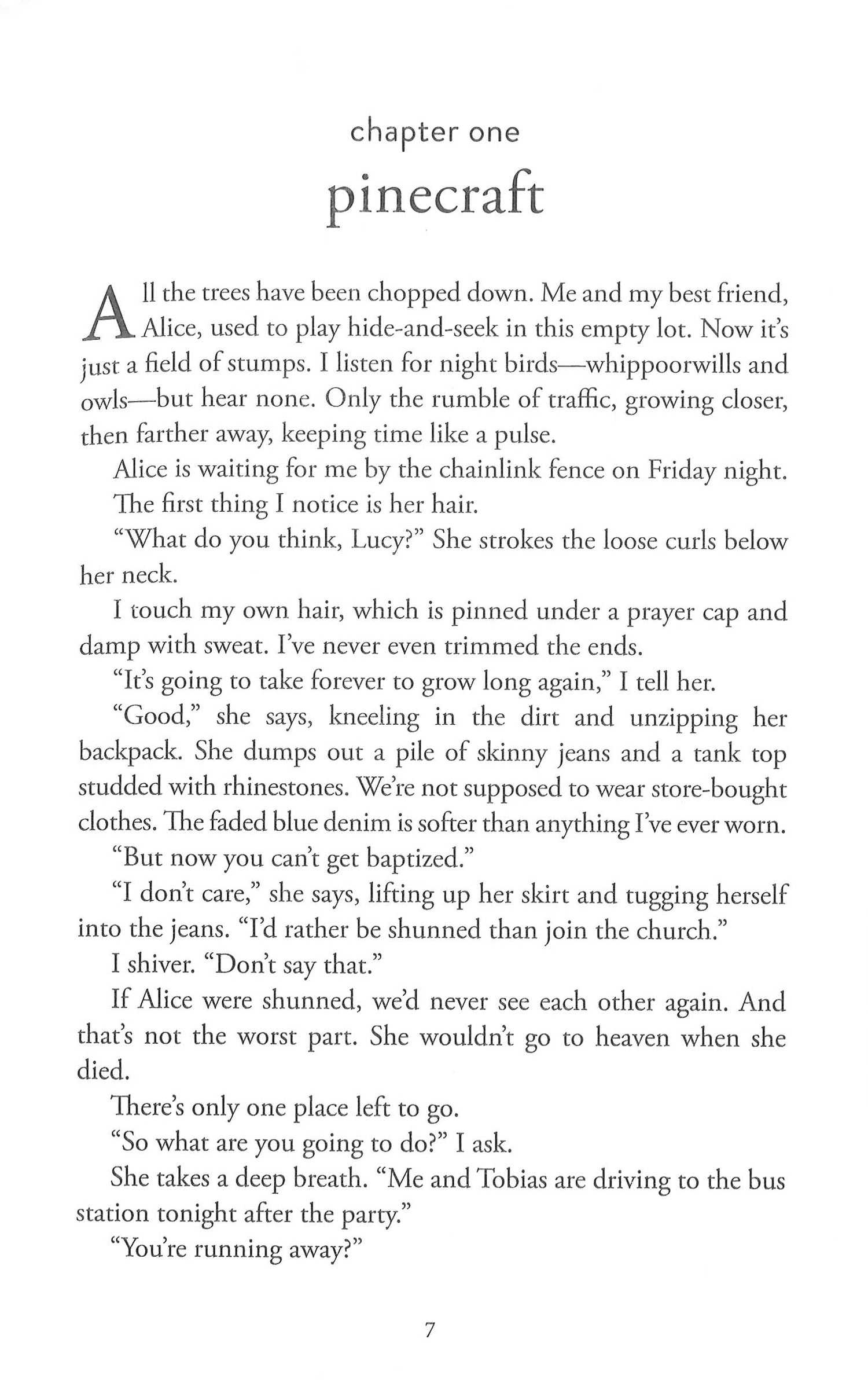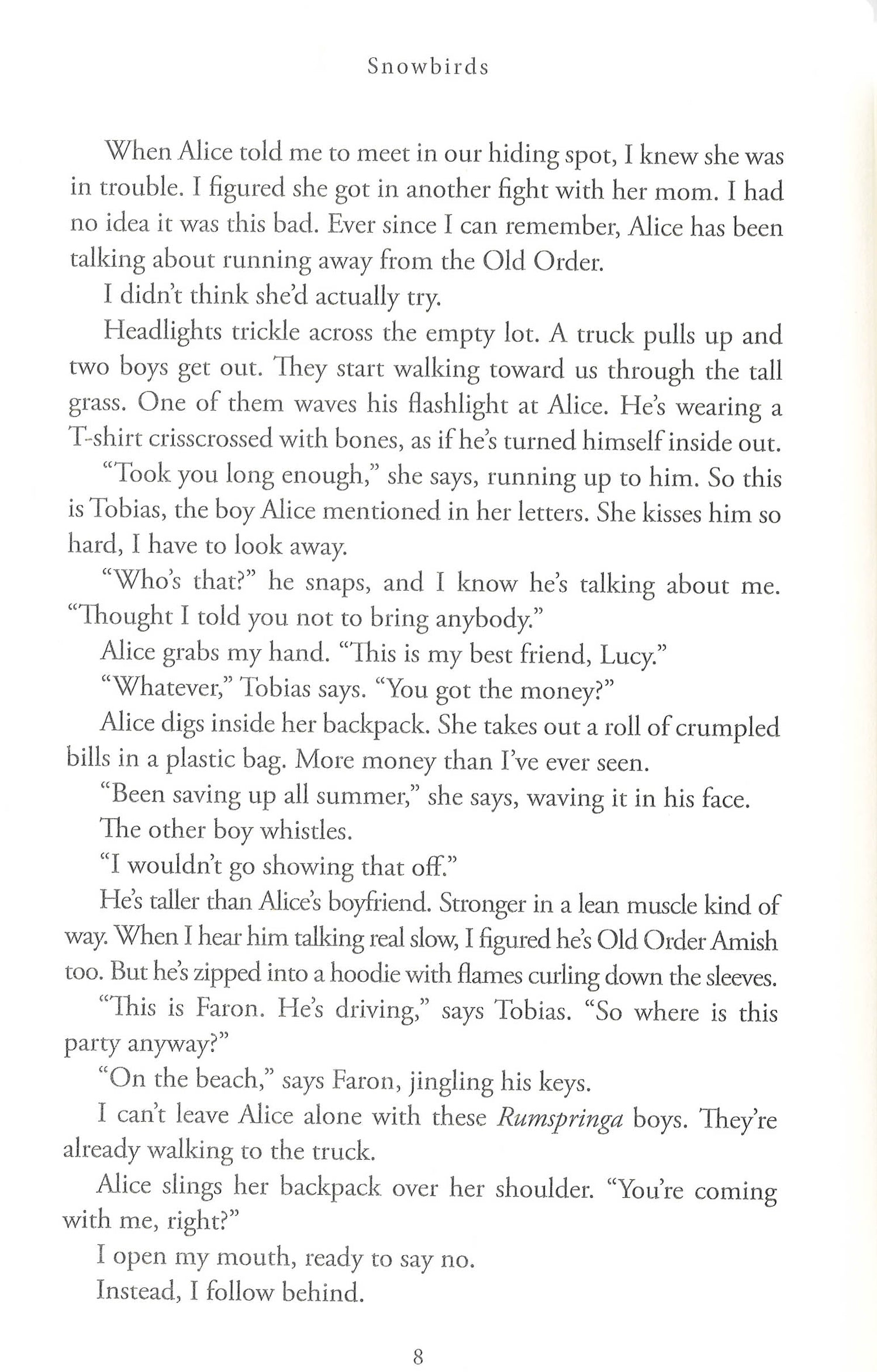 Every year, Lucy waits eagerly for the arrival of the "snowbirds," the Old Order Amish who come trundling into Florida on buses from the north, bringing Lucy's best friend Alice, with whom she's spent every winter she can remember. This winter is different. At sixteen, Alice is in the middle of "Rumspringa," a season in which Amish teens try out forbidden temptations, in order to get them out of their system. Lucy is part of a different sect, in which teens aren't allowed such bold experimentation, and she's fighting to keep up as Alice races from one wild party to the next. Then, one night after just such a party, Alice vanishes. Wracked by guilt, Lucy knows that she should have been watching out for Alice, but instead, she was kissing Faron, an Older Order boy shunned by his society. Now, Lucy plunges into a search for her best friend--while also hiding her own secret, which could put her in even more danger.
