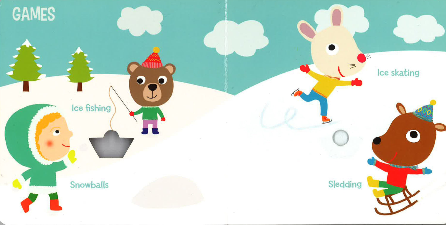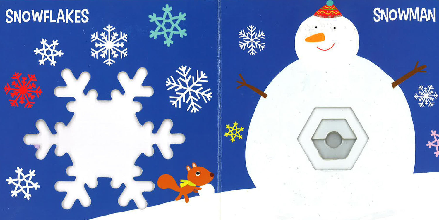 A holiday-themed, highly stylized, colorful novelty book! Introduce little ones to winter concepts with this interactive board book in which snowy scenes transform with each turn of the page! Little ones will love the die-cuts on each page which form snowflakes, snowmen, scarves, hats, trees, and a cabin, creating an interactive and sensory experience to stimulate development.