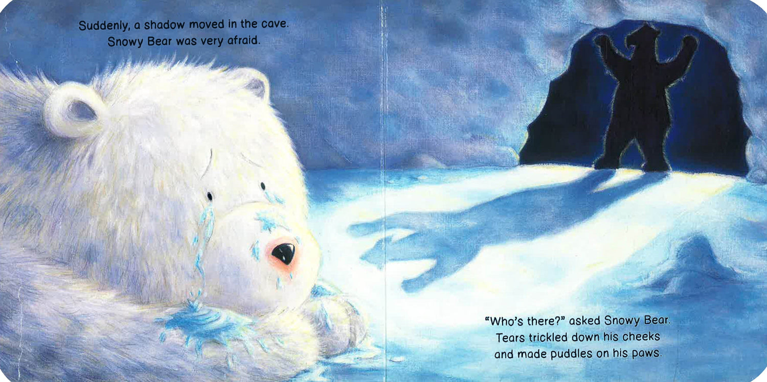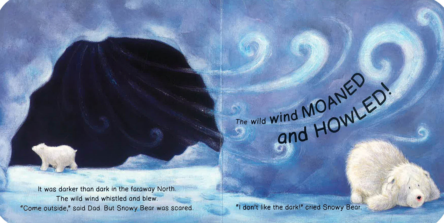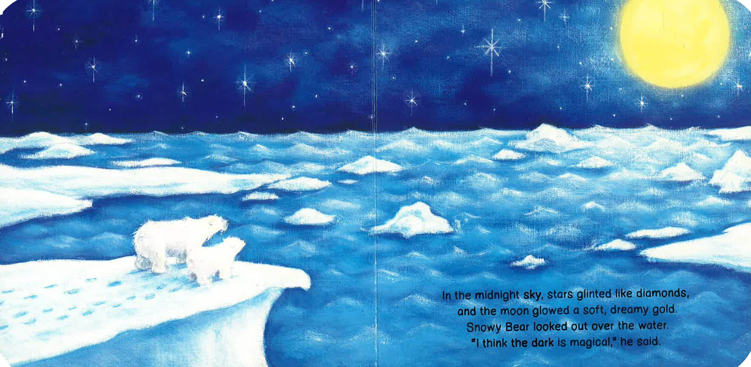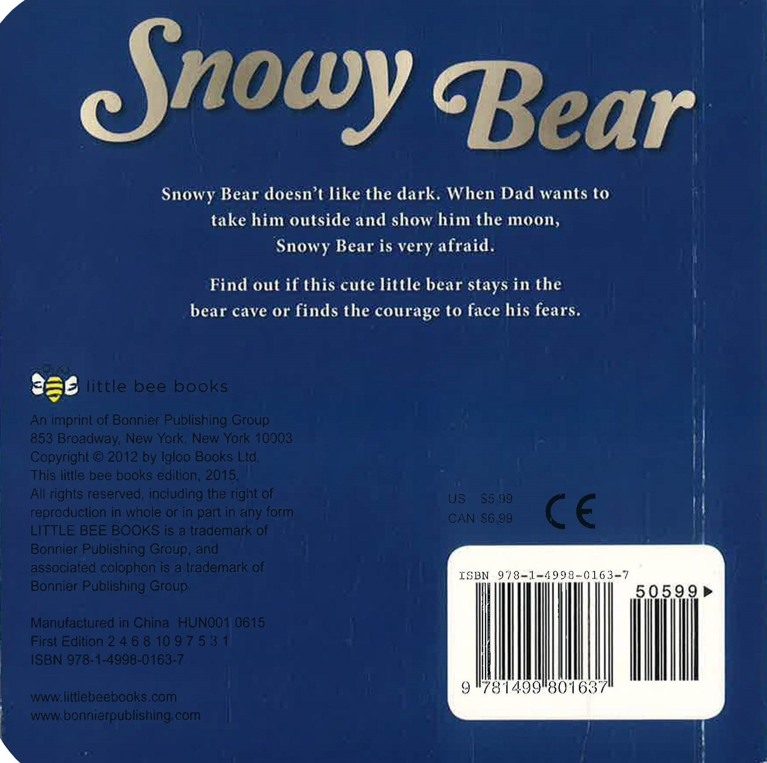 Snowy Bear doesn't like the dark. When Dad wants to take him outside and show him the moon, Snowy Bear is very afraid. But when Grandad leads Snowy Bear outside to face his fears, Snowy Bear sees how beautiful the stars are, and everyone says how brave he is!