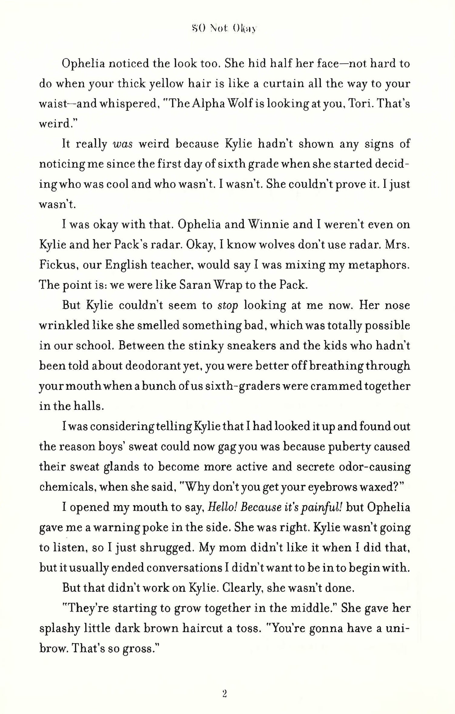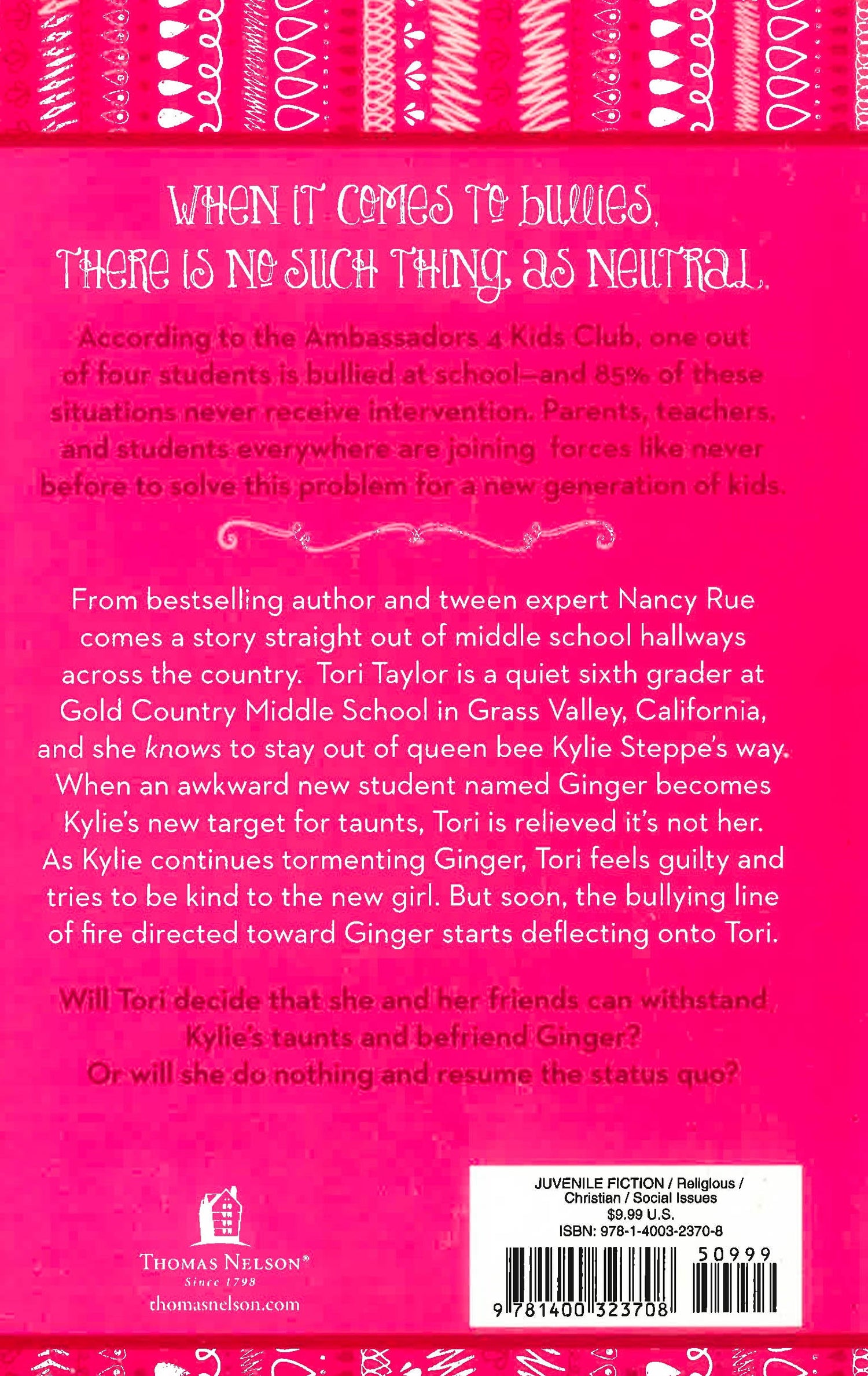 There is no such thing as neutral. According to the Ambassadors 4 Kids Club, one out of every four students is bullied-and 85% of these situations never receive intervention. Parents, students, and teachers alike have amped up the discussion of how to solve the bullying problem for a networked generation of kids. Written by bestselling author, Nancy Rue, each book in the Mean Girl Makeover trilogy focuses on a different character's point of view: the bully, the victim, and the bystander. Each girl has a different personality so that every reader can find a character she relates to. The books, based on Scripture, show solid biblical solutions to the bullying problem set in a story for kids. So Not Okay tells the story of Tori Taylor, a quiet sixth grader at Gold Country Middle School in Grass Valley, California. Tori knows to stay out of the way of Kylie, the queen bee of GCMS. When an awkward new student named Ginger becomes Kylie's new target, Tori whispers a prayer of thanks that it's not her. But as Kylie's bullying of Ginger continues to build, Tori feels guilty and tries to be kind to Ginger. Pretty soon, the bullying line of fire directed toward Ginger starts deflecting onto Tori, who must decide if she and her friends can befriend Ginger and withstand Kylie's taunts, or do nothing and resume their status quo. Tori's decision dramatically changes her trajectory for the rest of the school year. Features & Benefits:
