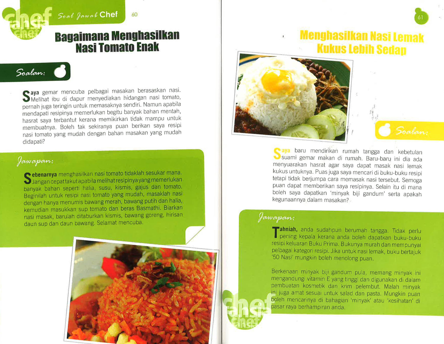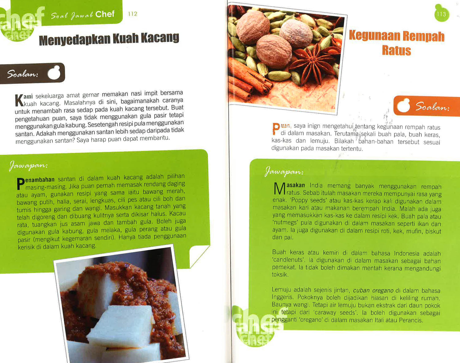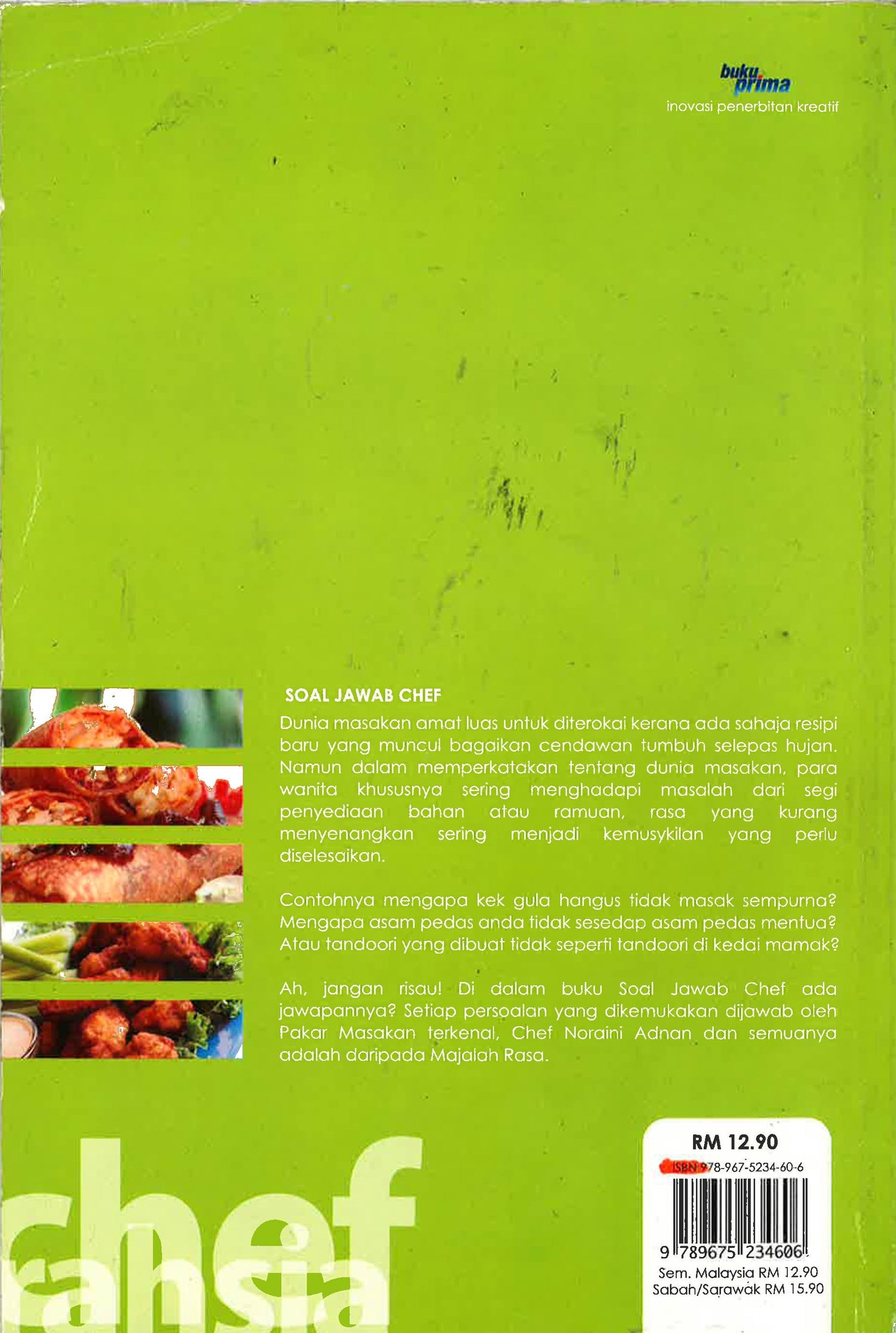Dunia masakan amat luas untuk diterokai kerana ada sahaja resipi baru yang muncul bagaikan cendawan tumbuh selepas hujan. Namun dalam memperkatakan tentang dunia masakan, para wanita khususnya sering mengahadapi masalah dari segi penyediaan bahan atau ramuan, rasa yang kurang menyenangkan sering menjadi kemusykilan yang perlu diselesaikan. Contohnya mengapa kek gula hangus tidak masak sempurna? Mengapa asam pedas anda tidak sesedap asam pedas mentua? Atau tandoori yang dibuat tidak seperti tandoori di kedai mamak? Ah, jangan risau! Di dalam buku Soal Jawab Chef ada jawapannya? Setiap persoalan yang dikemukakan dijawab oleh Pakar Masakan terkenal, Chef Noraini Adnan dan semuanya adalah daripada Majalah Rasa.