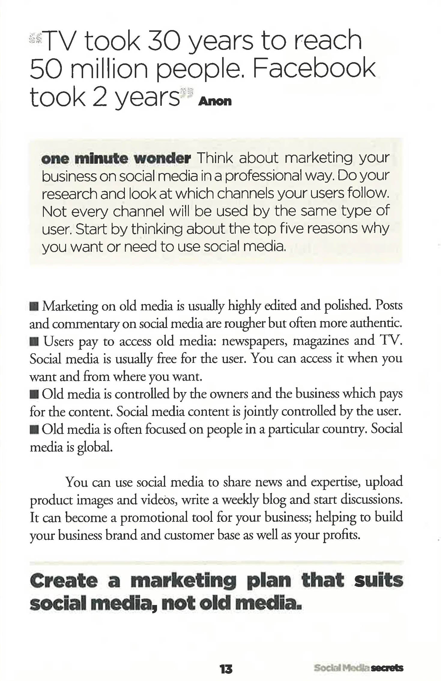 The social media secrets that experts and top professionals use. Get results fast with this quick, easy guide to the fundamentals of social media for business.Includes how to:* Plan* Promote* Post* Position* Monitor* Be real* Be ethical