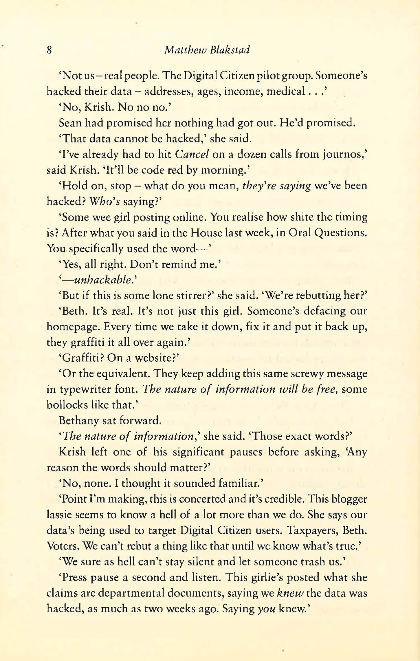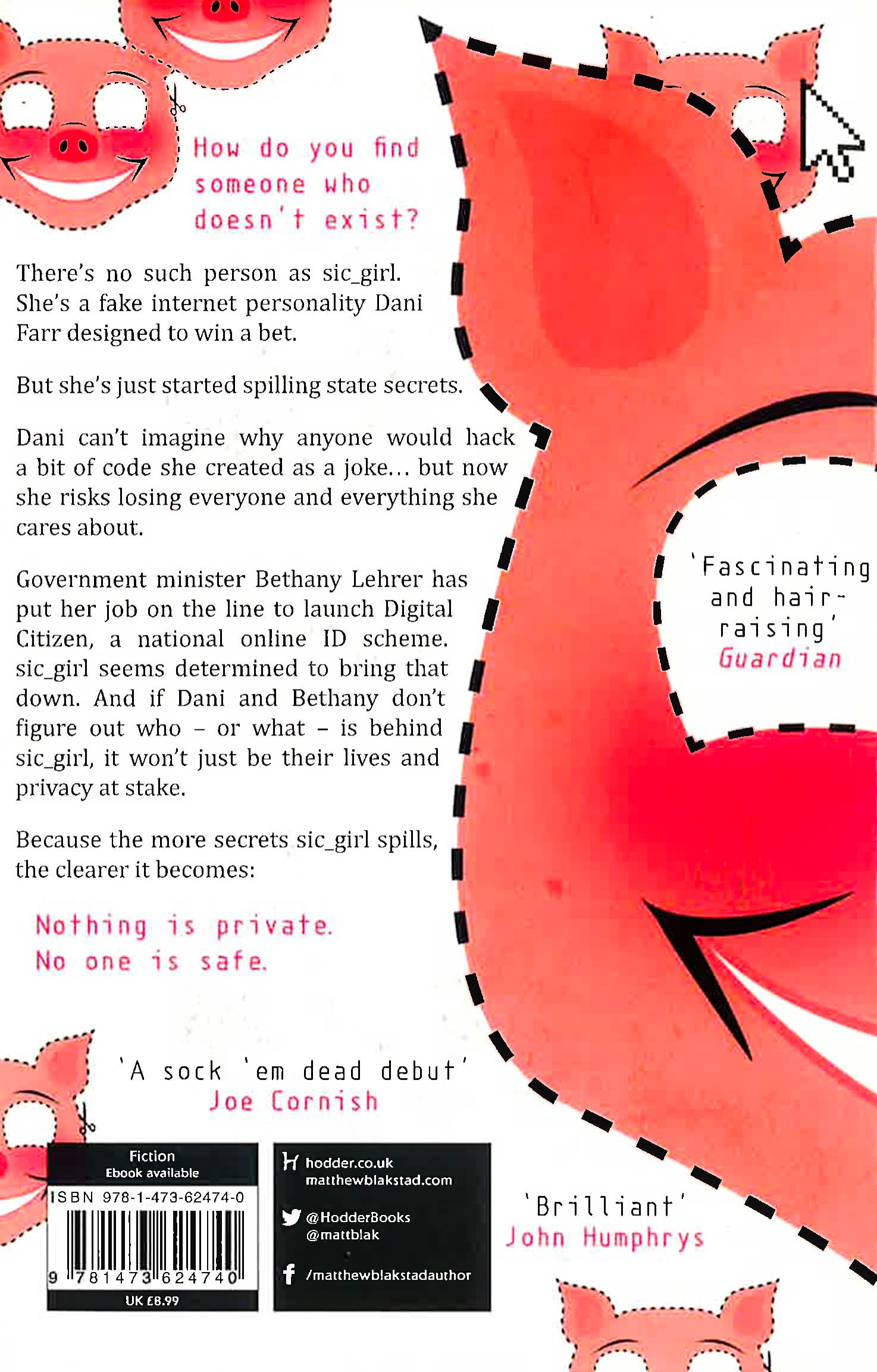You shared your life online. Now how will you get it back?There's no such person as sic_girl. She's just a piece of code, a fake internet personality turned internet celebrity that Dani Farr designed to win a bet.But she's just started spilling state secrets.Dani can't imagine why anyone would hack a bit of code she created as a joke... but sic_girl has Dani in her sights, and now she risks losing everyone and everything she cares about.Government minister Bethany Lehrer has put her job on the line to launch Digital Citizen, a national online ID scheme. sic_girl seems determined to bring that down. And if Dani and Bethany don't figure out who - or what - is behind sic_girl, it won't just be their lives and privacy at stake. Because the more secrets sic_girl spills, the clearer it becomes:Nothing is private.No one is safe.