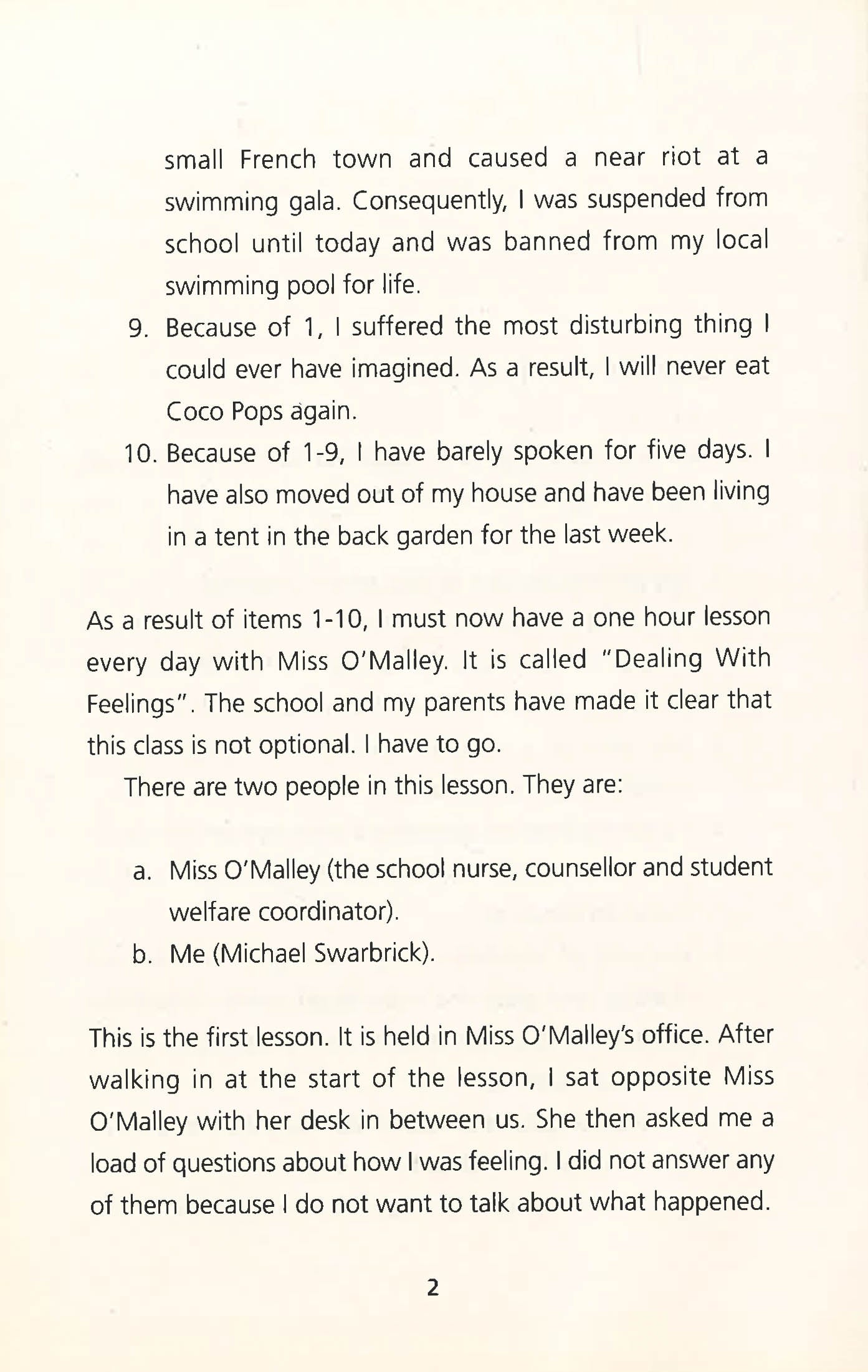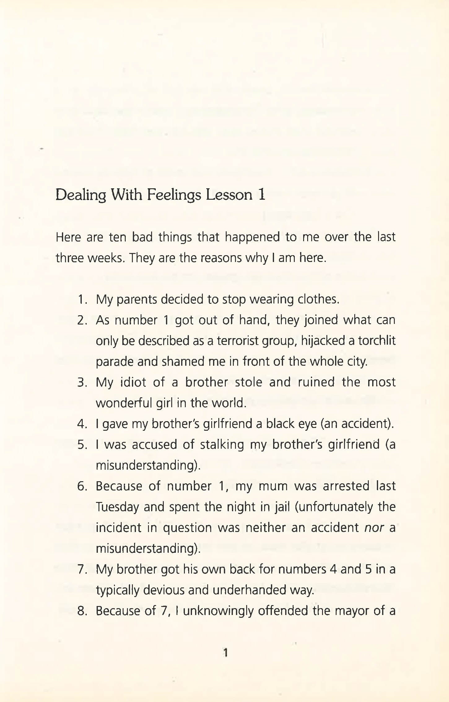 Mike Swarbrick's life couldn't get any worse. His pervy best friend gets him embroiled in a scandal involving the girls' changing rooms, his idiot of an older brother is snogging the girl of his dreams and he's just come home early from school to discover his parents are secret nudists...but they're ready to go public! A chain of events beyond his control are set to RUIN HIS LIFE. But instead, his teachers think that he's having trouble dealing with his feelings. The result is that Mike's forced to meet with the school councillor who thinks that a cool university professor can fix his problems. And so begins Mike's Chats with Chas which really are as humiliating and cringe-worthy as they sound...