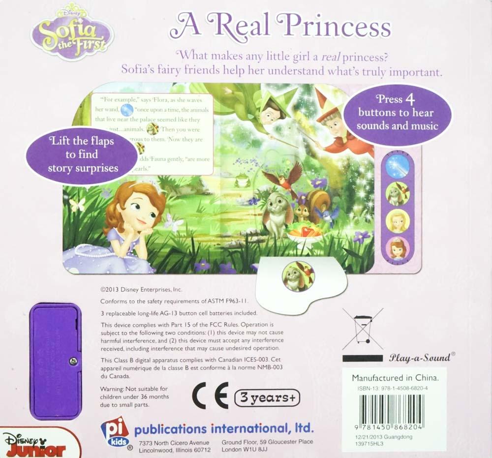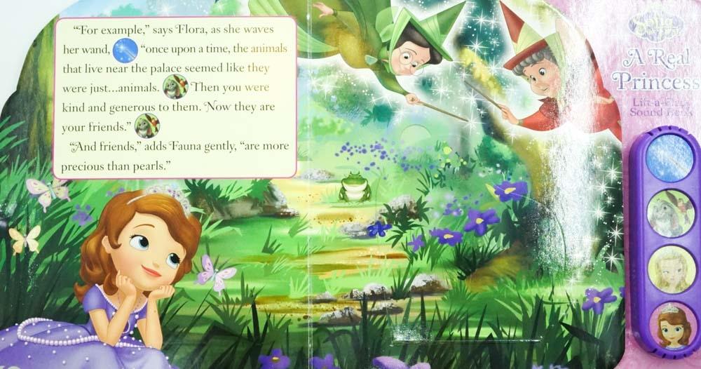 The book features one lift up flap on each spread. When the child lifts a flap, he / she finds an icon that matches a sound trigger on the module. Each book has 4 sound buttons matched to the icon. Sofia's convinced that she'll never be a real princess! But when her fairy teachers at Royal Prep use their magic to remind her of her good deeds, she realizes that being a princess is about what you do not how you look.