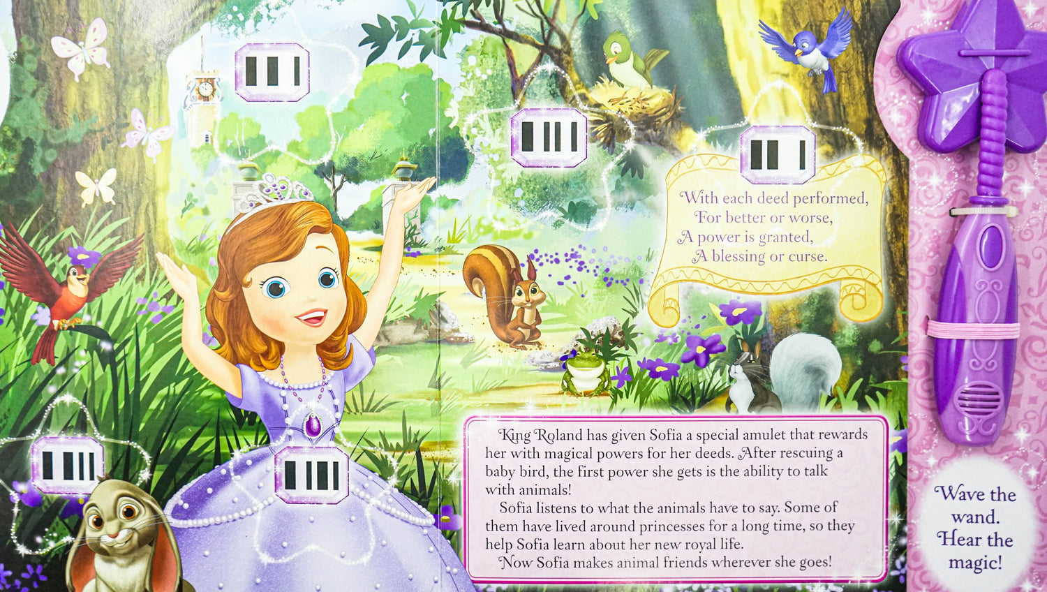 Use the wand to hear magical sounds! Find out what it takes for Sofia to become a real princess. Be a part of Sofia's enchanting new world with a wave of your wand!A delightful combination for your little princess-a lovely storybook, a magic wand, and lots of hidden sound surprises. Wave the wand in the air, or press it on the bar codes printed in the book, to hear magical music and sparkly sounds. A hand-held magic wand plays 3 magical sound effects when waved in the air, and other story-based sounds when touched to barcodes in the art. 25 sounds included.