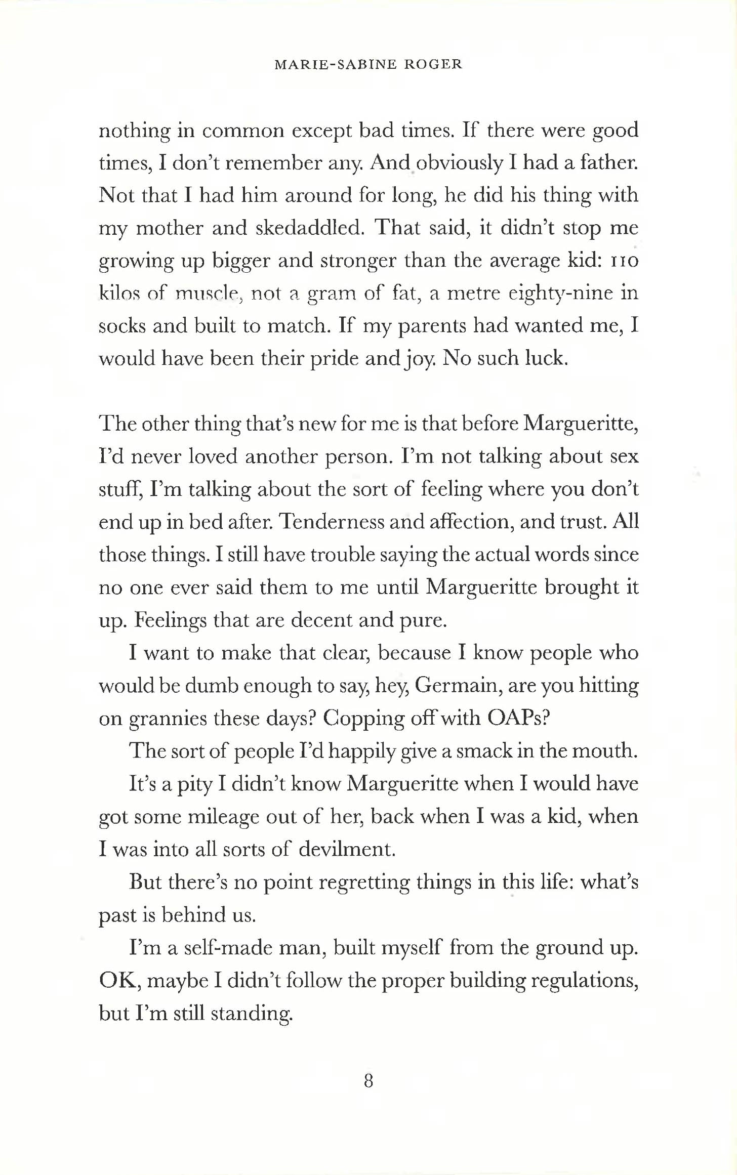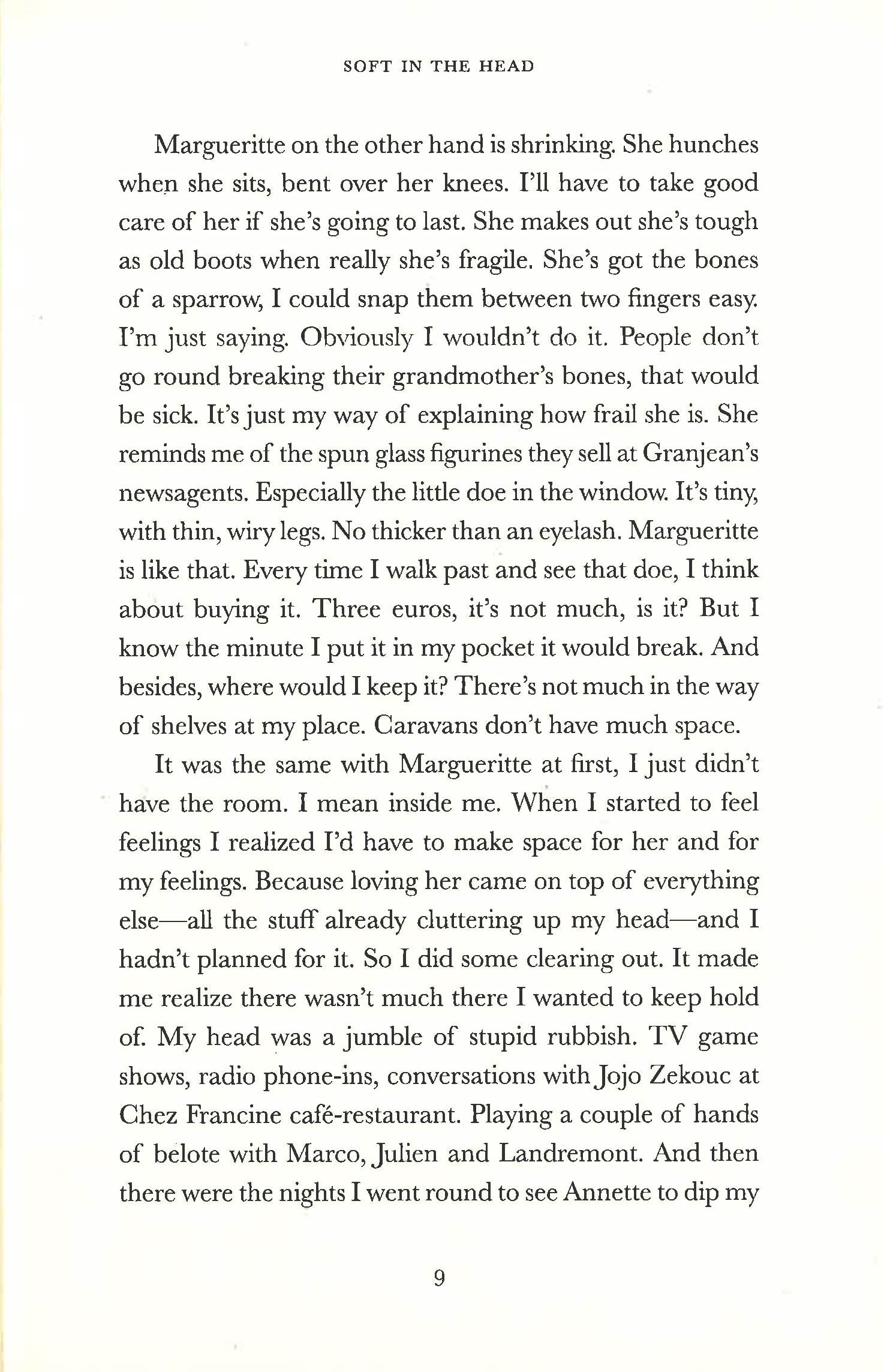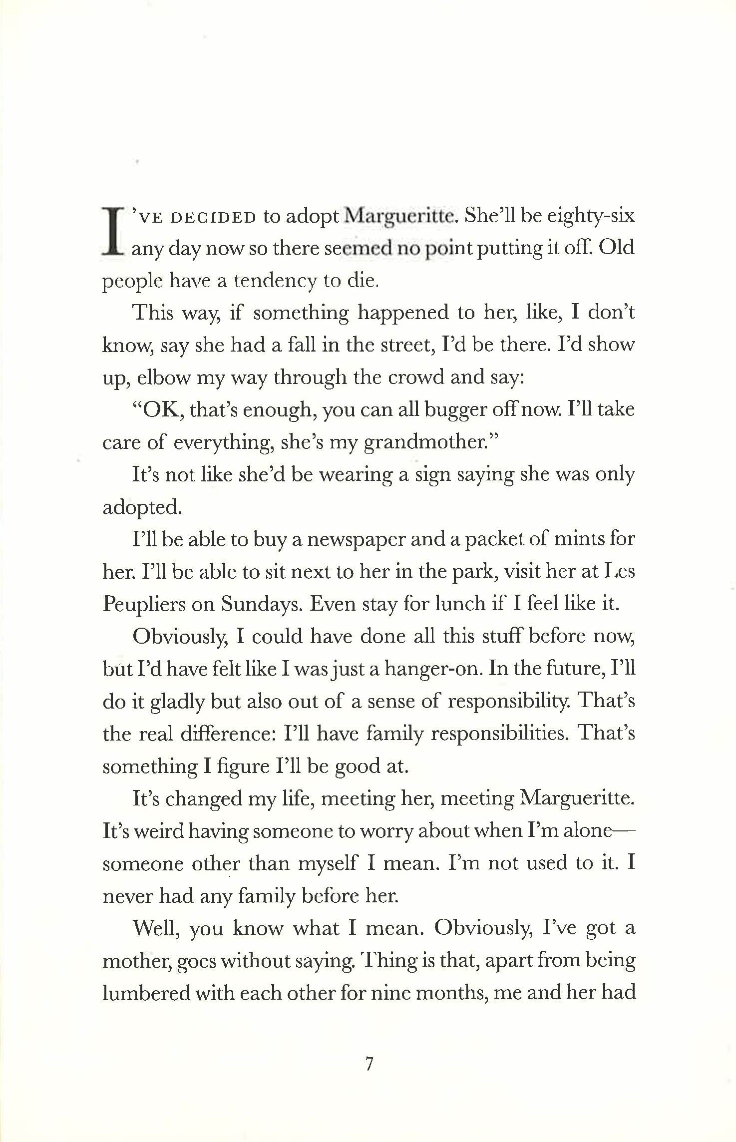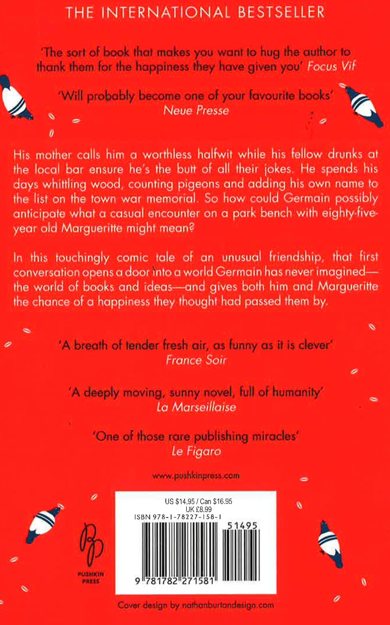 His mother calls him a worthless halfwit while his fellow drunks at the local bar ensure he's the butt of all their jokes. He spends his days whittling wood, counting pigeons and adding his own name to the list on the town war memorial. So how could Germain possibly anticipate what a casual encounter on a park bench with eighty-five-year old Margueritte might mean? In this touchingly comic tale of an unusual friendship, that first conversation opens a door into a world Germain has never imagined--the world of books and ideas--and gives both him and Margueritte the chance of a happiness they thought had passed them by.