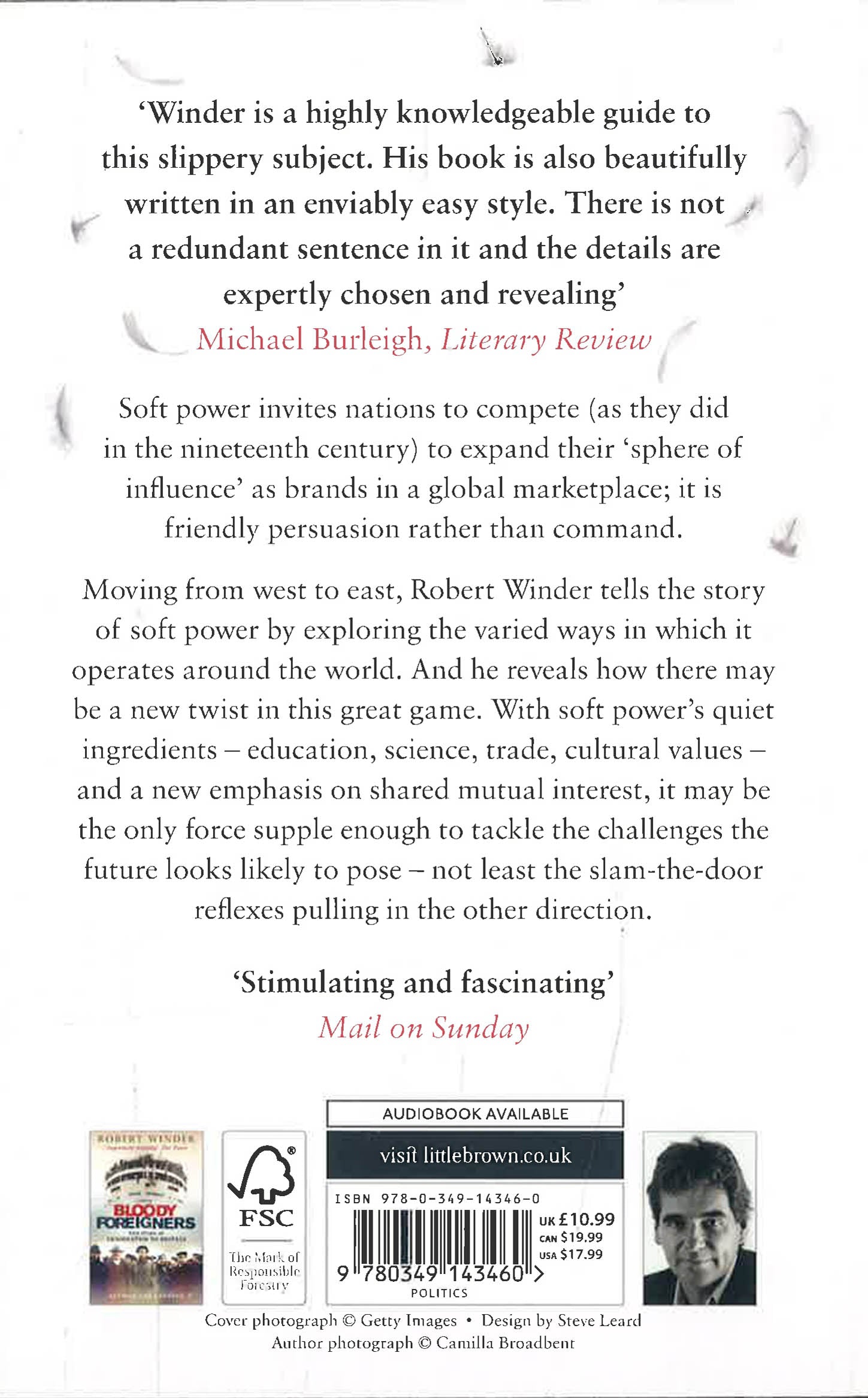In recent years the modern world has developed a brave new concept: 'soft power'. It is the power of friendly persuasion rather than command, and it invites nations to compete (as they did in the nineteenth century) to expand their 'sphere of influence' as brands in a global marketplace. In Bloody Foreigners and The Last Wolf, Robert Winder explored the way Britain was shaped first by migration, and then by hidden geographical factors. Now, in Soft Power he reveals the ways in which modern states are asserting themselves not through traditional realpolitik but through alternative means: business, language, culture, ideas, sport, education, music, even food - the texture and values of history and daily life. Moving from West to East, the book tells the story of soft power by exploring the varied ways in which it operates - from an American sheriff in Poland to an English garden in Ravello, a French vineyard in Australia, an Asian restaurant in Spain, a Chinese Friendship Hall in Sudan; the fact that fifty-eight modern heads of state were educated in Britain; the student exchange that took a teenage Deng Xiaoping to a small town on the Loire; the way that Japan could seduce the world with chic food and smart computer games. Now there may be a new twist in this Great game. With soft power's quiet ingredients - education, science, trade, cultural values - and a new emphasis on shared mutual interest, it may be the only force supple enough to tackle the challenges the future looks likely to pose - not least the slam-the-door reflexes pulling in the other direction.