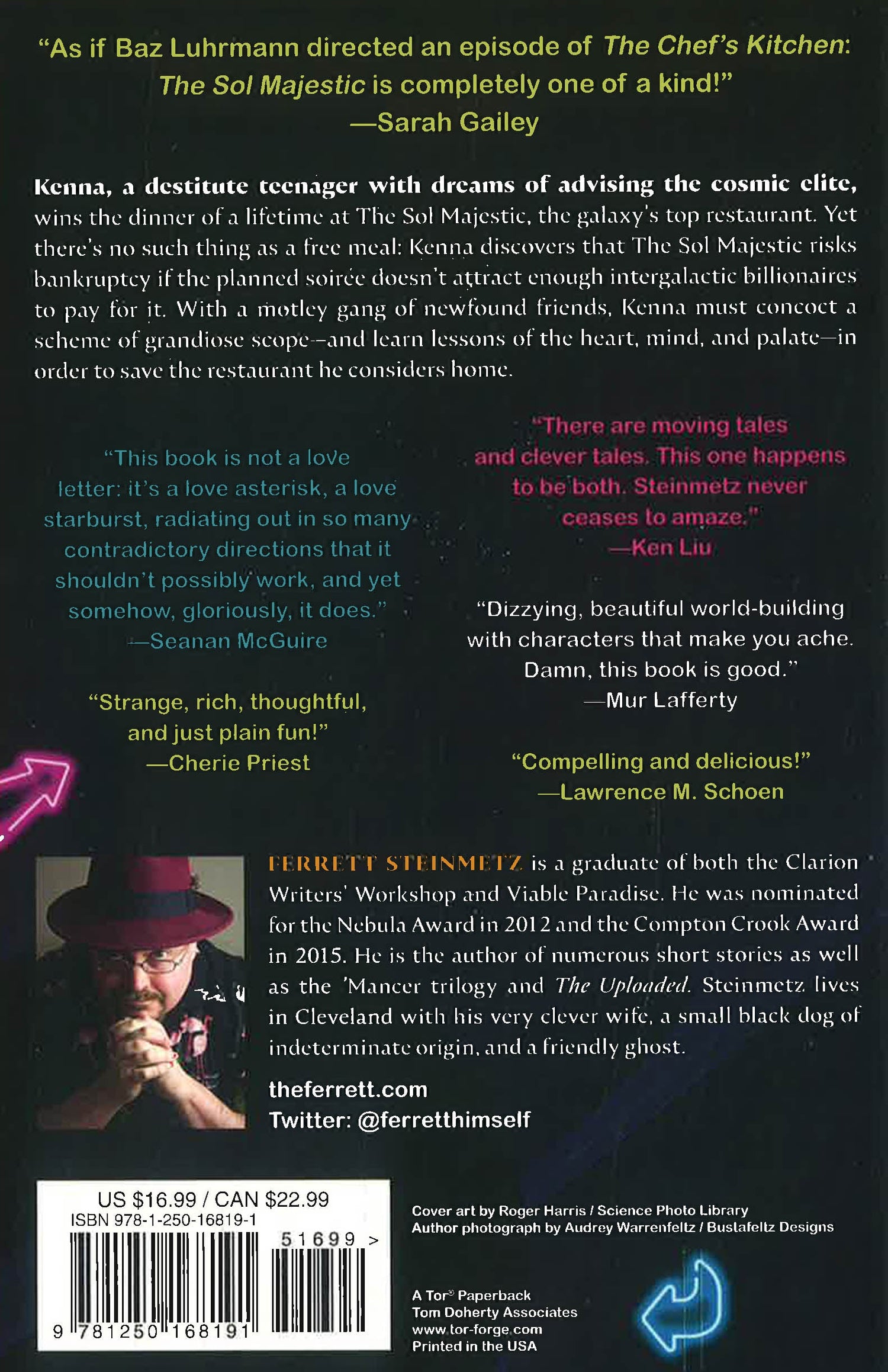 Everything changes when Kenna wins a free dinner at The Sol Majestic, the galaxy's most renowned restaurant, giving him access to the cosmos's one-percent. His dream is jeopardized, however, when he learns his highly-publicized "free meal" risks putting The Sol Majestic into financial ruin. Kenna and a motley gang of newfound friends--including a teleporting celebrity chef, a trust-fund adrenaline junkie, an inept apprentice, and a brilliant mistress of disguise--must concoct an extravagant scheme to save everything they cherish. In doing so, Kenna may sacrifice his ideals--or learn even greater lessons about wisdom, friendship, and love.