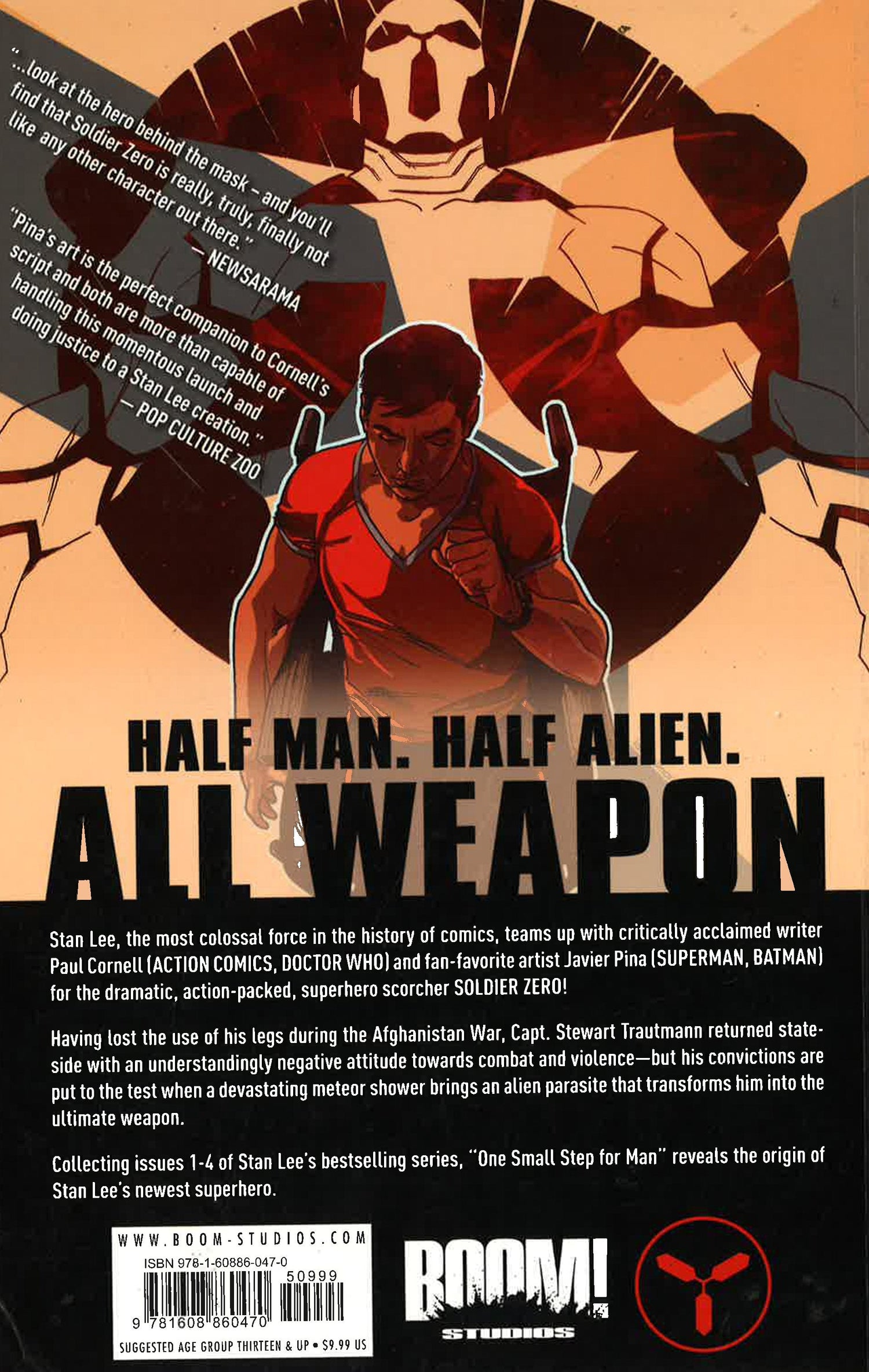 Legendary creator Stan Lee brings you a new kind of hero. Half Human. Half Alien. All Weapon. Stan Lee, the great innovator of the entertainment industry, teams up with BOOM! Studios to deliver a brand new line of superhero comics. Stan is joined by critically acclaimed writer Paul Cornell (ACTION COMICS, DOCTOR WHO) and artist Javier Pina (SUPERMAN, BATMAN) for a modern take on classic superhero storytelling. When an alien parasite falls to Earth, wheelchair-bound war veteran Stewart Travers becomes infected, and goes through super-human changes that no mortal could imagine. Forced into a galactic war that's chosen Earth as the battlefield, Stewart defends the front line as SOLIDER ZERO. Half Human. Half Alien. All Weapon.