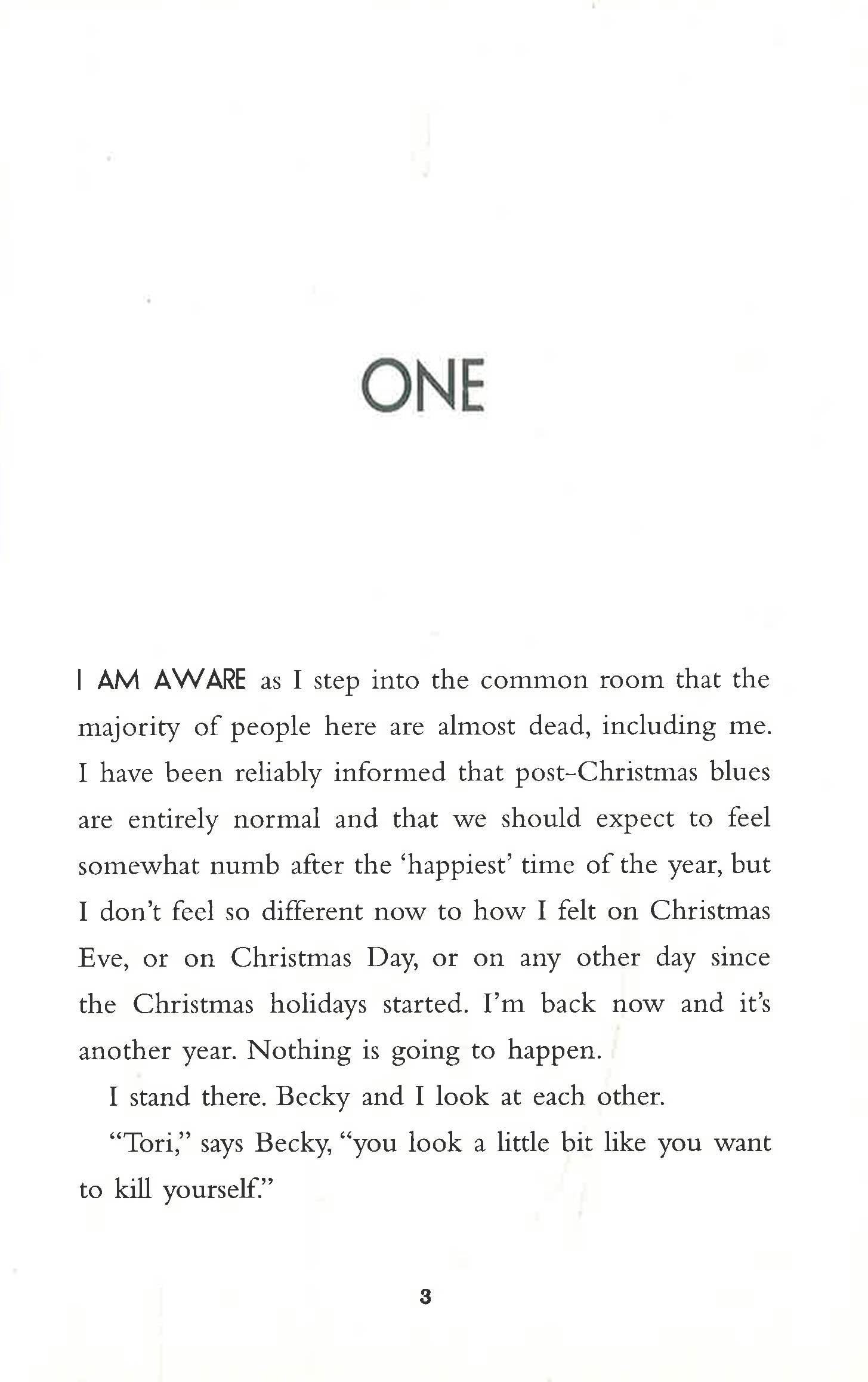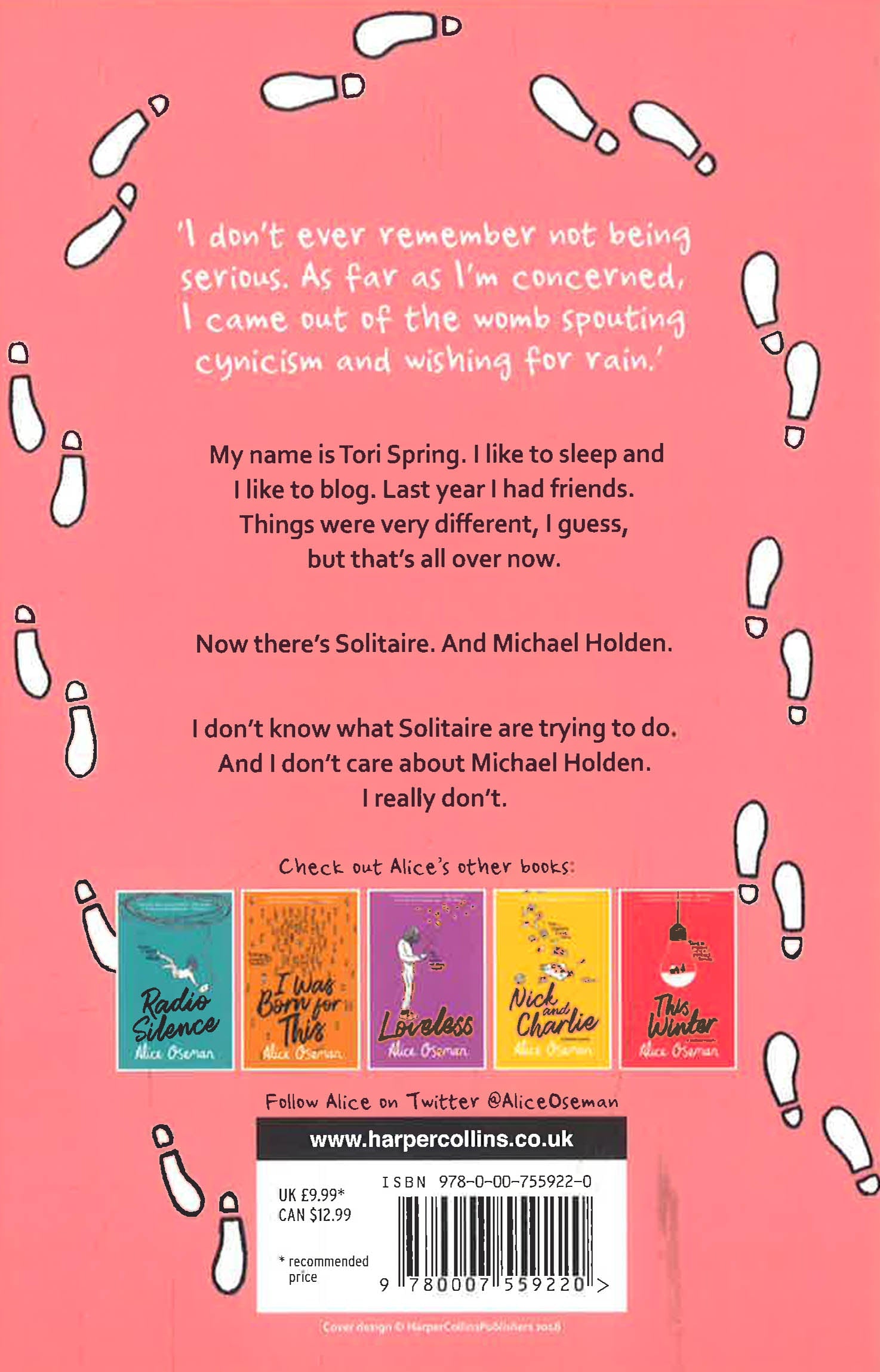 My name is Tori Spring. I like to sleep and I like to blog. Last year - before all that stuff with Charlie and before I had to face the harsh realities of A-Levels and university applications and the fact that one day I really will have to start talking to people - I had friends. Things were very different, I guess, but that's all over now. Now there's Solitaire. And Michael Holden. I don't know what Solitaire are trying to do, and I don't care about Michael Holden. I really don't.