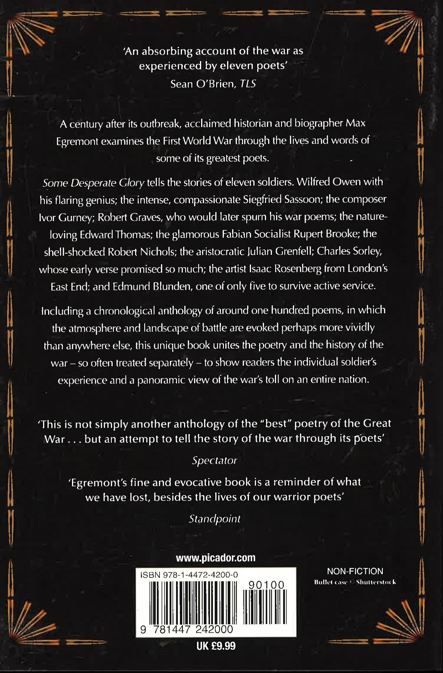 Some Desperate Glory includes a chronological anthology of their poems, with linking commentary, telling the story of the war through their art. This unique volume unites the poetry and the history of the war, so often treated separately, granting readers the pride, strife, and sorrow of the individual soldier’s experience coupled with a panoramic view of the war’s toll on an entire nation.
