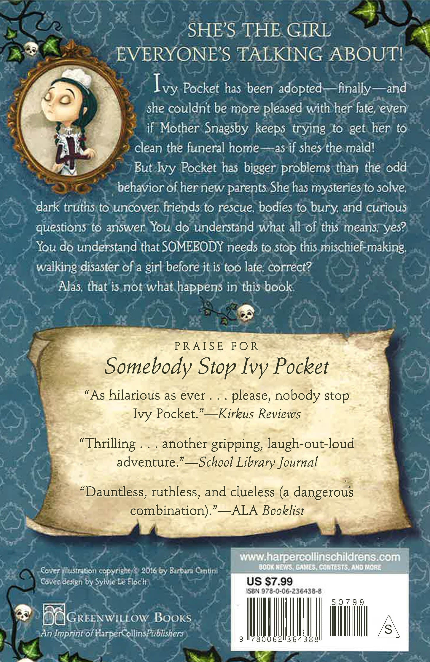 Everyone seems to want a piece of Ivy Pocket. Her adoptive parents keep trying to get her to clean the funeral home, even though Ivy's certain she's already the picture of a perfect daughter. A beautiful heiress named Estelle wants Ivy to uncover the dark truth behind her brother's death. Her new friend, Miss Carnage, keeps asking Ivy the most curious questions (the poor, clueless dear). To top it all off, Ivy must protect the Clock Diamond from the evil Miss Always, who seems to be lurking around every corner!