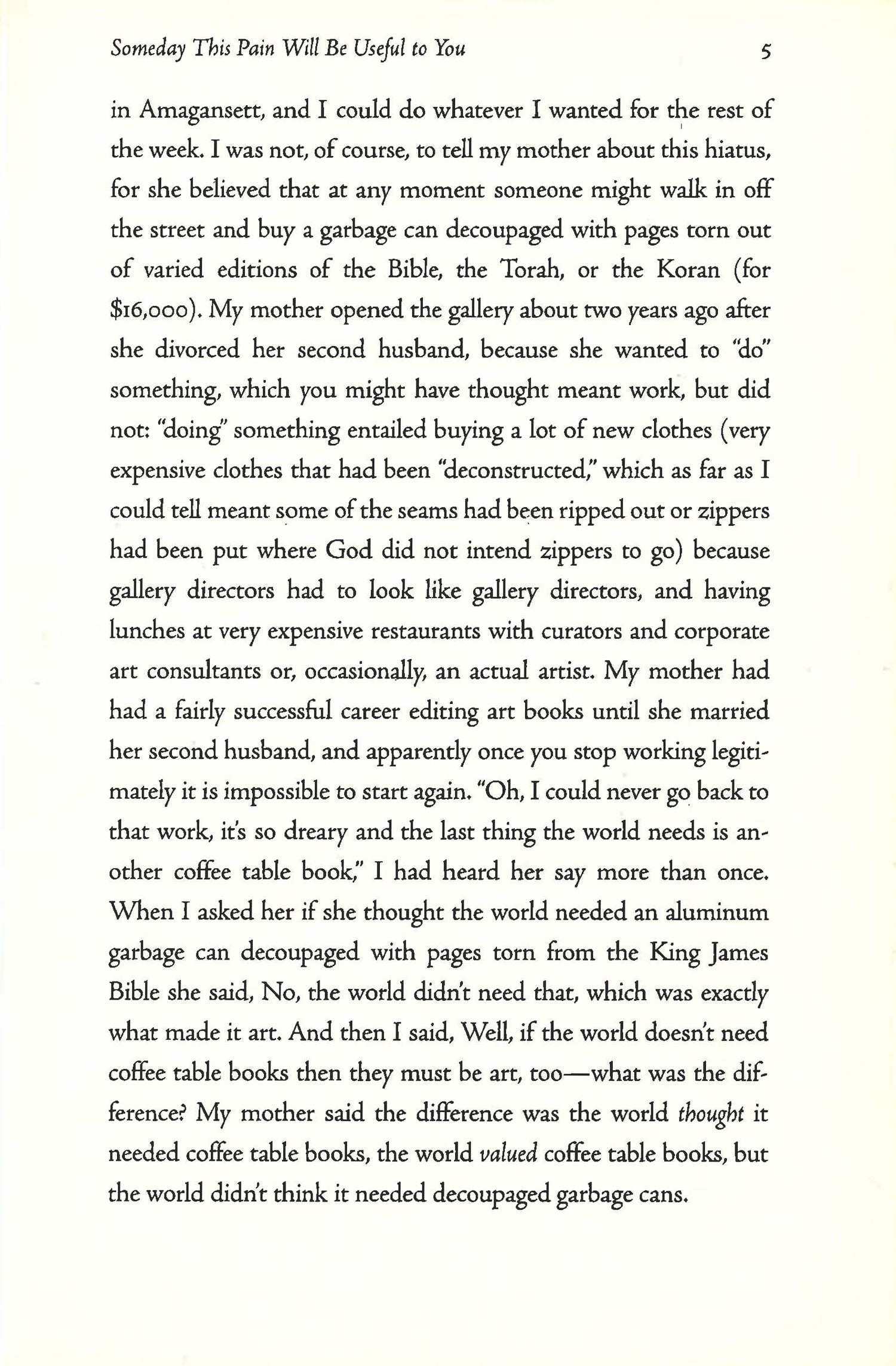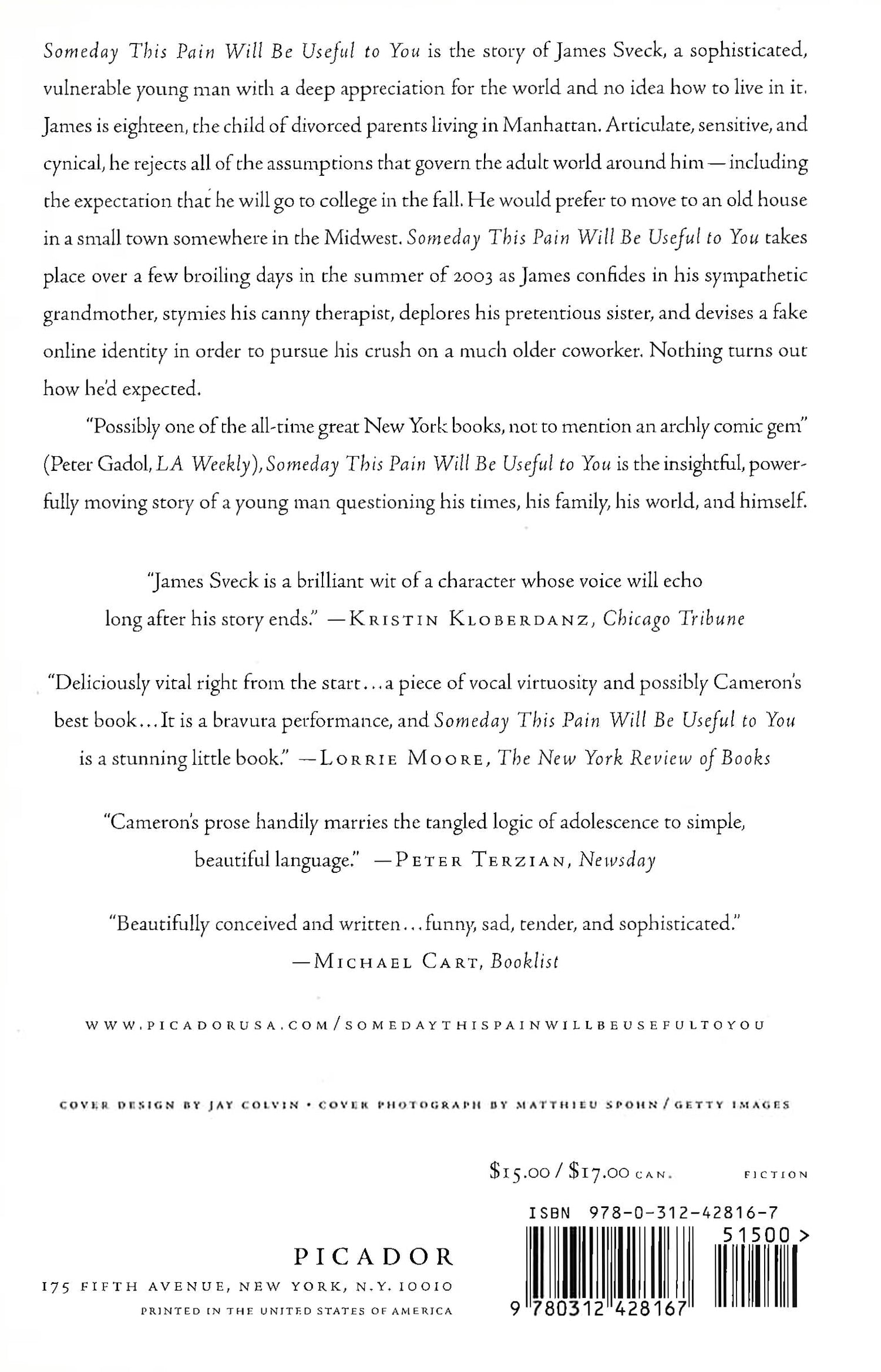 Someday This Pain Will Be Useful to You is the story of James Sveck, a sophisticated, vulnerable young man with a deep appreciation for the world and no idea how to live in it. James is eighteen, the child of divorced parents living in Manhattan. Articulate, sensitive, and cynical, he rejects all of the assumptions that govern the adult world around him-including the expectation that he will go to college in the fall. He would prefer to move to an old house in a small town somewhere in the Midwest. Someday This Pain Will Be Useful to You takes place over a few broiling days in the summer of 2003 as James confides in his sympathetic grandmother, stymies his canny therapist, deplores his pretentious sister, and devises a fake online identity in order to pursue his crush on a much older coworker. Nothing turns out how he'd expected.