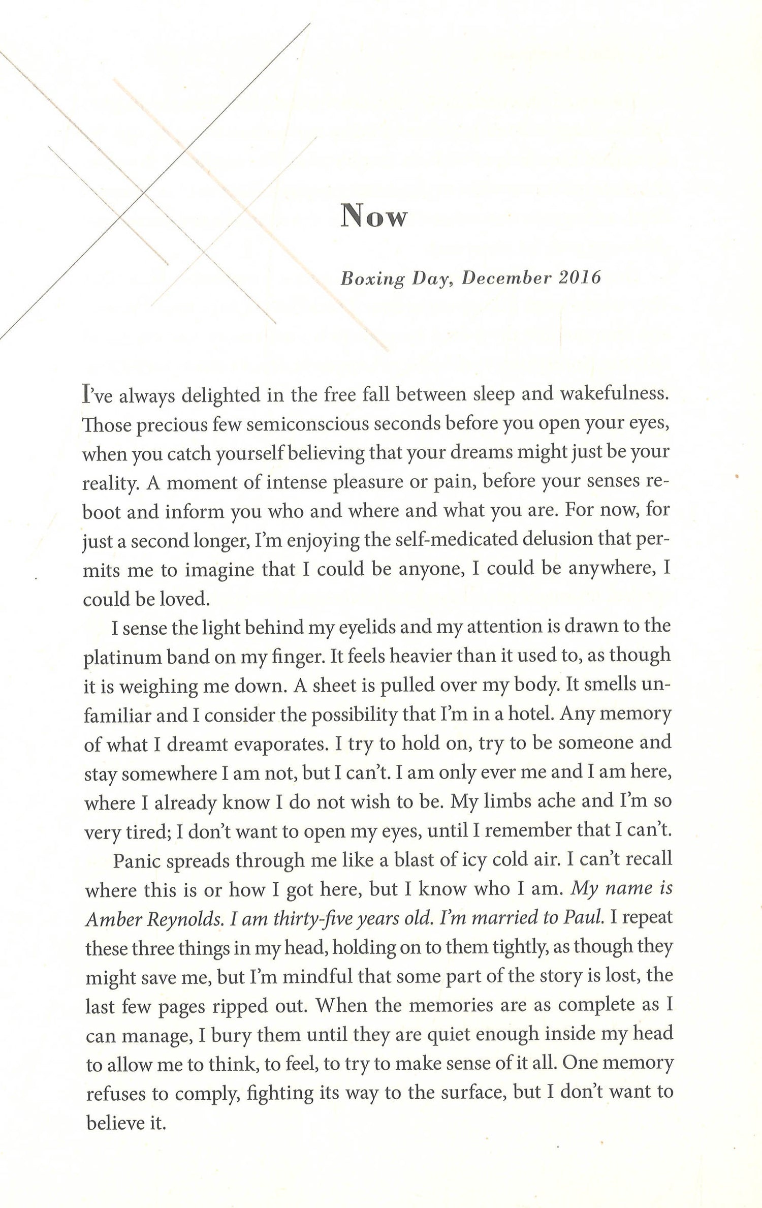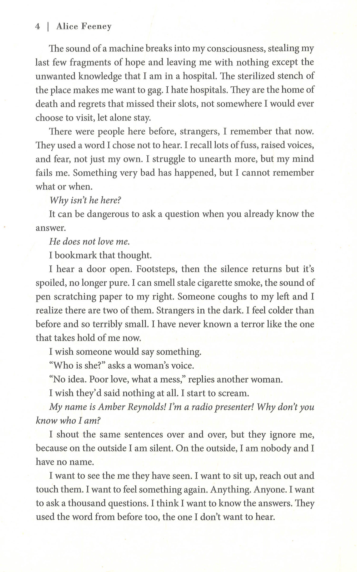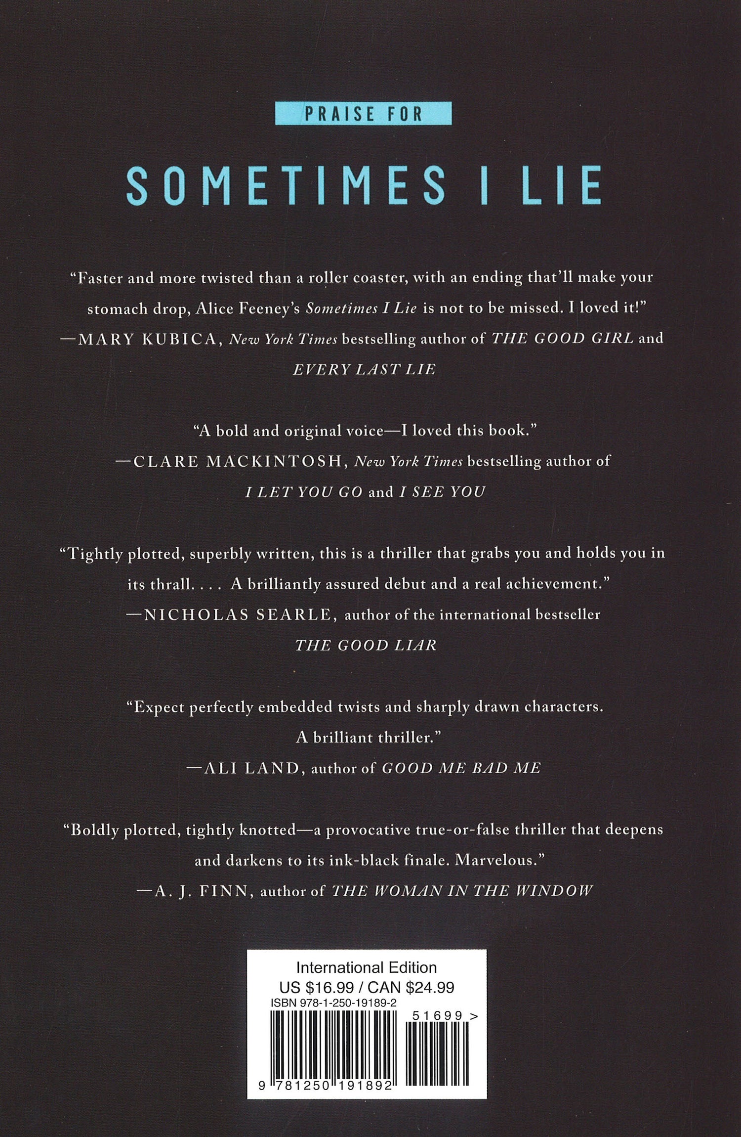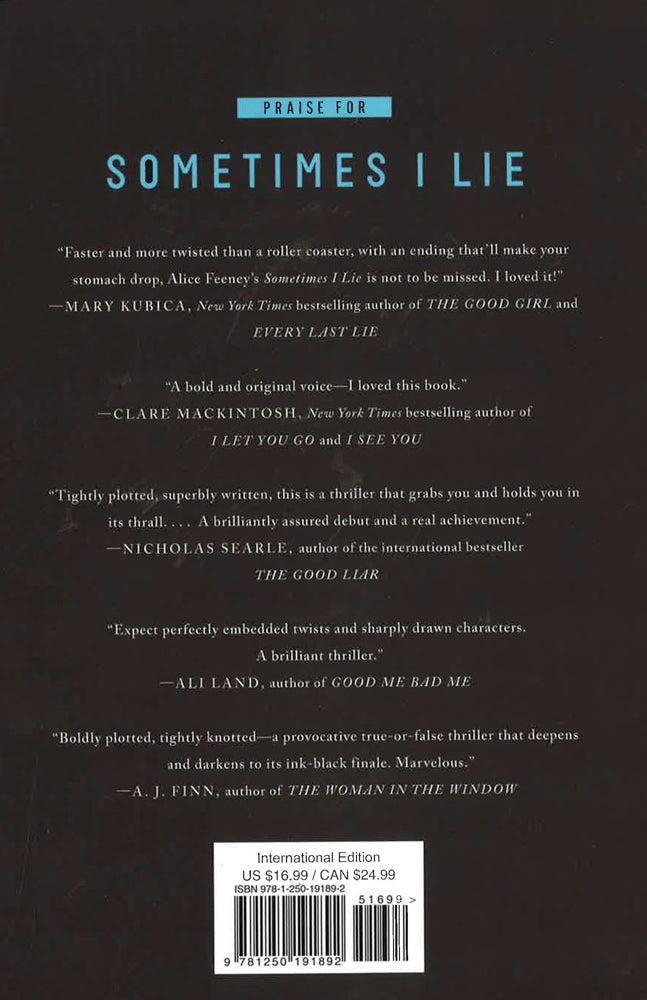 My name is Amber Reynolds. There are three things you should know about me: 1. I’m in a coma. 2. My husband doesn’t love me anymore. 3. Sometimes I lie. Amber wakes up in a hospital. She can’t move. She can’t speak. She can’t open her eyes. She can hear everyone around her, but they have no idea. Amber doesn’t remember what happened, but she has a suspicion her husband had something to do with it. Alternating between her paralyzed present, the week before her accident, and a series of childhood diaries from twenty years ago, this brilliant psychological thriller asks: Is something really a lie if you believe it's the truth?