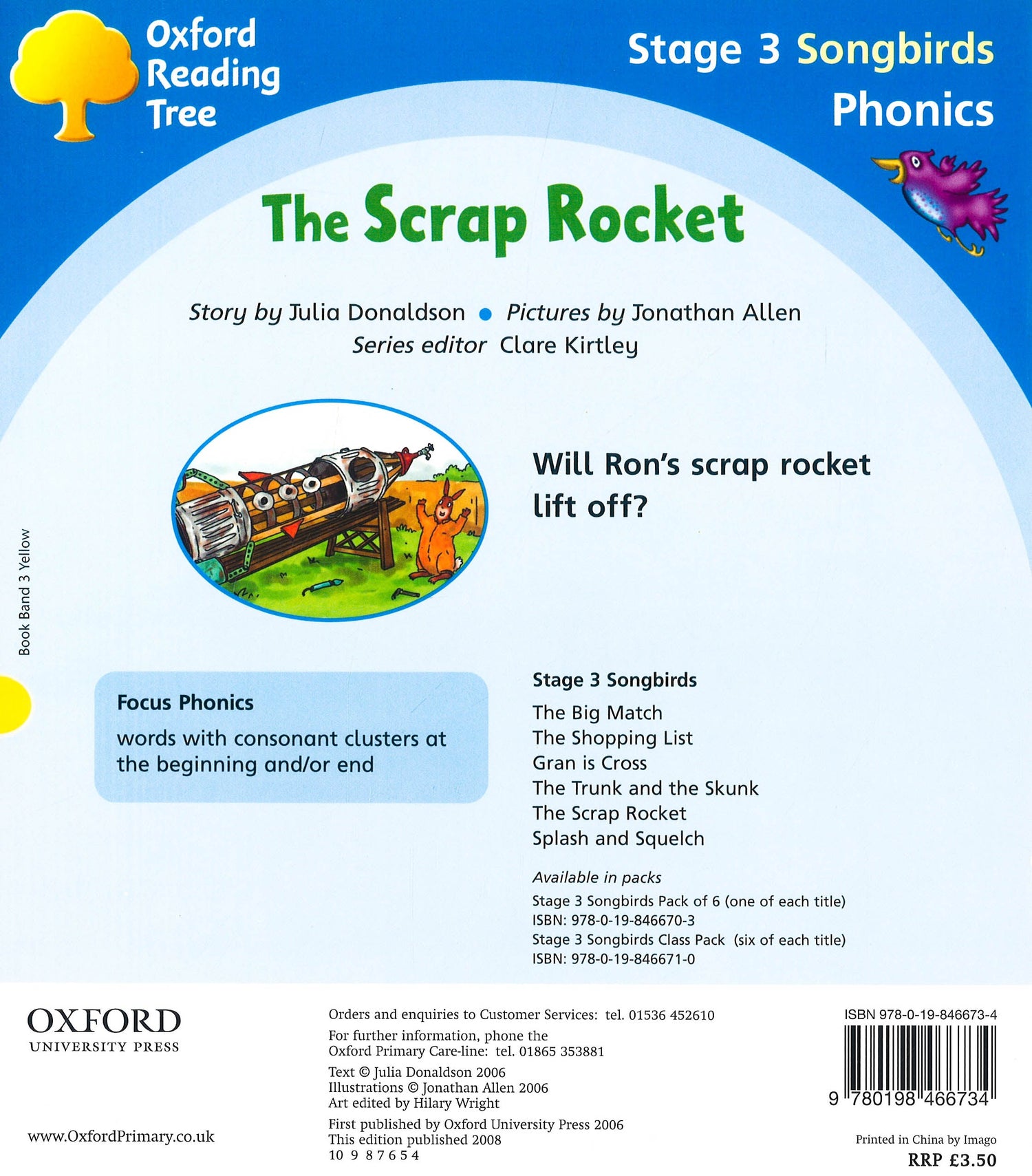 Songbirds Phonics combines real phonic stories with interactive whiteboard software to deliver the requirements for high-quality phonics teaching resources. Written by award-winning Julia Donaldson, these stories provide fun, fully decodable texts with built-in progression help your pupils achieve immediate reading success. They are fully in line with the 2006 Framework and the simple view of reading. Books contain inside cover notes to support children in their reading. Help with childrens reading development is also available at www.oxfordowl.co.uk. This book is also available as part of a mixed pack of 6 different books or a class pack of 36 books of the same ORT level. The books are complemented by eSongbirds interactive whiteboard software which offers a systematic, quality phonics teaching through a multi-sensory approach.