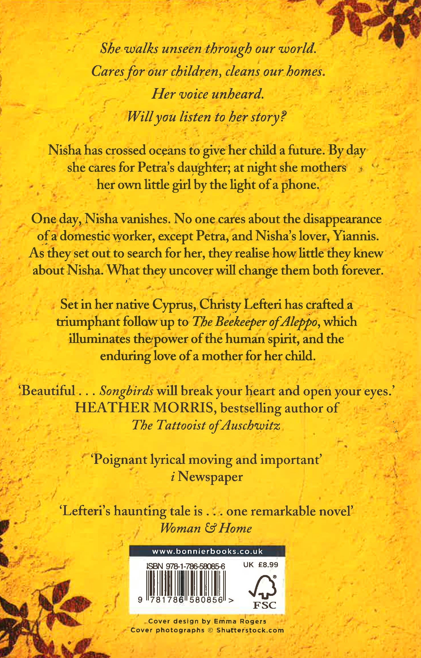 'Will break your heart and open your eyes' Heather Morris, author of The Tattooist of Auschwitz 'I've never read anything quite like Songbirds - a beautifully crafted novel.' Jodi Picoult, bestselling author of Wish You Were Here. Her courage to cross oceans. Her hope for a better life. Her love for a daughter, above all else. Not all tragedies make headlines, not every voice is heard. Nisha has crossed oceans to give her child a future. Now she spends her days caring for someone else's daughter while her own waits for her return, half a world away. For Petra, it is only natural to hire a domestic worker to keep her house clean and her family fed. Their lives have nothing in common, except the love they feel for their daughters. Then one day, Nisha vanishes. No one cares about the disappearance of a foreign domestic worker, except Petra and Nisha's secret lover, Yiannis, the only connection to her daughter back in Sri Lanka. As Petra and Yiannis desperately search for Nisha, they realise how little they knew about her. What they uncover will change them both forever. Inspired by true stories of love and loss, hope and refuge, this evocative masterpiece from the million-copy bestselling author of The Beekeeper of Aleppo, Christy Lefteri, is an illuminating story of the power of the human spirit, and the enduring love of a mother for her child, that will stay with you long after you finish reading. Praise for Christy Lefteri: 'This thought-provoking novel of love loss and redemption is thoroughly sublime.' Caroline Montague 'Lefteri is an astonishing weaver of stories.' Daljit Nagra ' . . . broke my heart and kept me turning the pages of her gorgeous novel well into the night.' Alka Joshi, NYT-bestselling author of The Henna Artist and The Secret Keeper of Jaipur 'Christy Lefteri has crafted a beautiful novel, intelligent, thoughtful, and relevant.' Benjamin Zephaniah on The Beekeeper of Aleppo ' . . . it's impossible not to be moved by Lefteri's plea for humanity and perhaps inspired too.' Observer, on The Beekeeper of Aleppo 'Courageous, proactive, haunting.' Heather Morris, on The Beekeeper of Aleppo